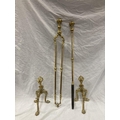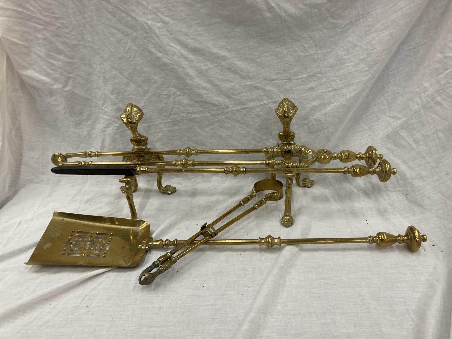 A PAIR OF BRASS FIRE DOGS WITH BALL AND CLAW DECORATION PLUS A BRASS COMPANION SET