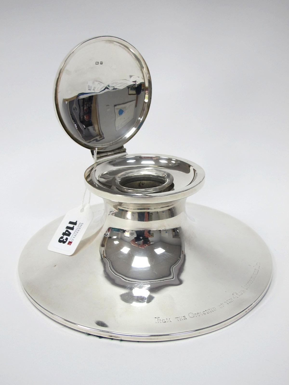 A Large Hallmarked Silver Capstan Inkwell, (marks rubbed / Birmingham) bearing military presentation inscription "From the Officers of the 4th Res. Leicestershire Regt", with insignia to hinged lid (worn/rubbed), base 20.5cm diameter.