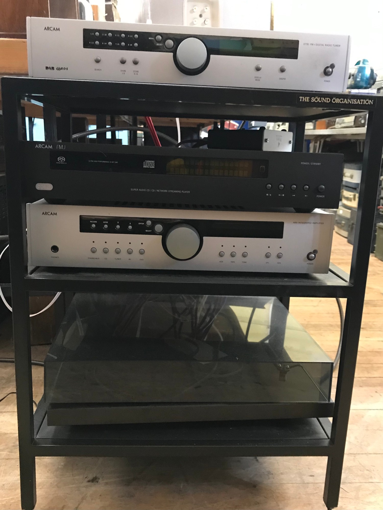 An Arcam stereo and a pair of speakers on stands