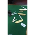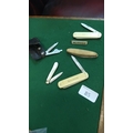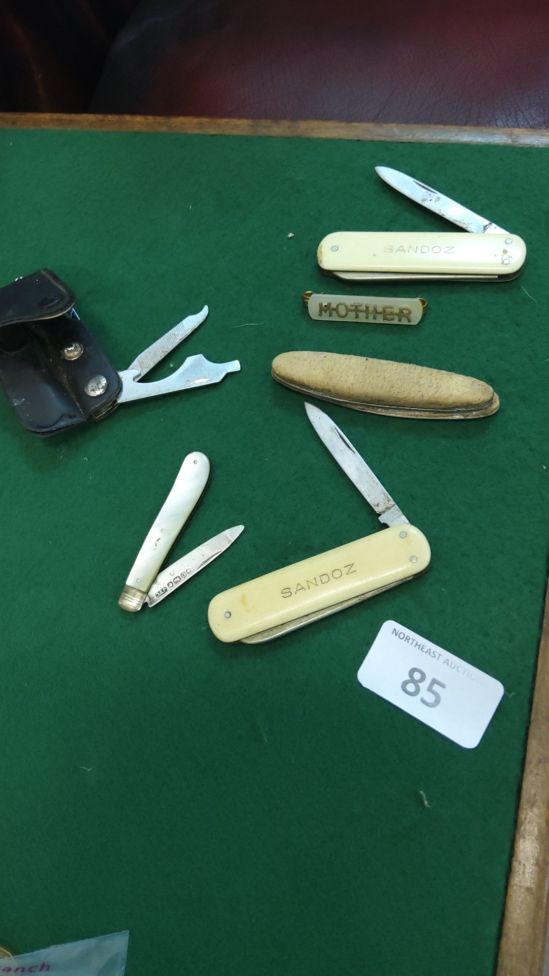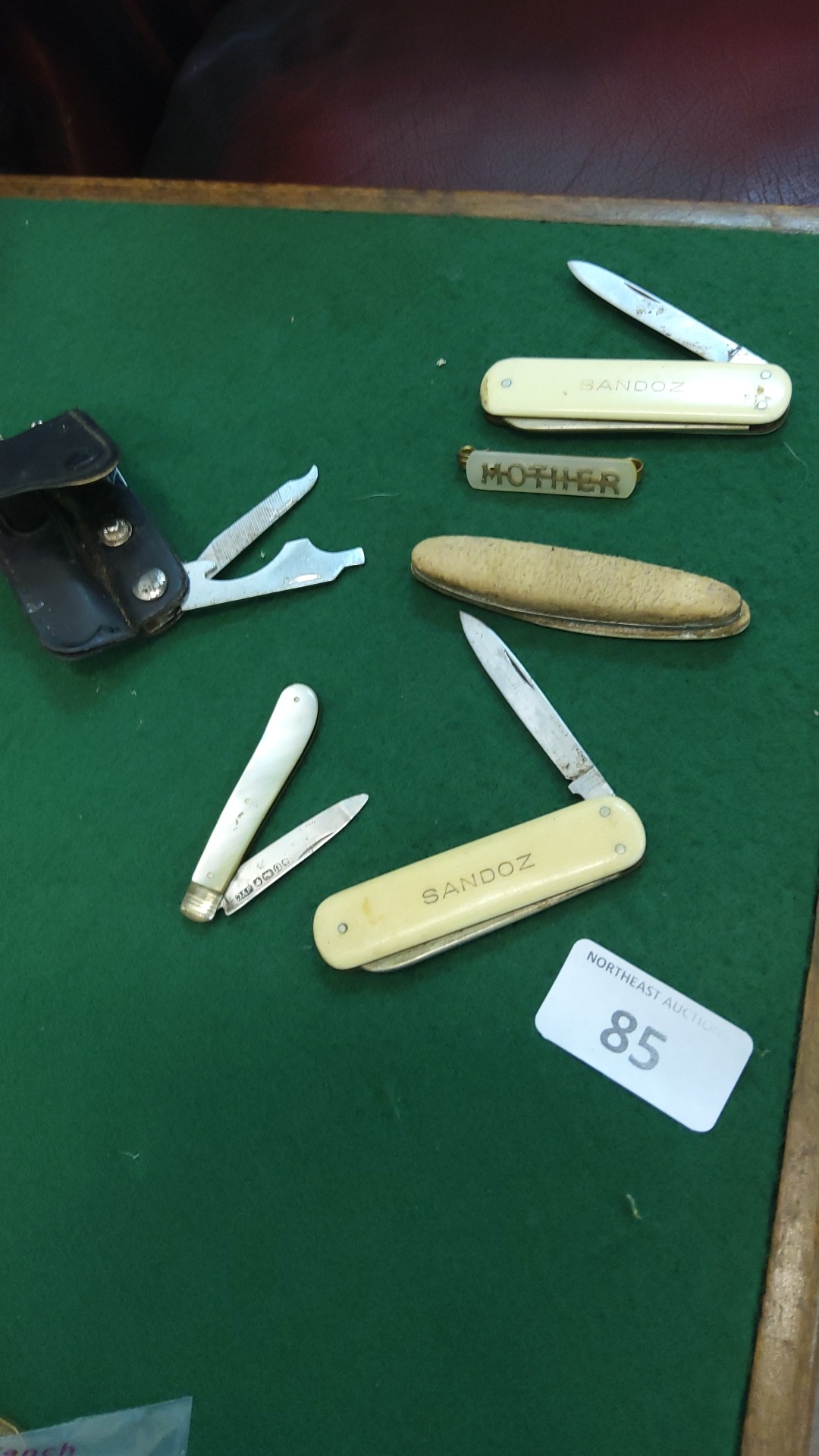 A small group of pocket knives, including two Sandoz promotional penknives with cream plastic scales, a mother-of-pearl two-blade penknife, a further penknife with tan scales, and a folding multi-tool in a leather pouch.