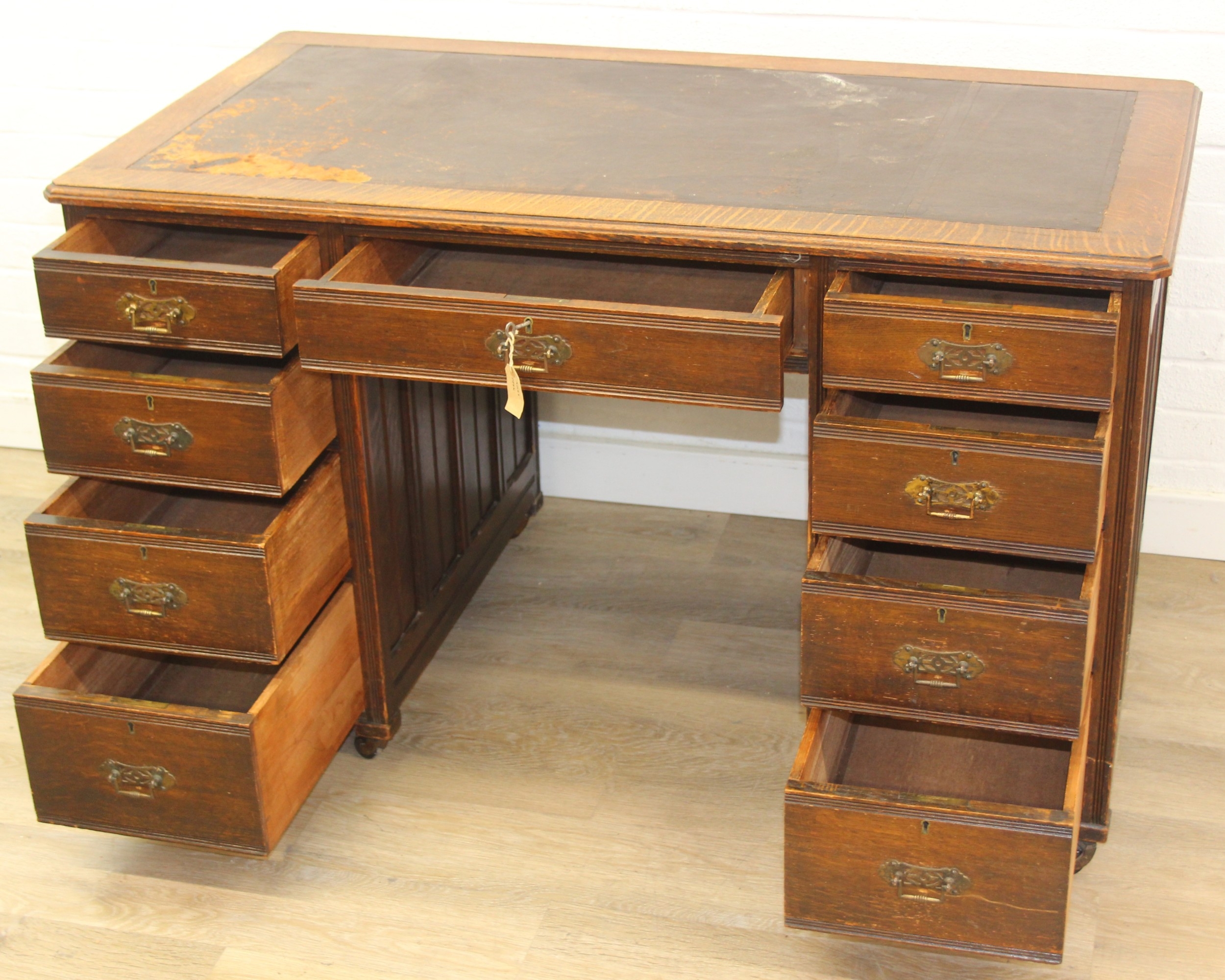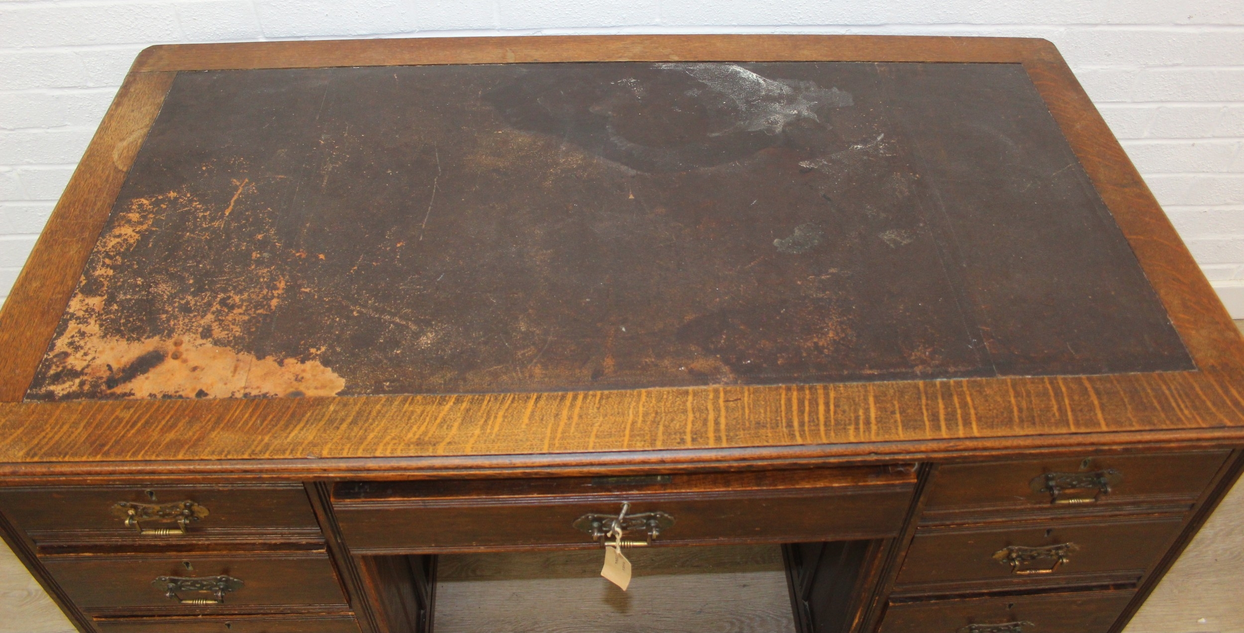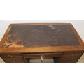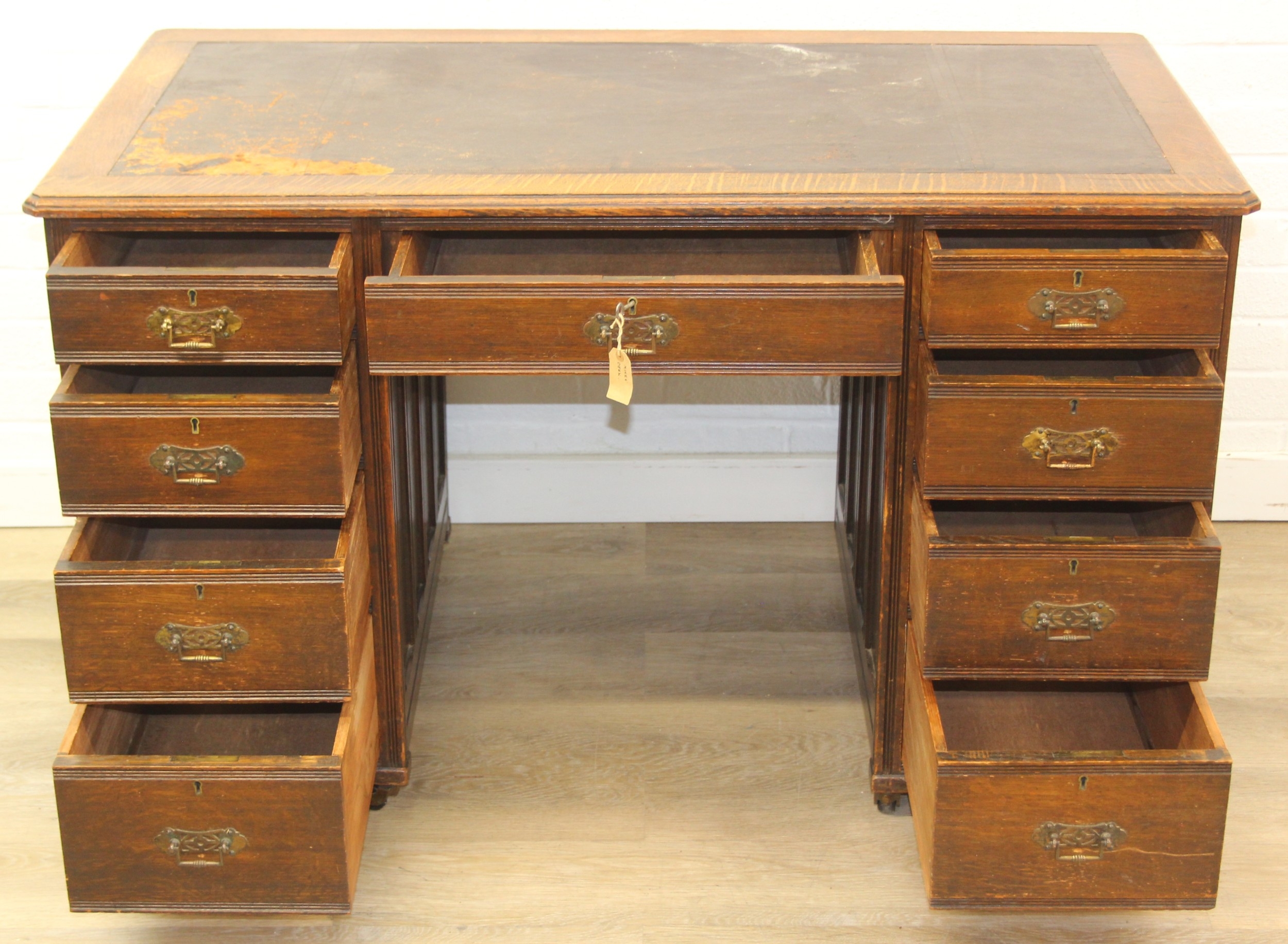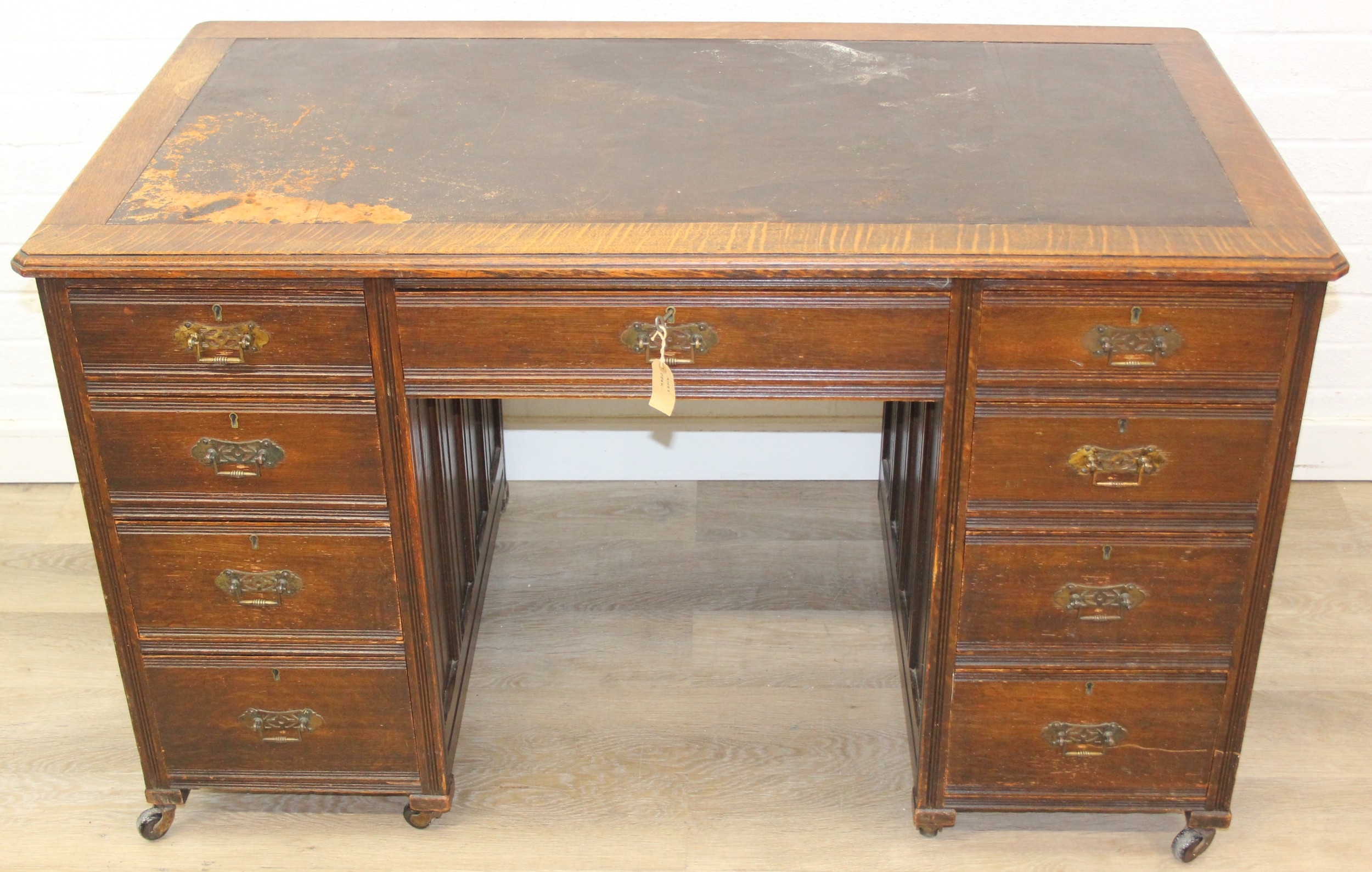 A vintage oak desk with inset distressed leather top, nine drawers with brass handles, 123cm x 66cm x 74cm