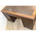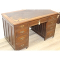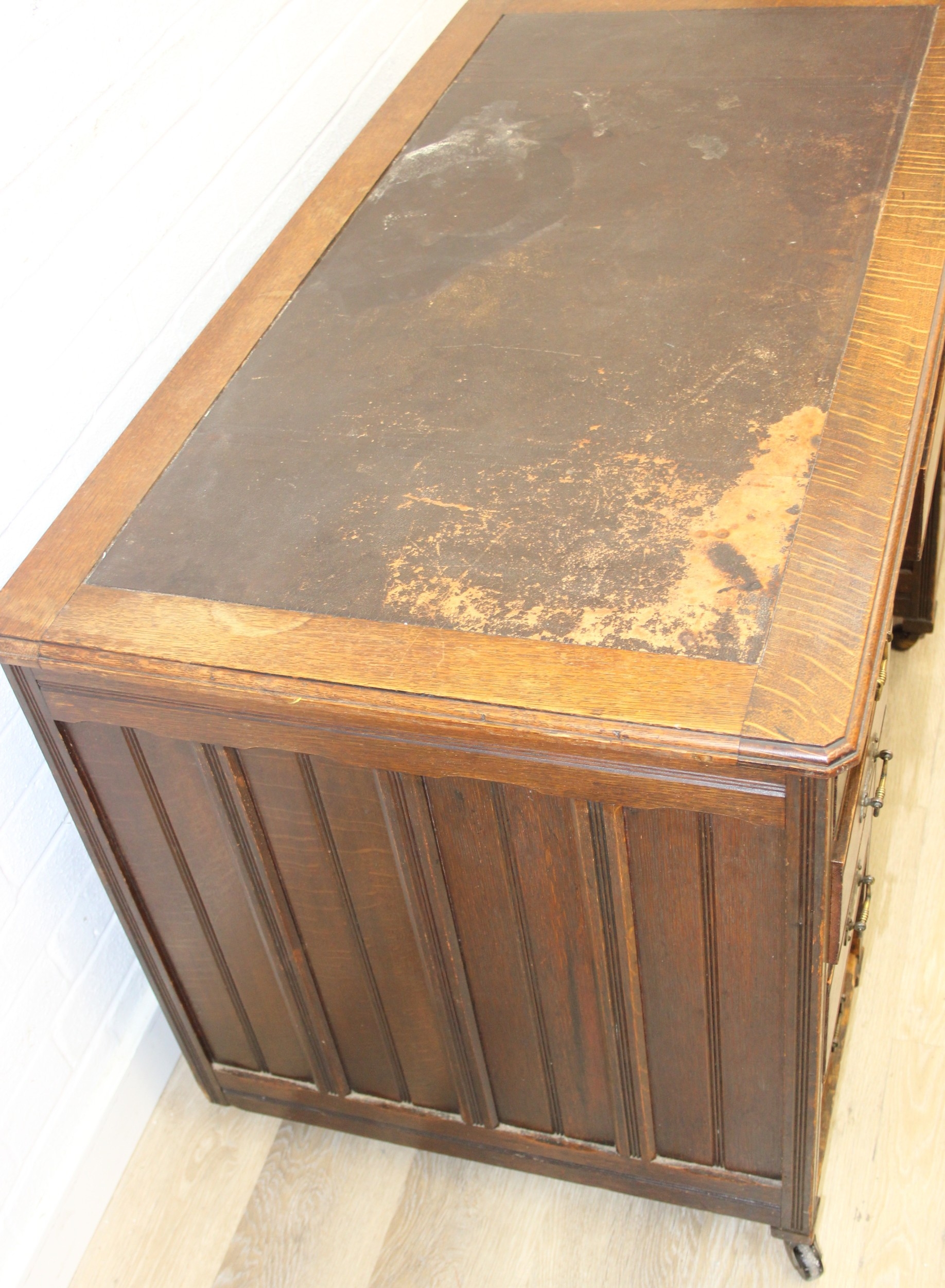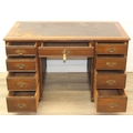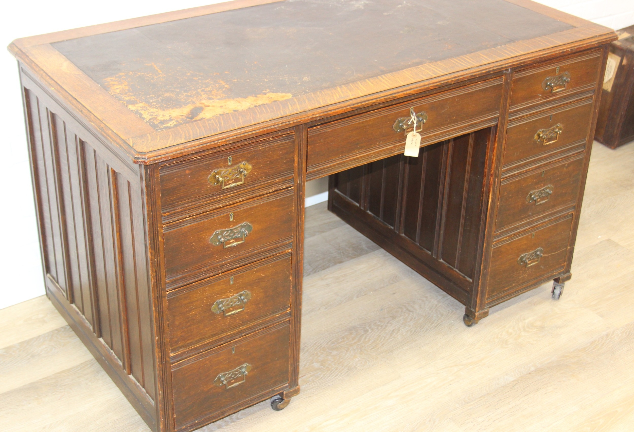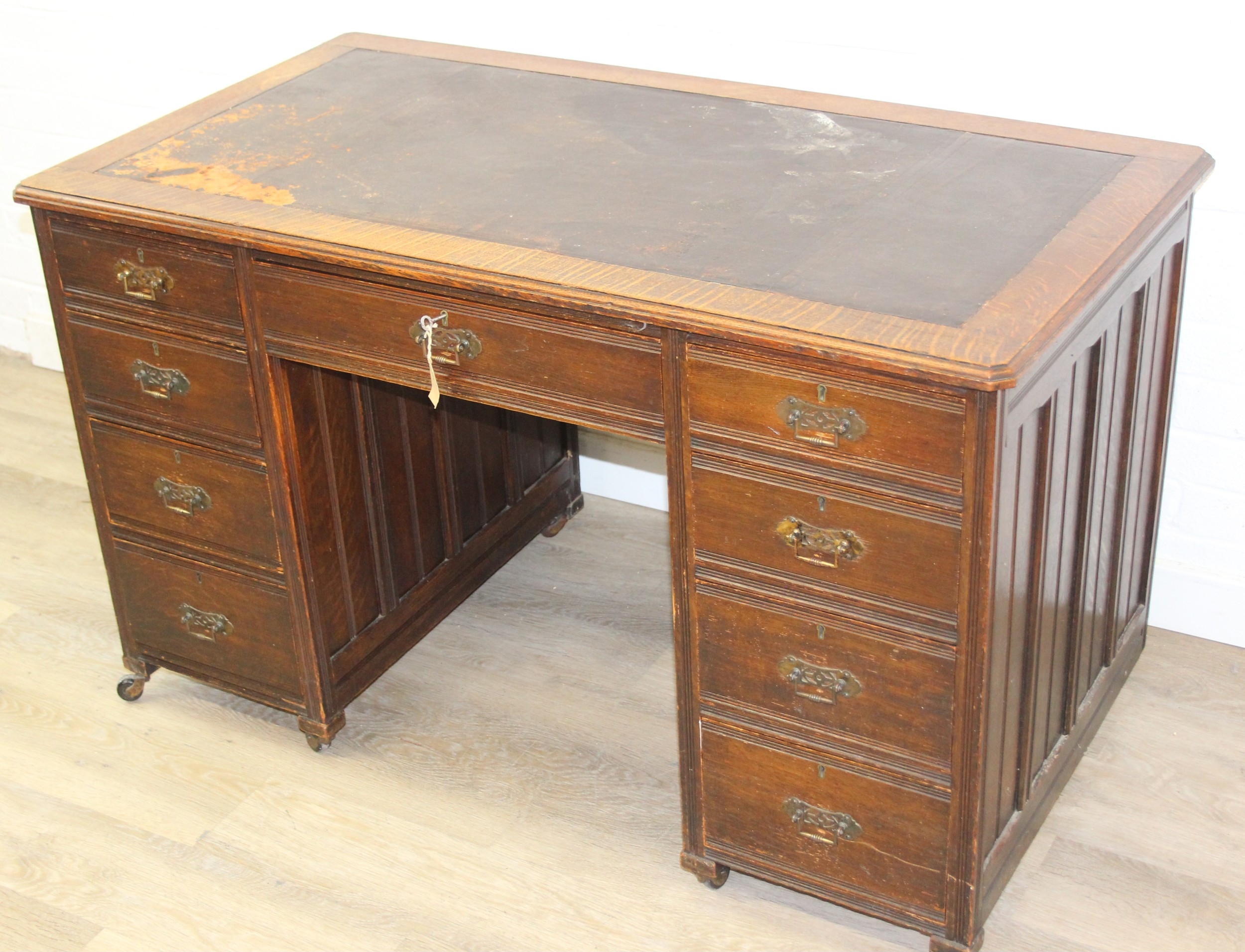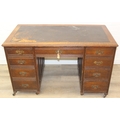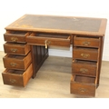 A vintage oak desk with inset distressed leather top, nine drawers with brass handles, 123cm x 66cm x 74cm