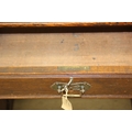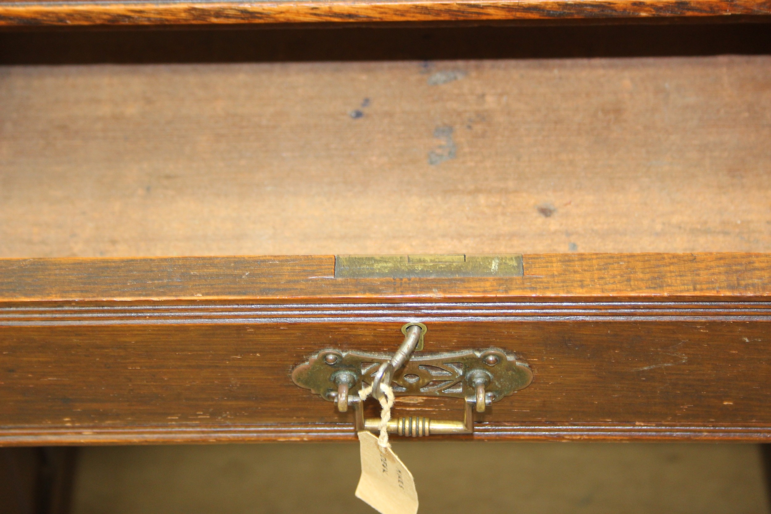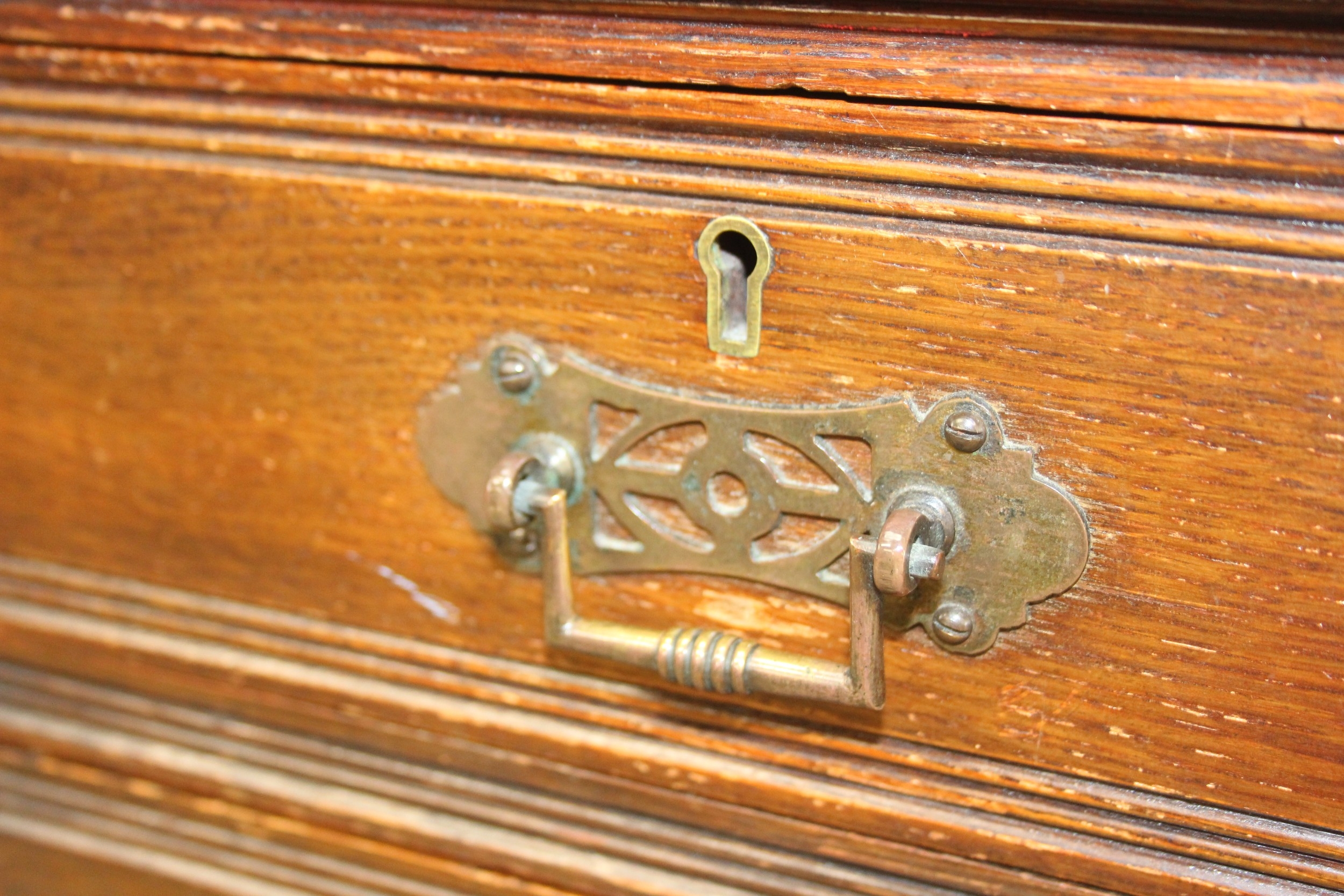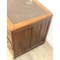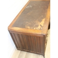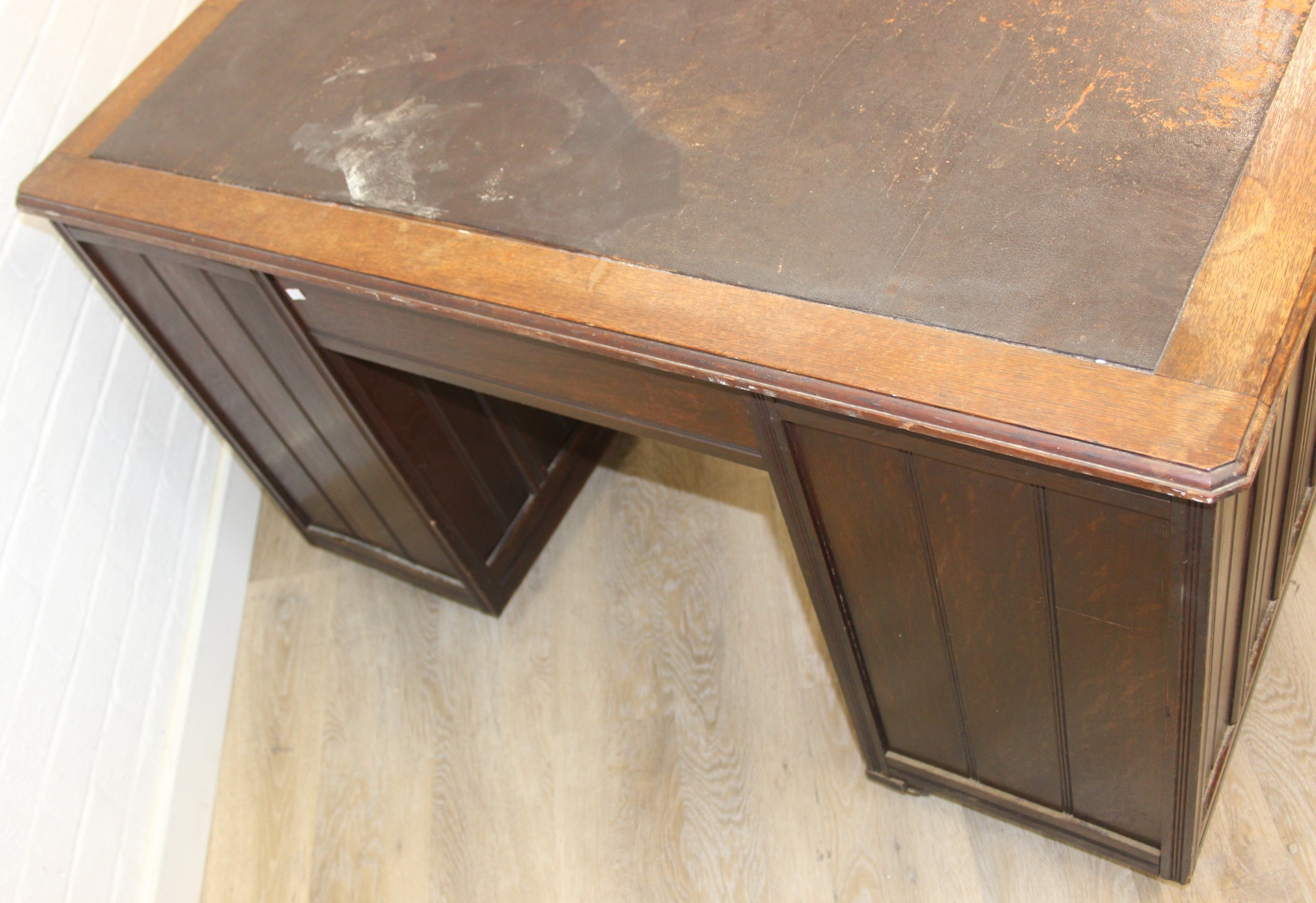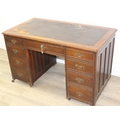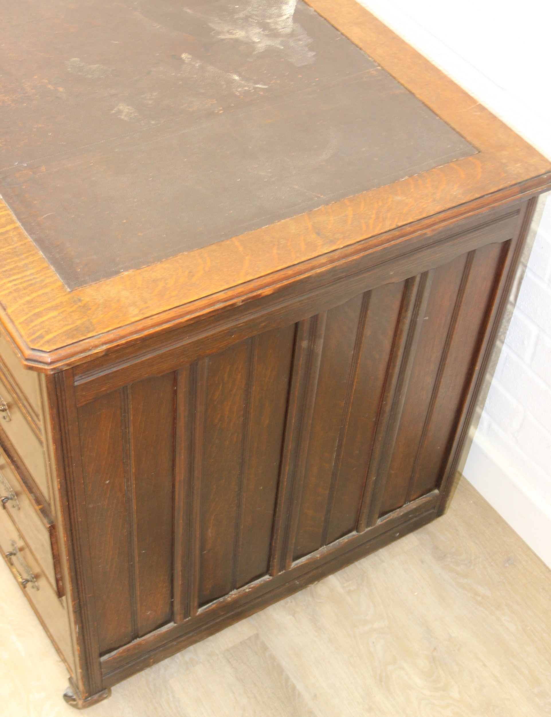 A vintage oak desk with inset distressed leather top, nine drawers with brass handles, 123cm x 66cm x 74cm