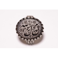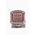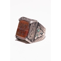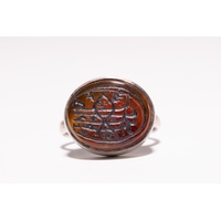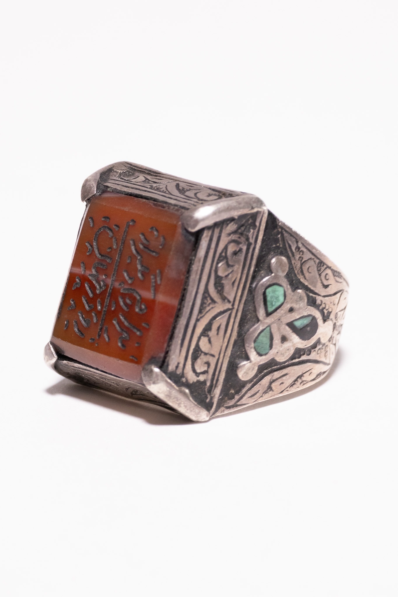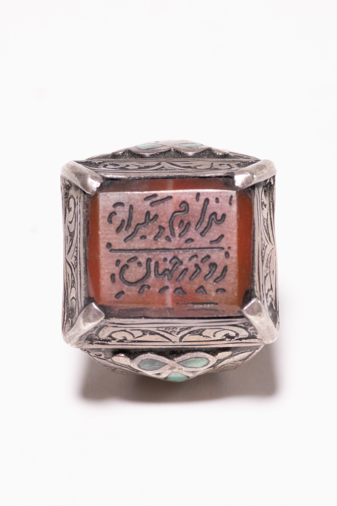 AN ISLAMIC SILVER AND CARNELIAN SIGNET RING WITH CALLIGRAPHIC INSCRIPTION. - The central stone is set within a raised four-prong mount and is deeply engraved with two registers of Persian Nasta'liq script separated by a horizontal line. The top register reads ŨŮâ ŧŮ⦠ŨŰÅéűŧŮâ (In the name of the Infinite) and the bottom register reads űŮ�ÅË ÅŻű ŬŮâ¡Å§Ůâ (Day in the world), suggesting a poetic or religious invocation. The metal setting is decorated with raised foliate and scrollwork motifs throughout the bezel and shoulders. Each shoulder is further embellished with a trefoil arrangement of three green stone inlays, possibly turquoise or glass paste.