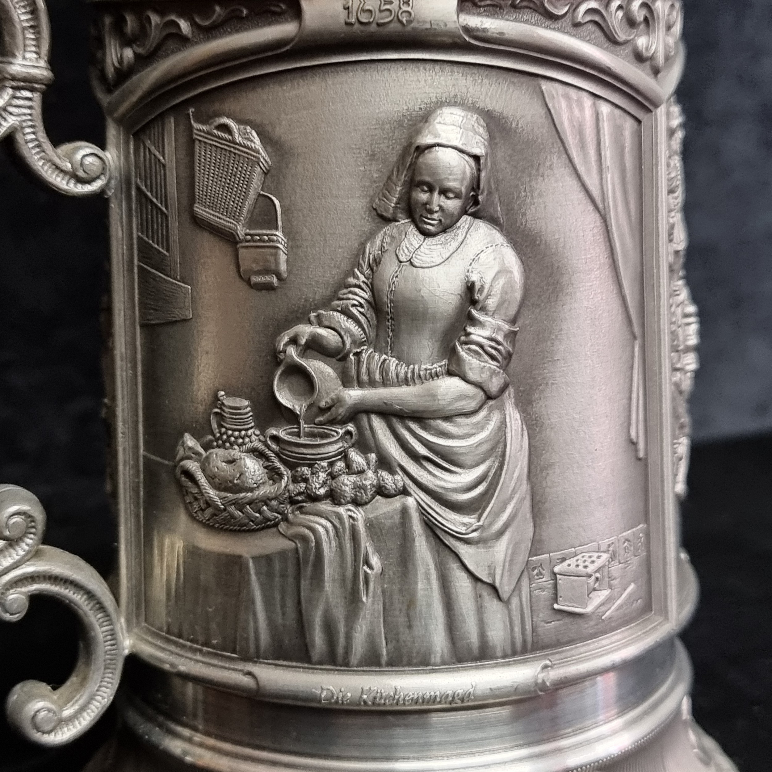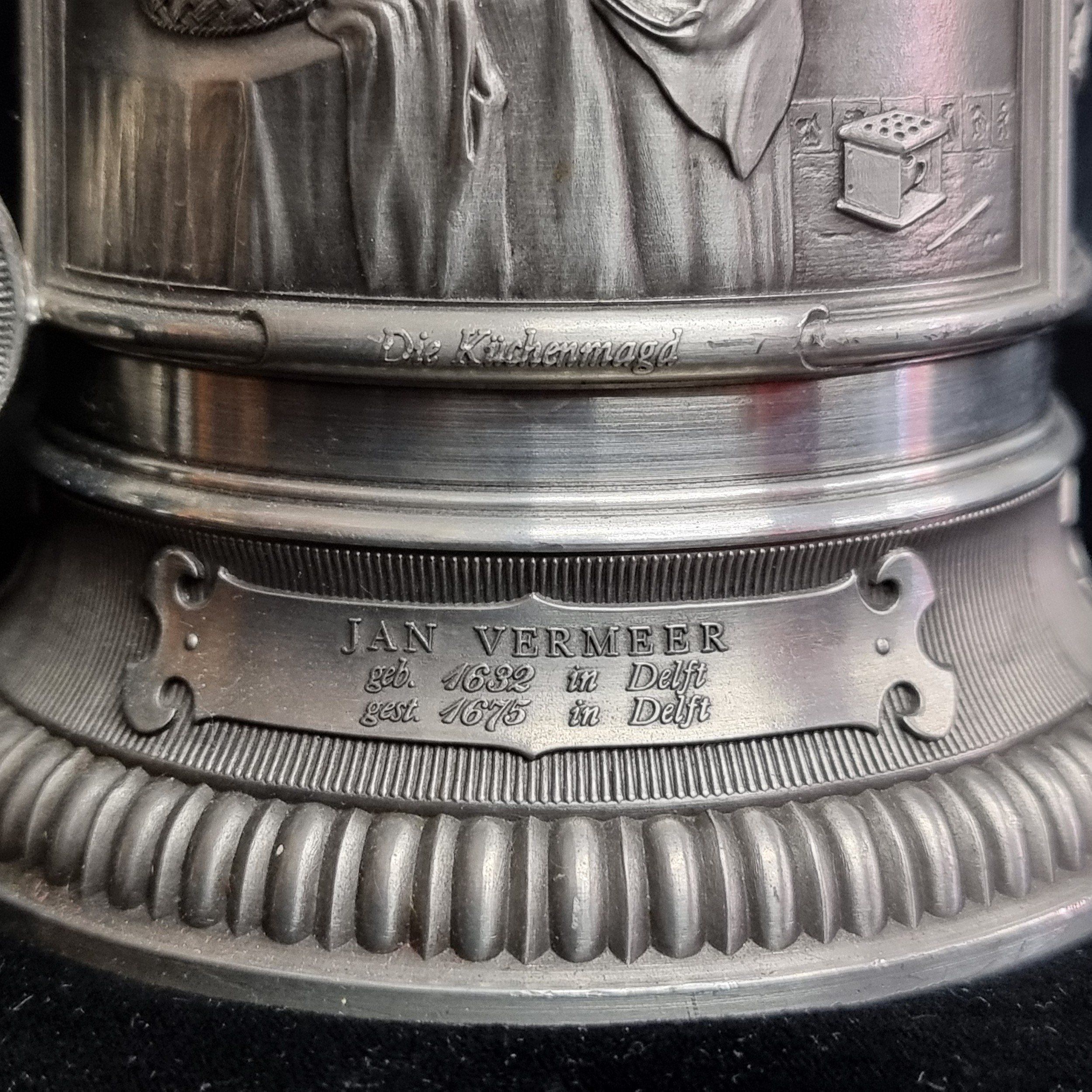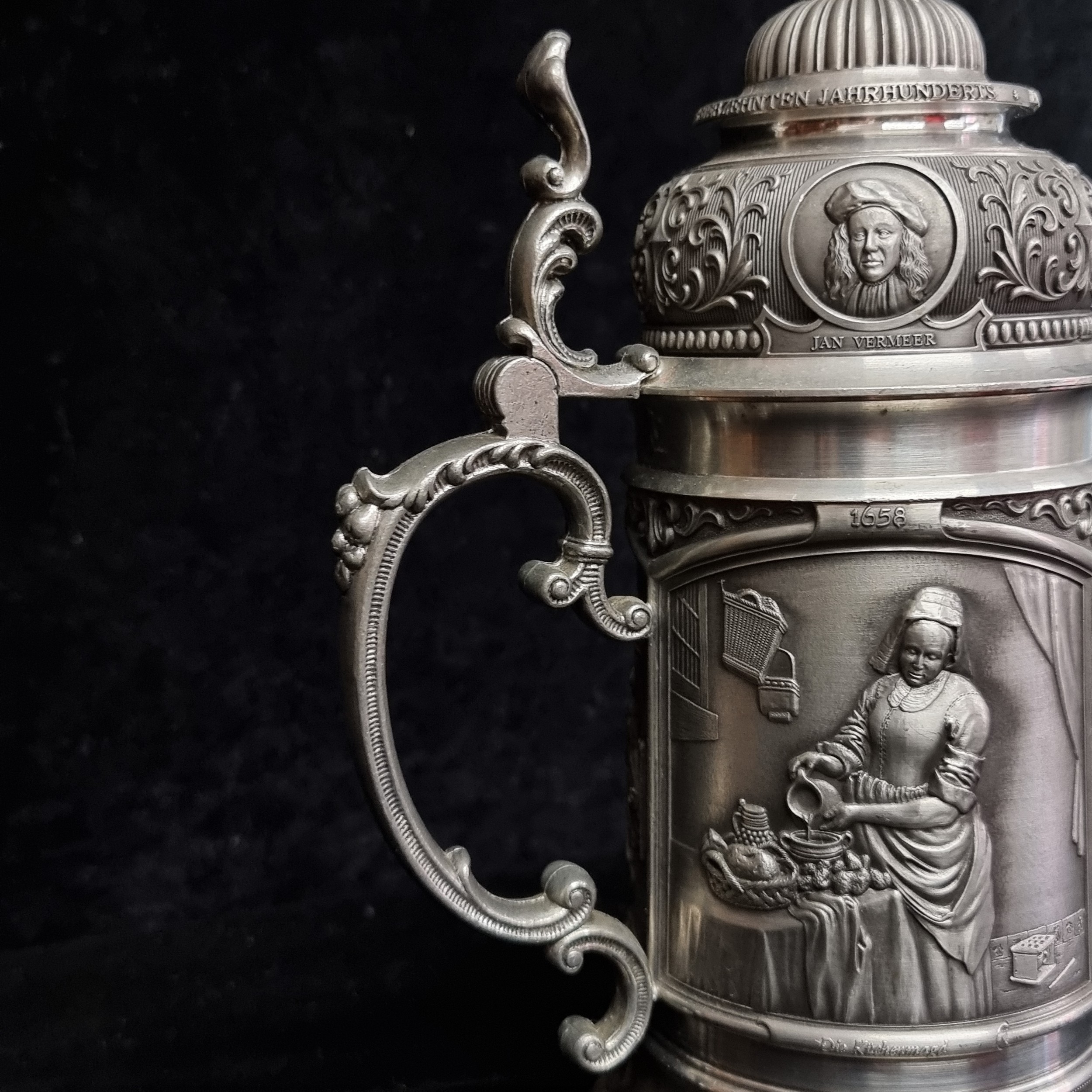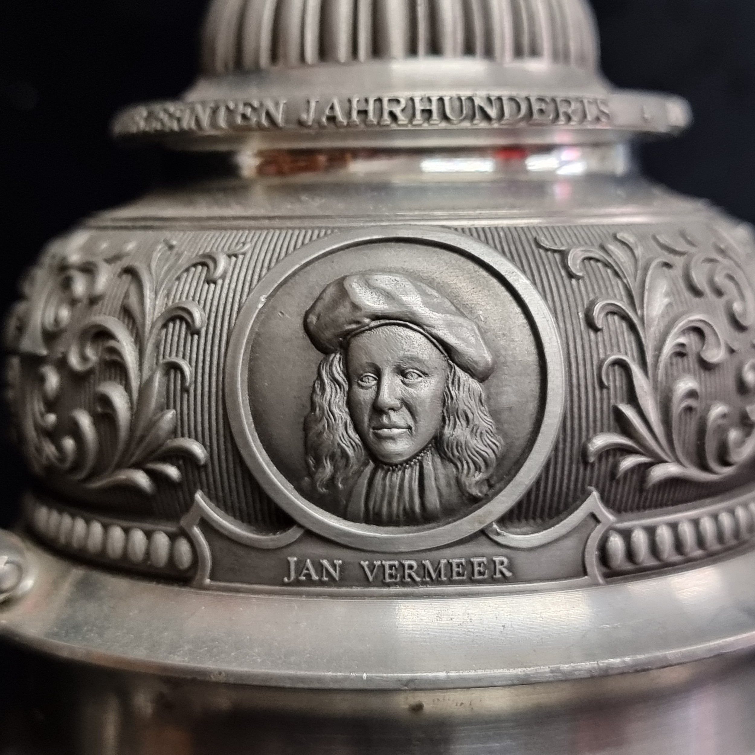 An Authentic German Artina SKS Pewter Beer Stein with scenes from old master's paintings including Vermeer, Rembrandt and Steen. Lid also features portraits of the artists.