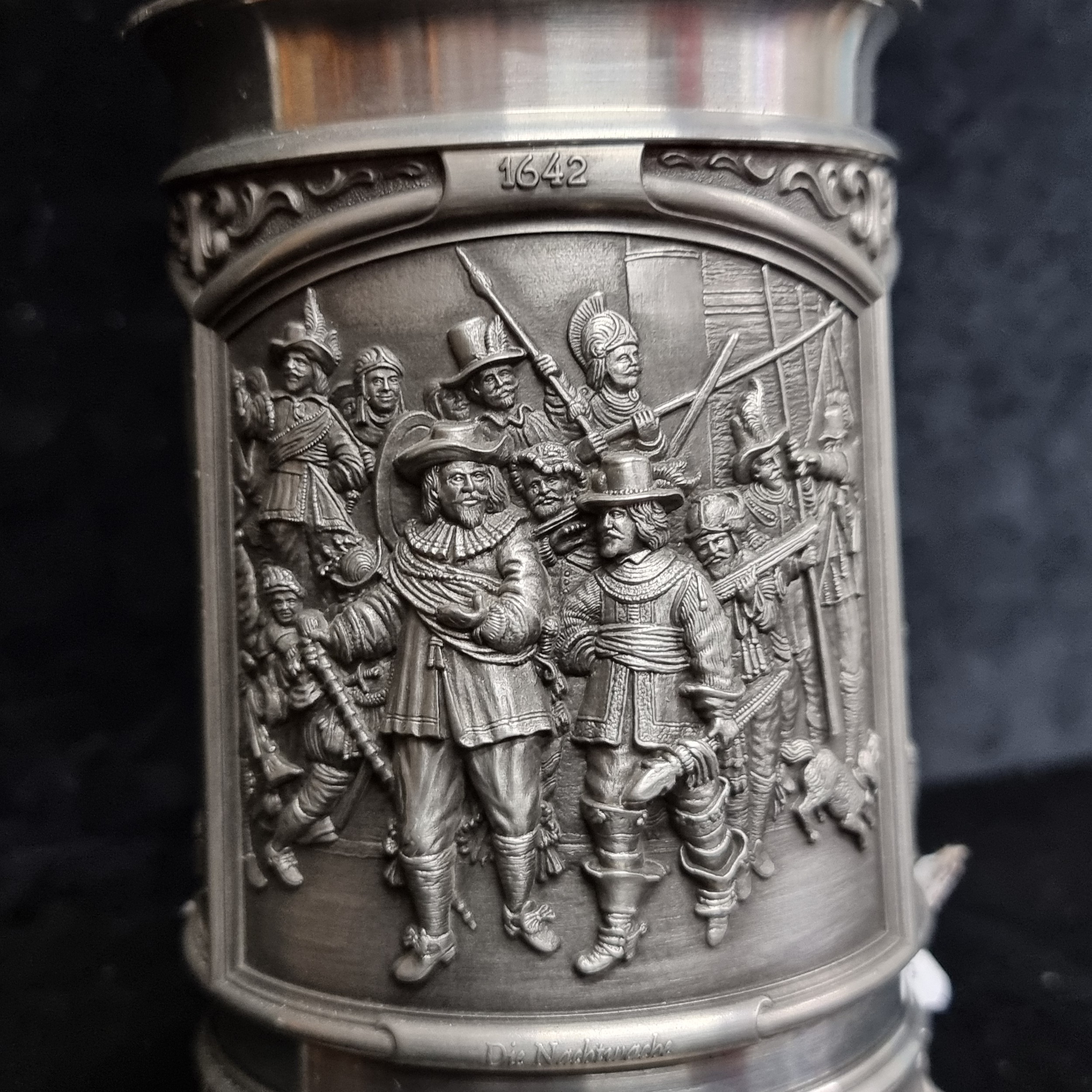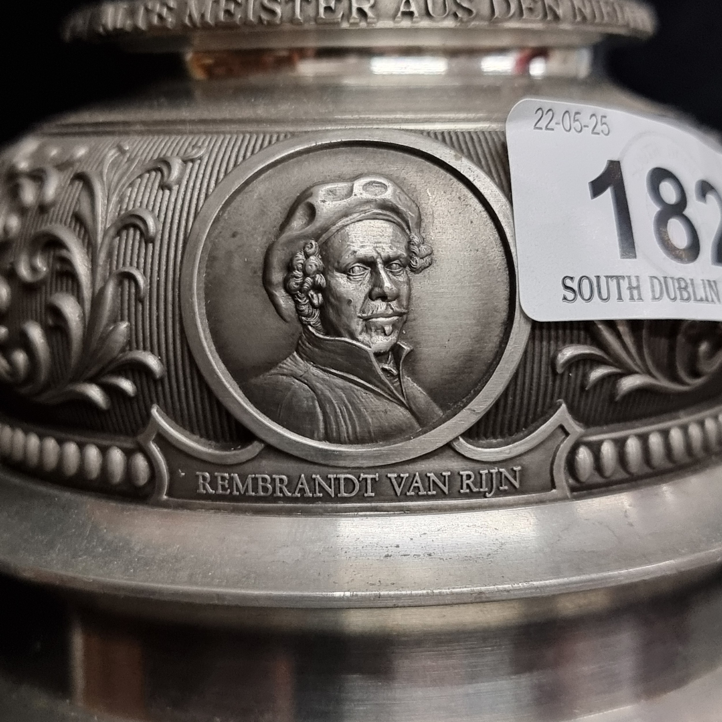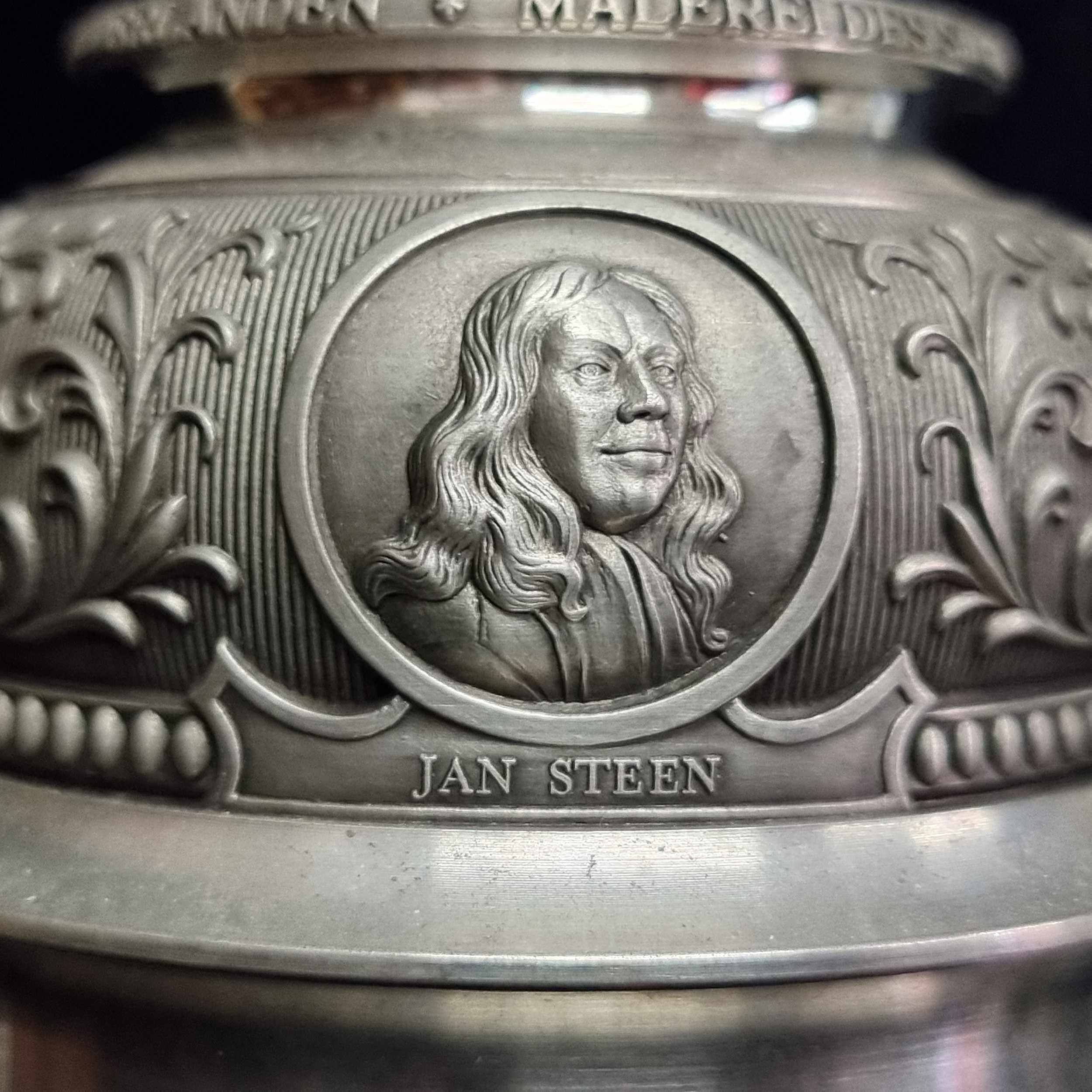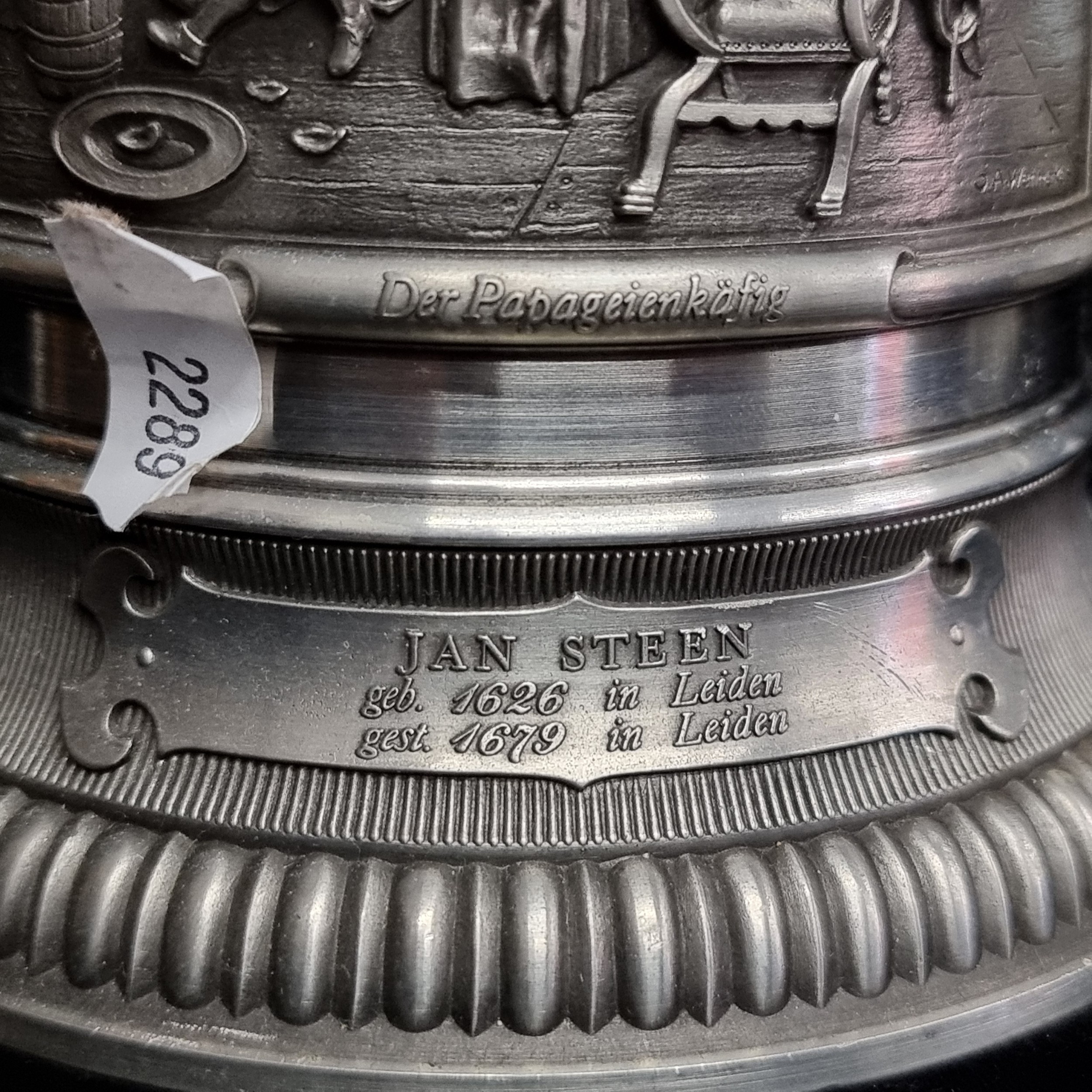 An Authentic German Artina SKS Pewter Beer Stein with scenes from old master's paintings including Vermeer, Rembrandt and Steen. Lid also features portraits of the artists.