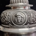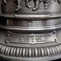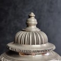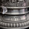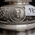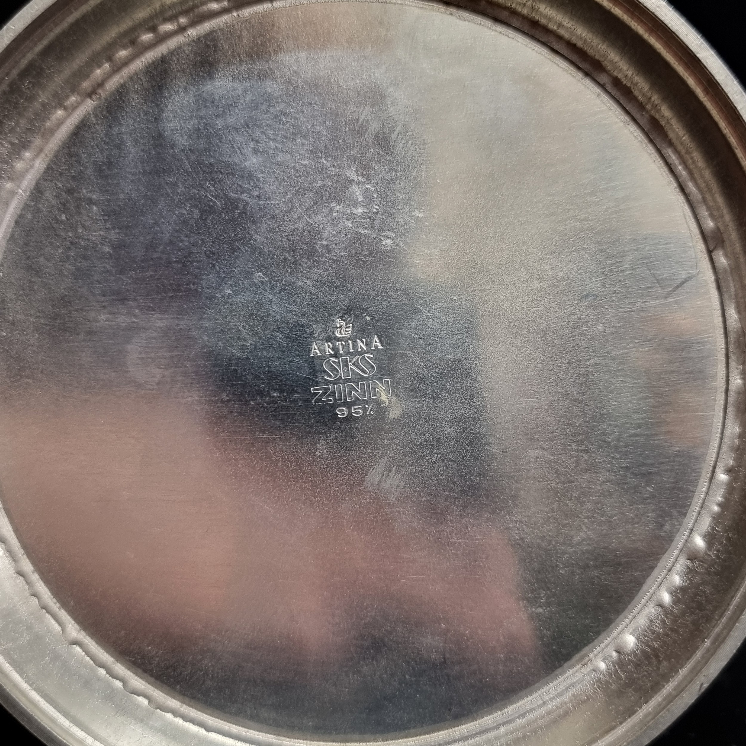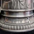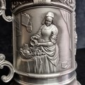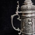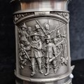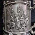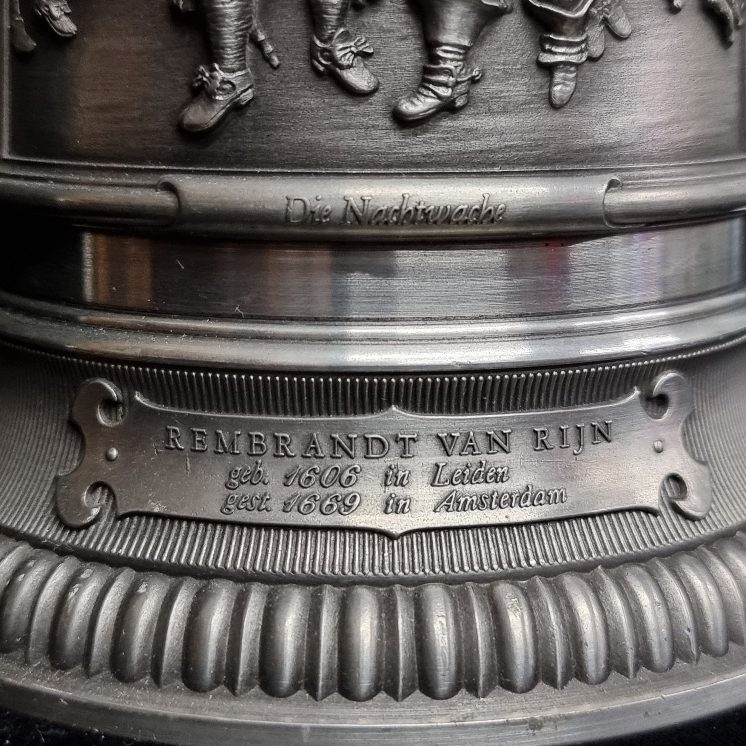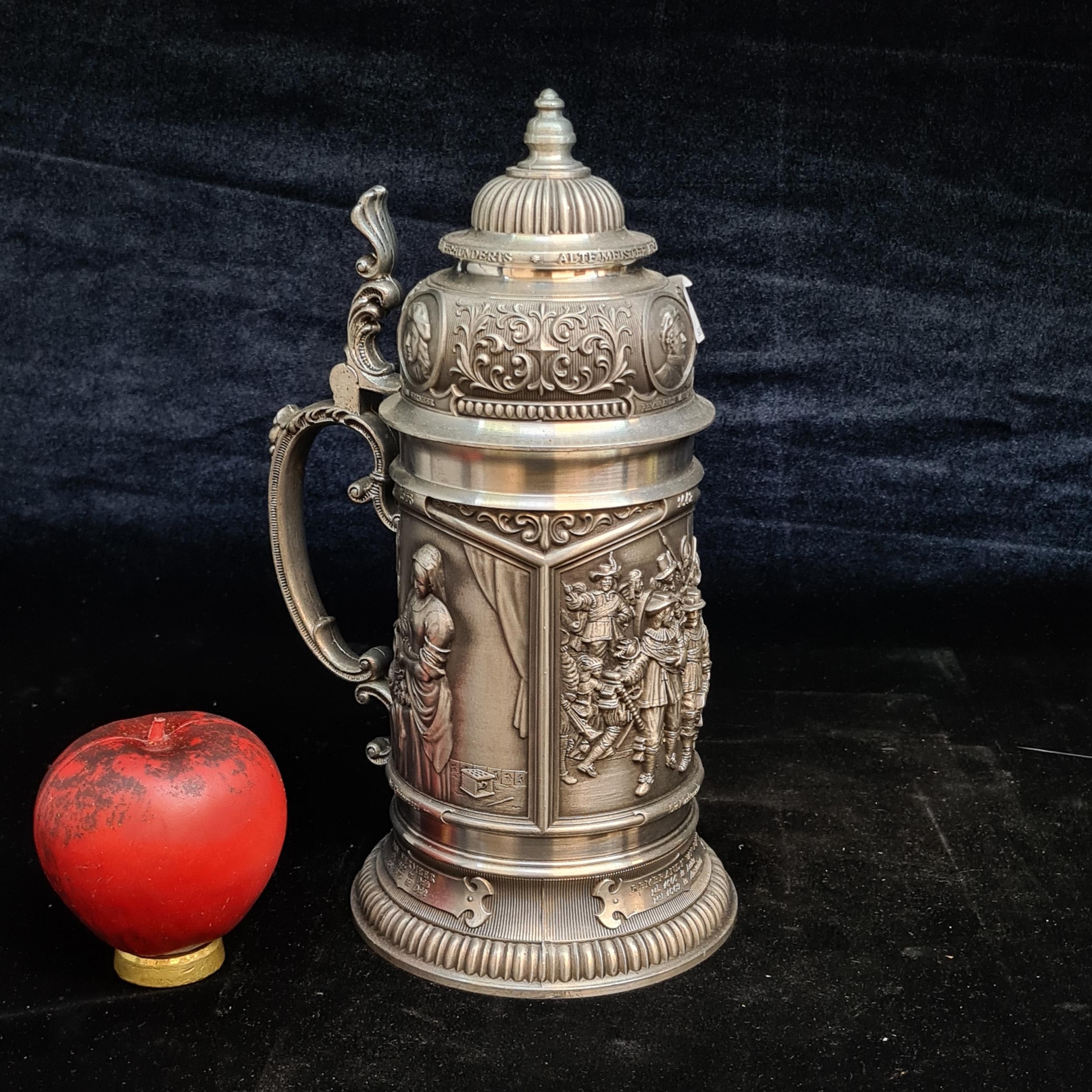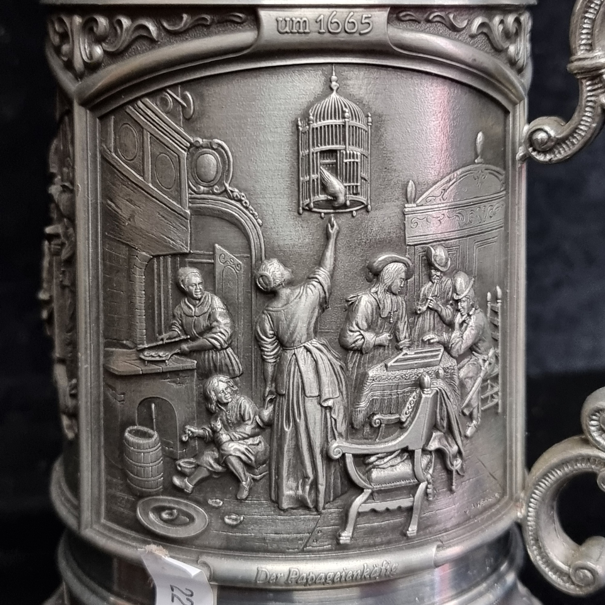 An Authentic German Artina SKS Pewter Beer Stein with scenes from old master's paintings including Vermeer, Rembrandt and Steen. Lid also features portraits of the artists.