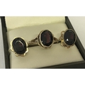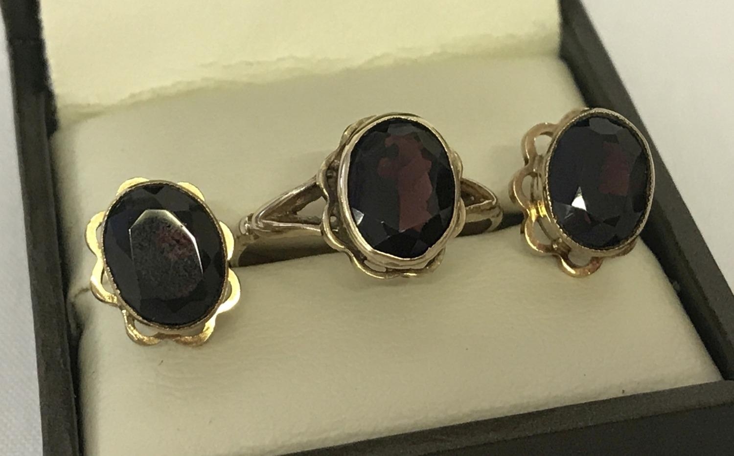 A 9ct gold garnet set dress ring and matching stud style earrings. Oval cut garnets set in scallop edge 9ct gold mounts. Total carat weight to ring 1.5ct, earrings total 3ct. Ring marked 9ct with makers initials. Both earrings fully hallmarked with makers mark. One butterfly back missing. Total weight approx. 5.9g. Ring size N.