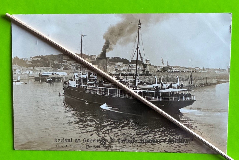 Real photographic postcard by Thomas Bramley Guernsey, Arrival at Guernsey of Turbine Steamer SARNIA.