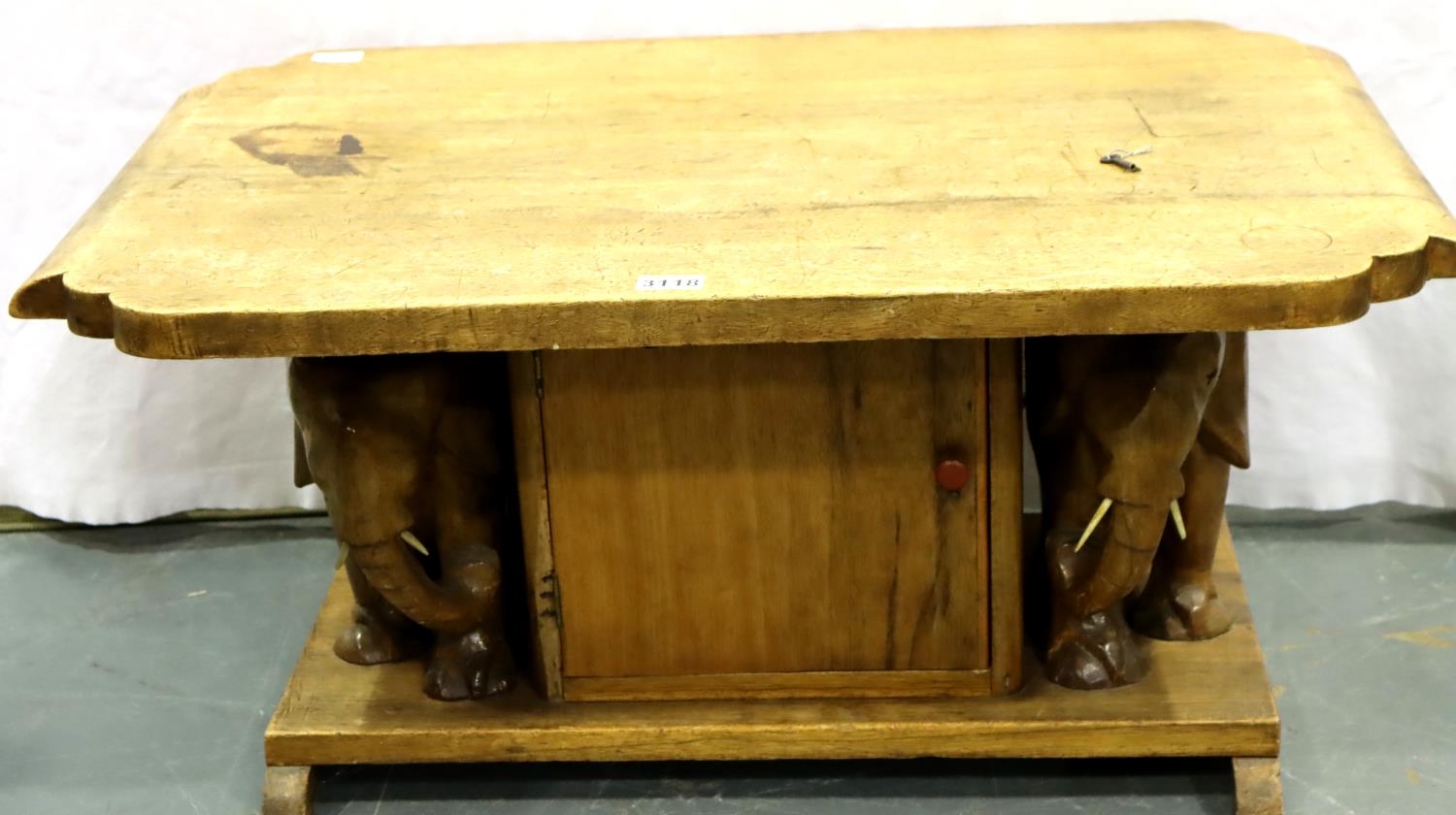 A 20th century carved fruitwood lamp/coffee table, shaped rectangular top supported by two carved elephants and single door cupboard, 88 x 57 x 43 cm H. Hinges to cupboard door damaged. Not available for in-house P&P, contact Paul O'Hea at Mailboxes on 01925 659133