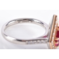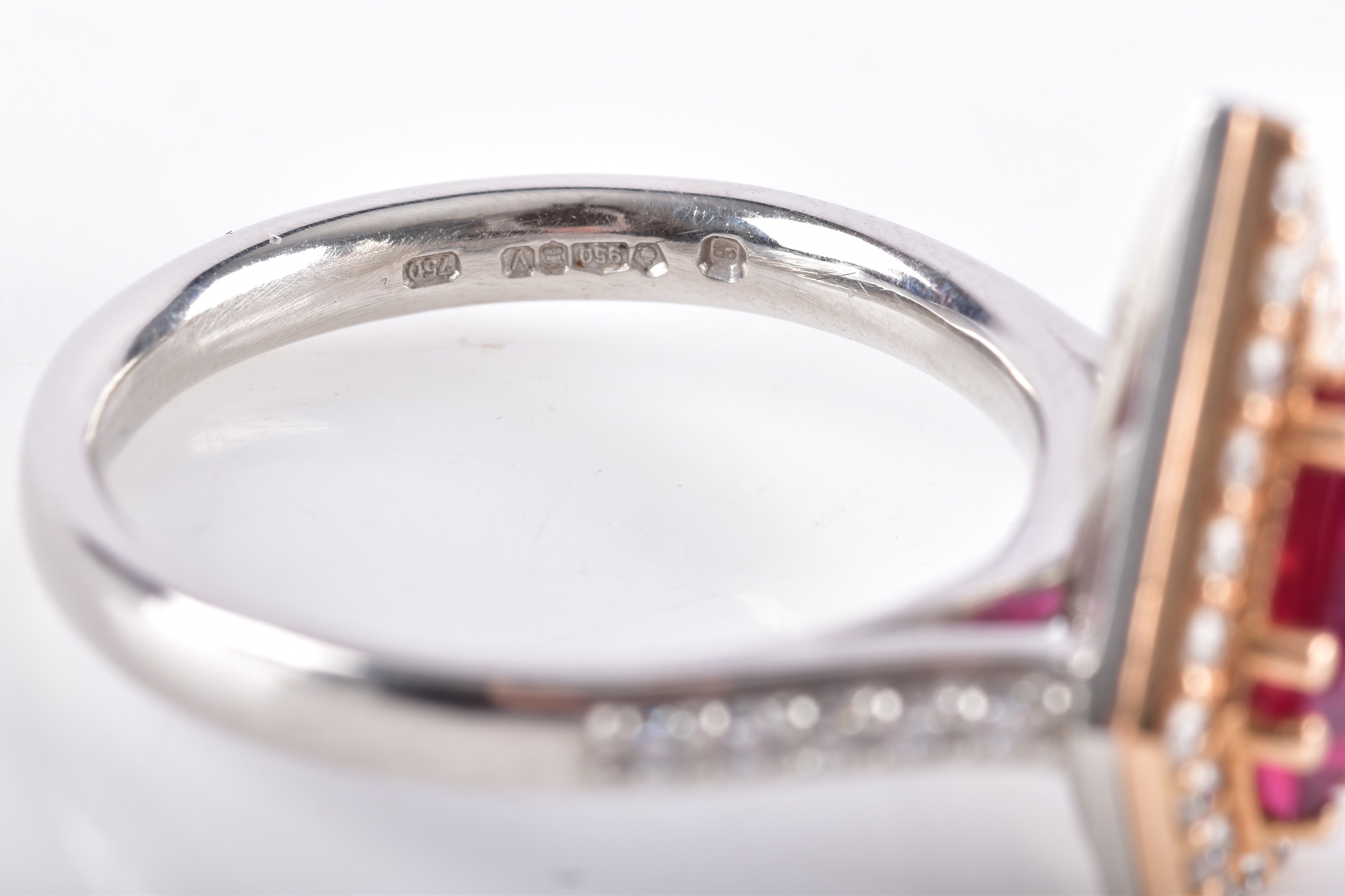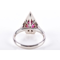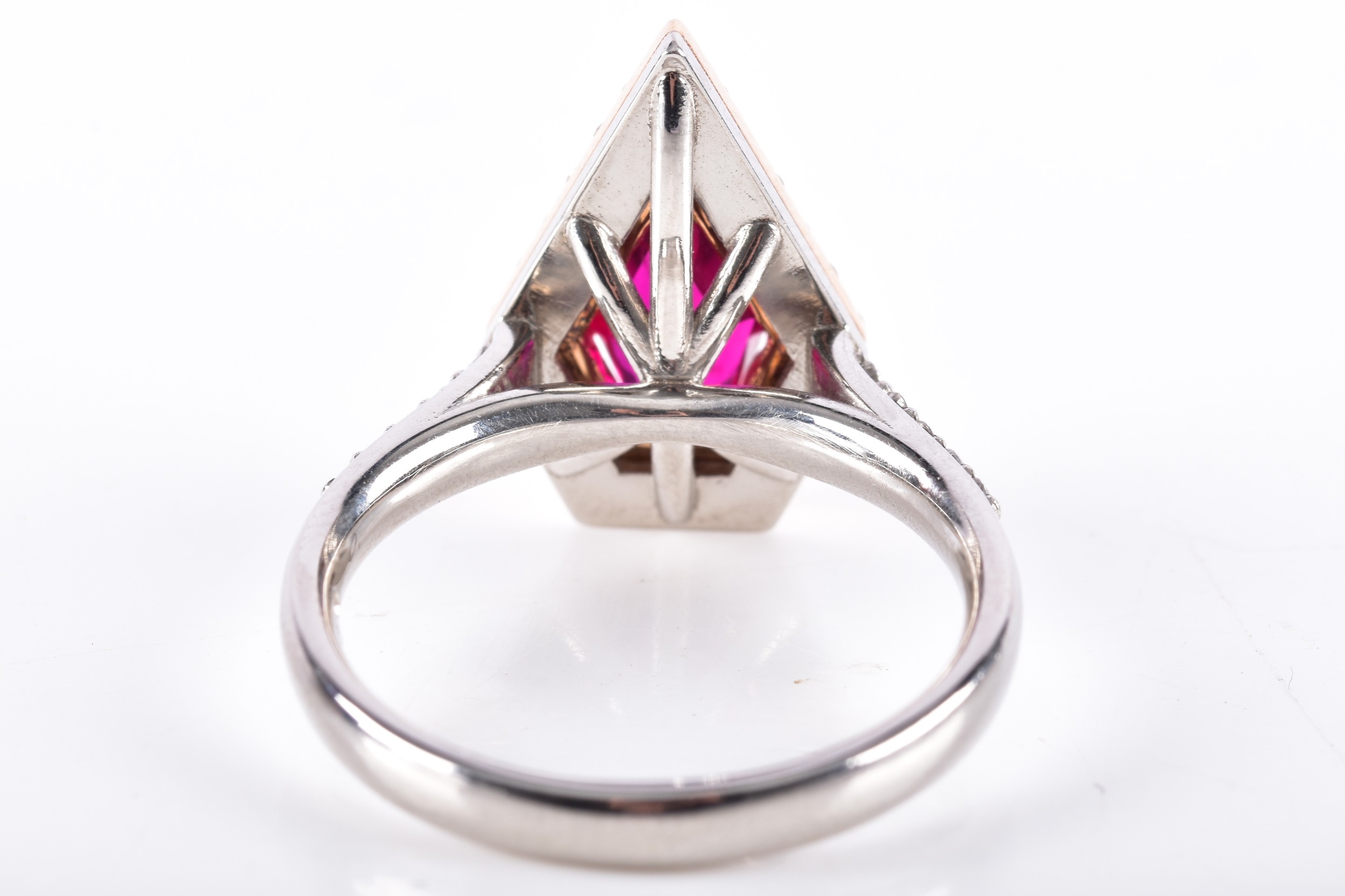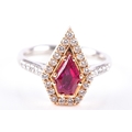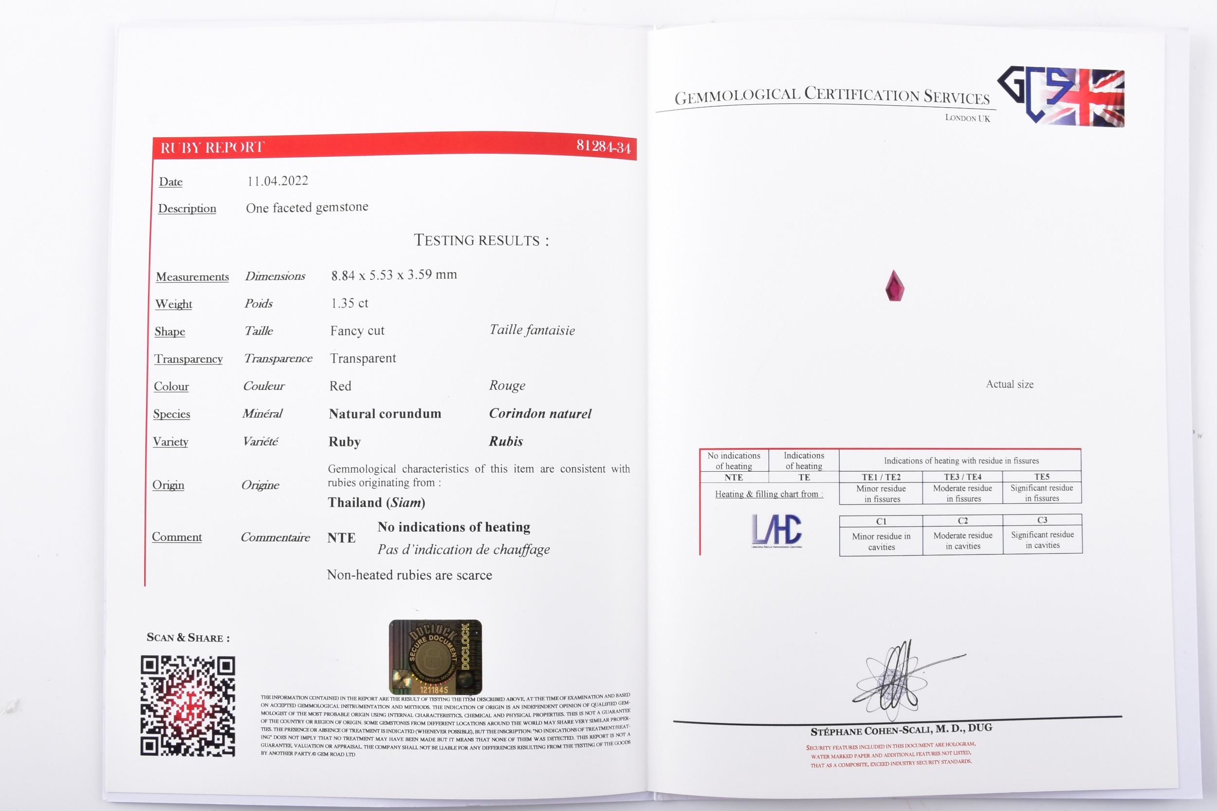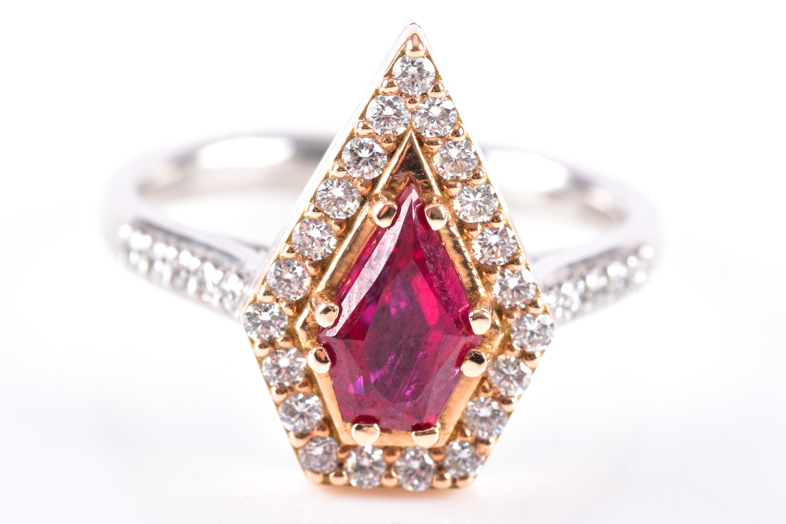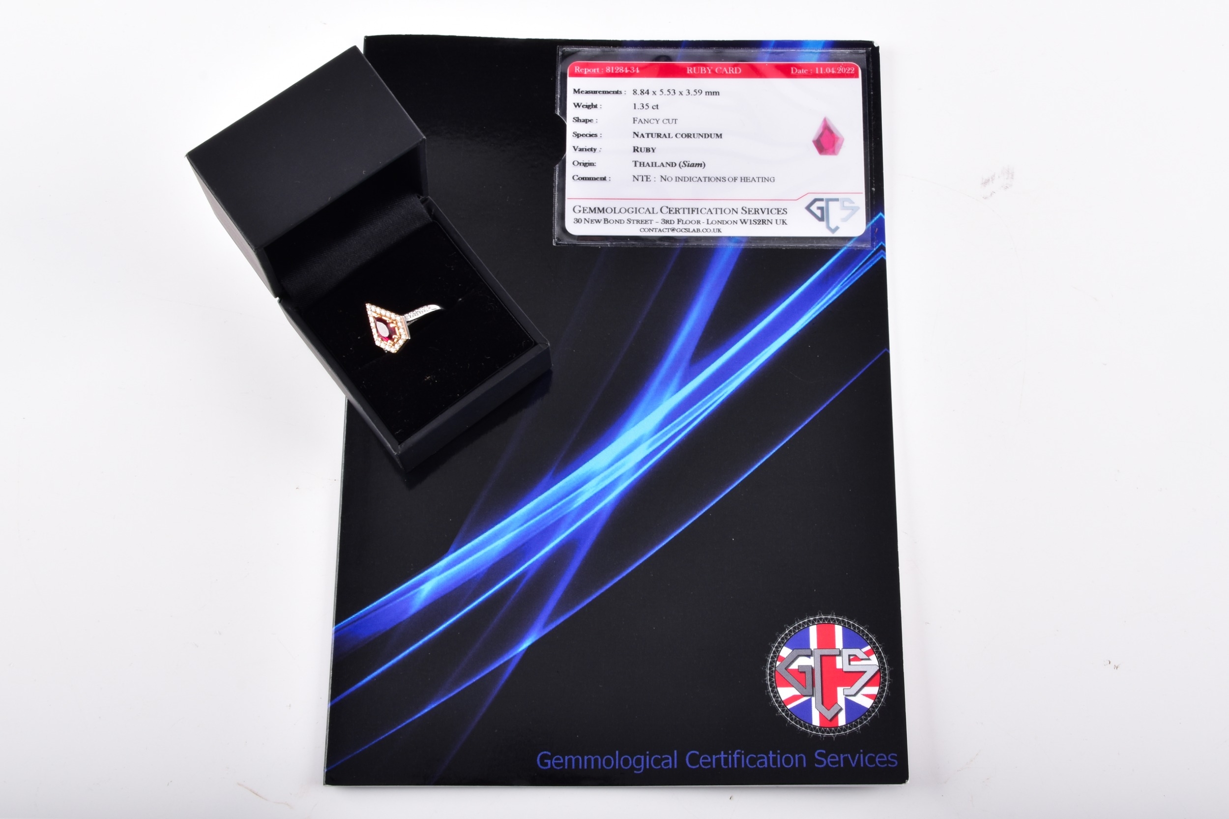 A natural and unheated Siam ruby 18ct yellow gold and platinum kite design cluster ring, set to the centre with a fancy cut Siam ruby with a carat weight of 1.35 carats, in a eight claw yellow gold setting, surrounded by a single row of twenty-one round eight cut diamonds in yellow gold settings with a total approximate weight of 0.46 carats, leading to raised diamond set shoulders and a smooth D-shape shank, head of ring measures 1.6 cm long, size M 1/2, in presentation box, accompanied by Gemmological Certification Services report no. 81284-34, stating no indications of heating.