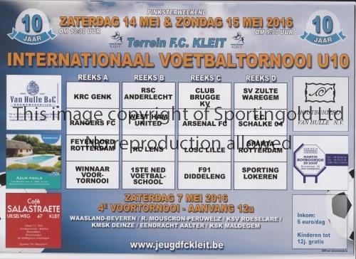 ARSENAL / WEST HAM UNITED / GLASGOW RANGERS / KLEIT YOUTH TOURNAMENT 2016 Programme for the Tournament 14 - 15/5/2016 including Arsenal, West Ham and Rangers. Good