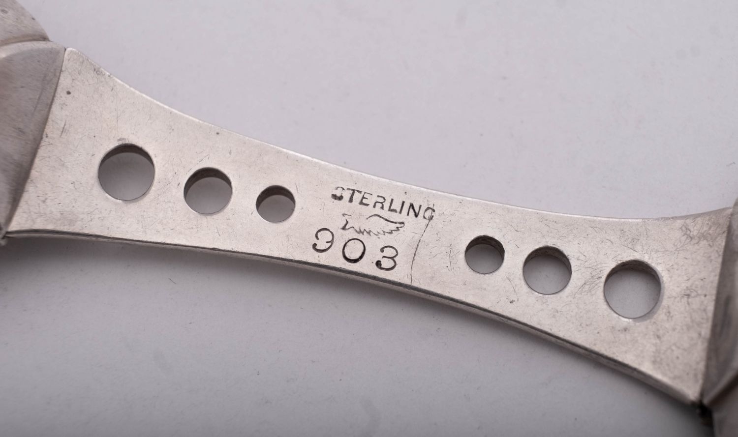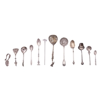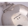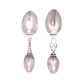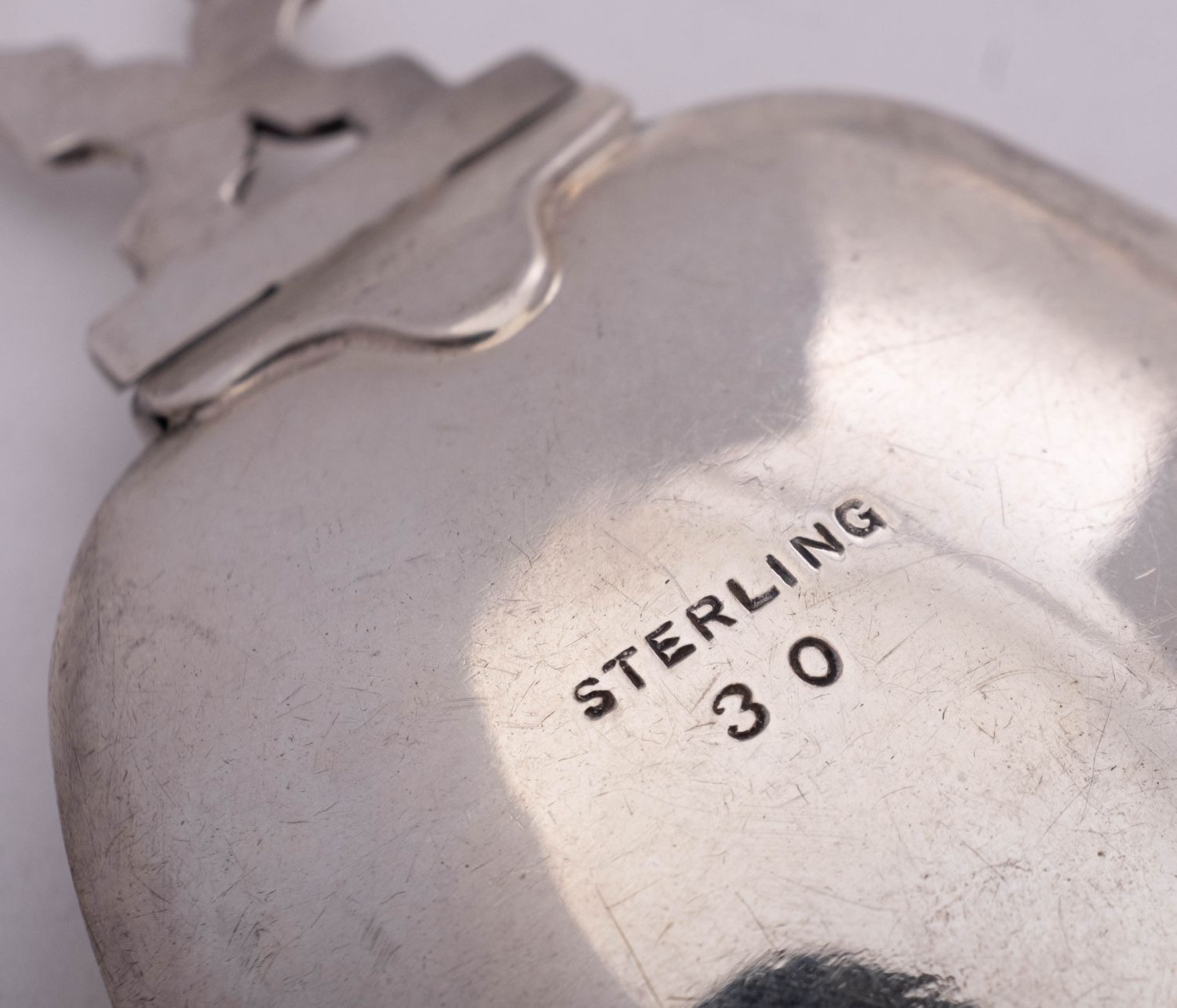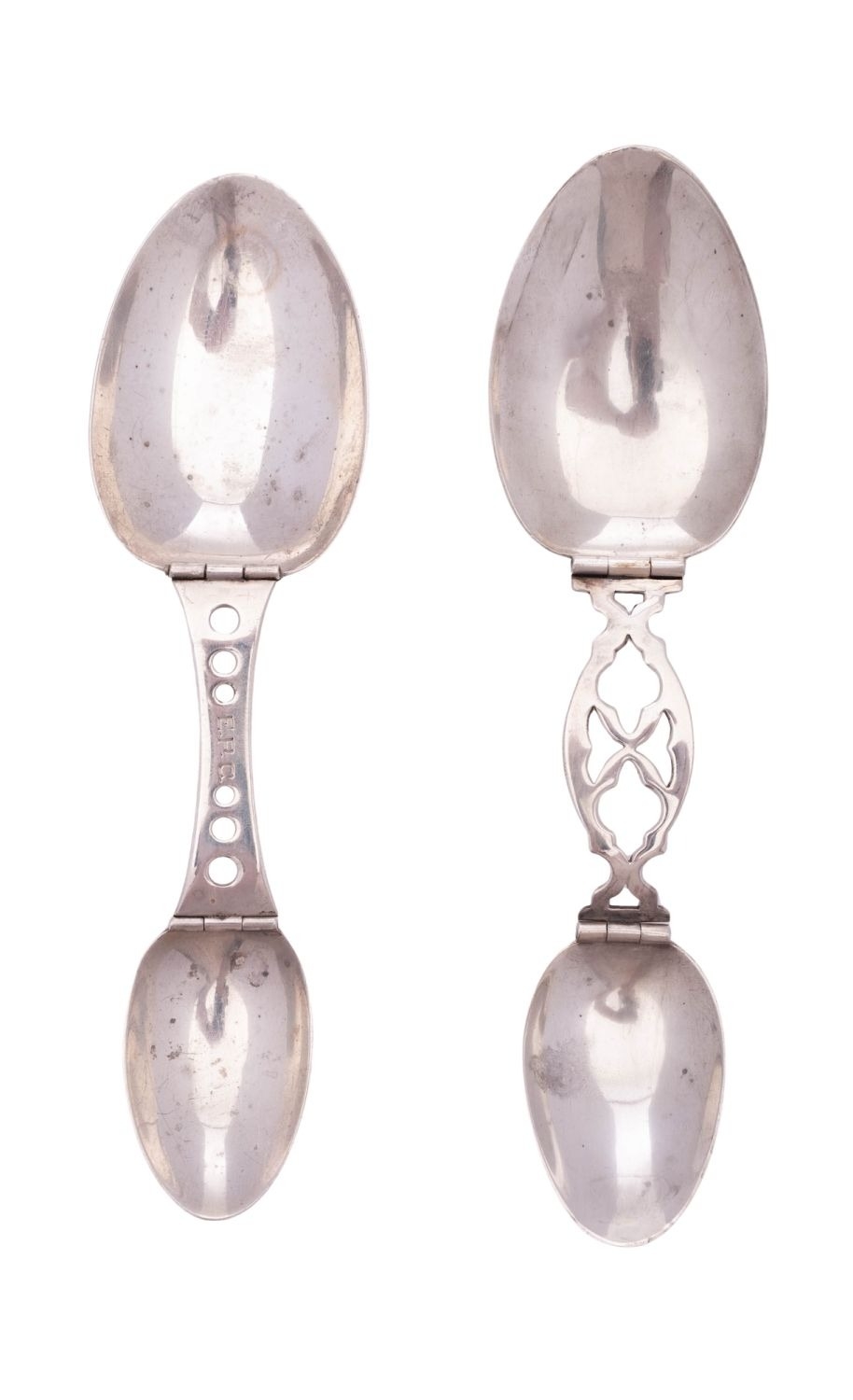 An early 20th century North American silver folding spoon, with a drilled stem, initialled ''E.P.C'', by Herbst & Wassall of New York, c.1925, together with another similar example, with an openwork stem, marked ''STERLING'' only; the former 6.75'' (17.2cm) long; 2.3ozt (2)