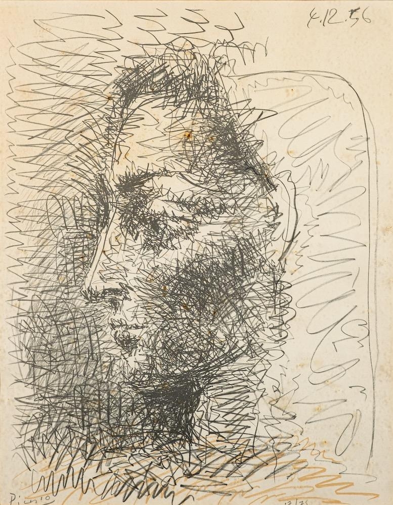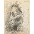 *Pablo Picasso [Spanish, 1881-1973] Portrait of Jacqueline (1956) bearing a possibly later signature and spurious edition number 17/75 to the lower margin, dated 4.12.56 in the plate lithograph in colours on wove paper sight size 52 x 40cm. Provenance: Private Collection, Devon Formerly the collection of the art collector Sibyl Horsfall (1917-2016) The present portrait represents Picasso's muse Jacqueline Roque. An edition of this lithograph is in the collection of the MoMa, New York, another was recently sold at Sotheby's New York, 16 December 2022, lot 547.