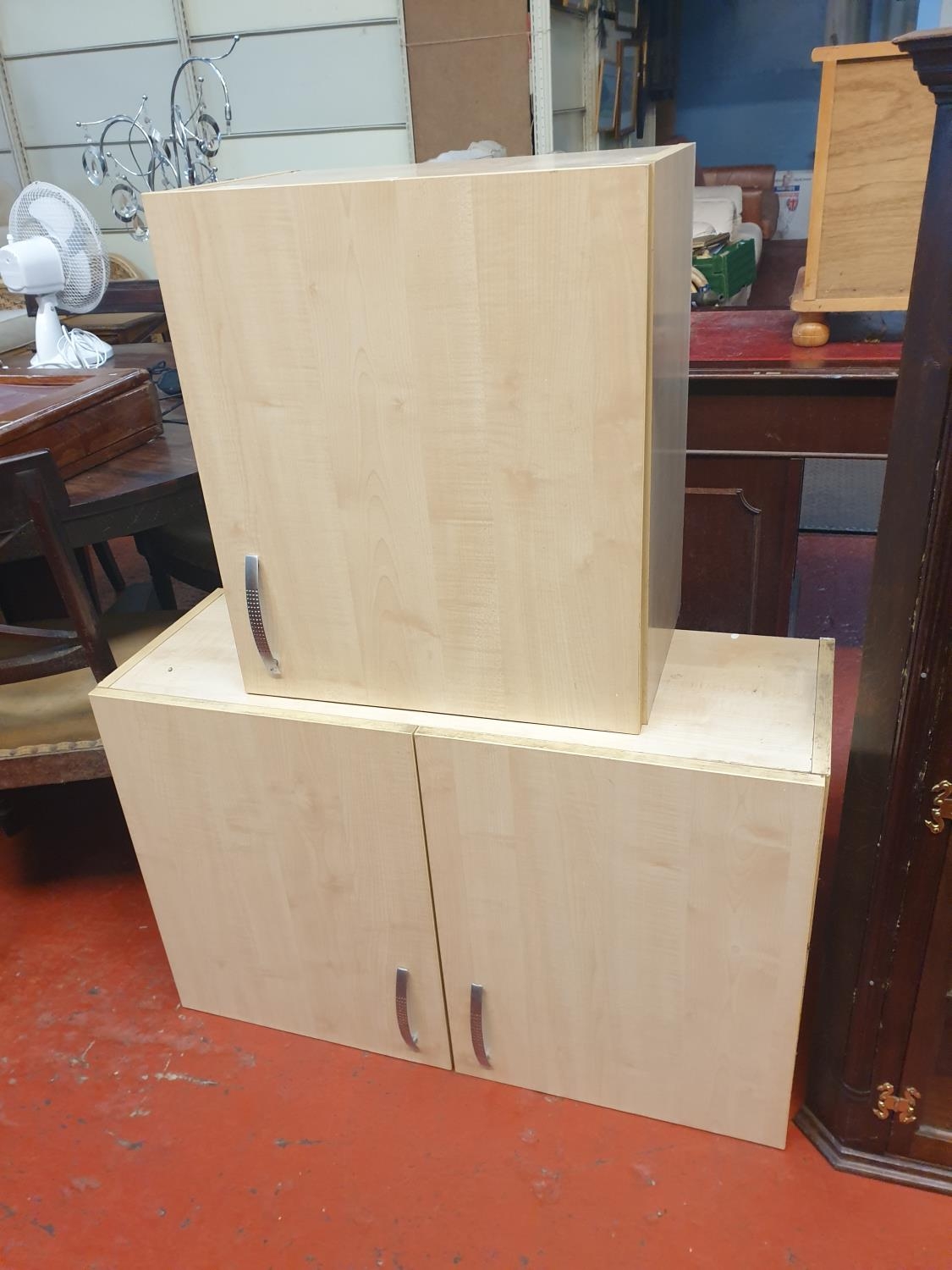 Beech Finish Double Kitchen Cupboard (approx 57cm tall x 90cm long x 32cm deep) & Matching Single Cupboard (57cm tall x 50cm long x 32cm deep).