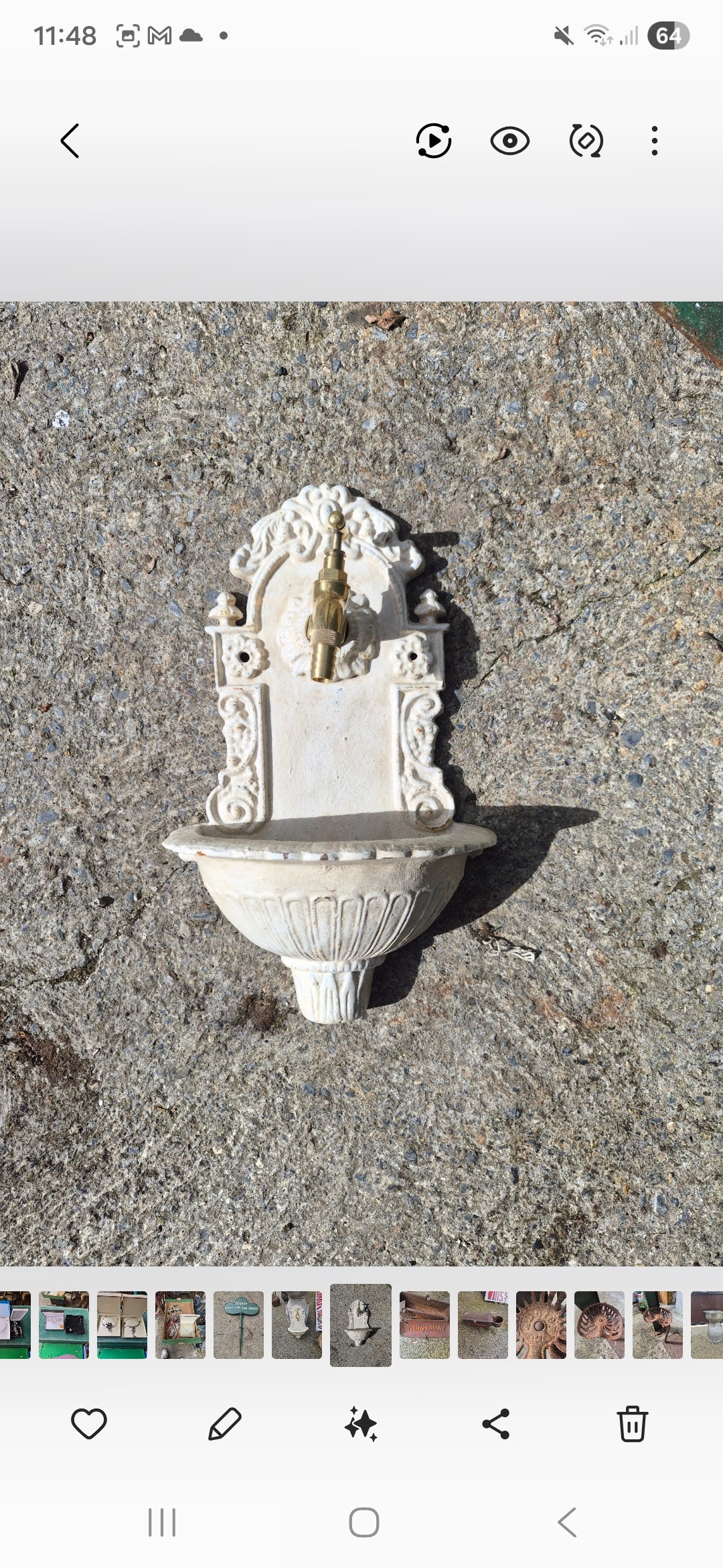 A cast iron wall fountain with brass tap. H38cmW24cm.