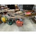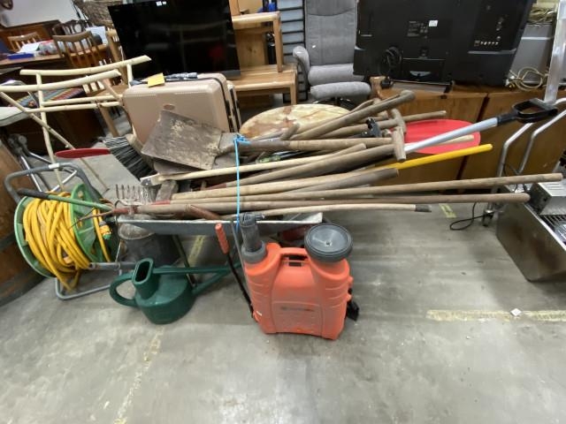 Galvanised wheelbarrow, assorted gardening tools etc