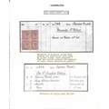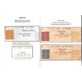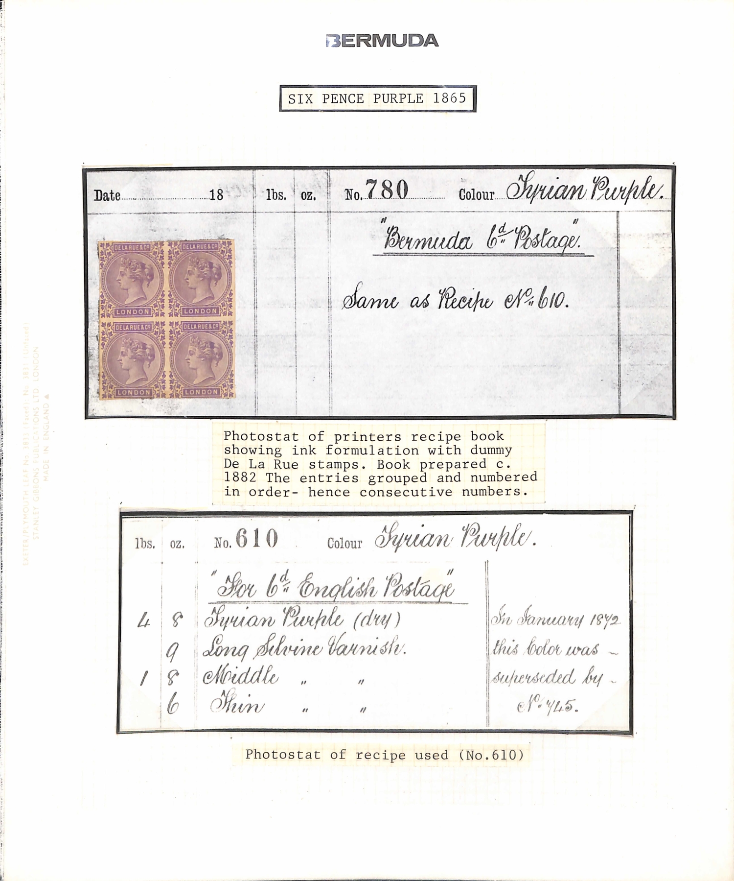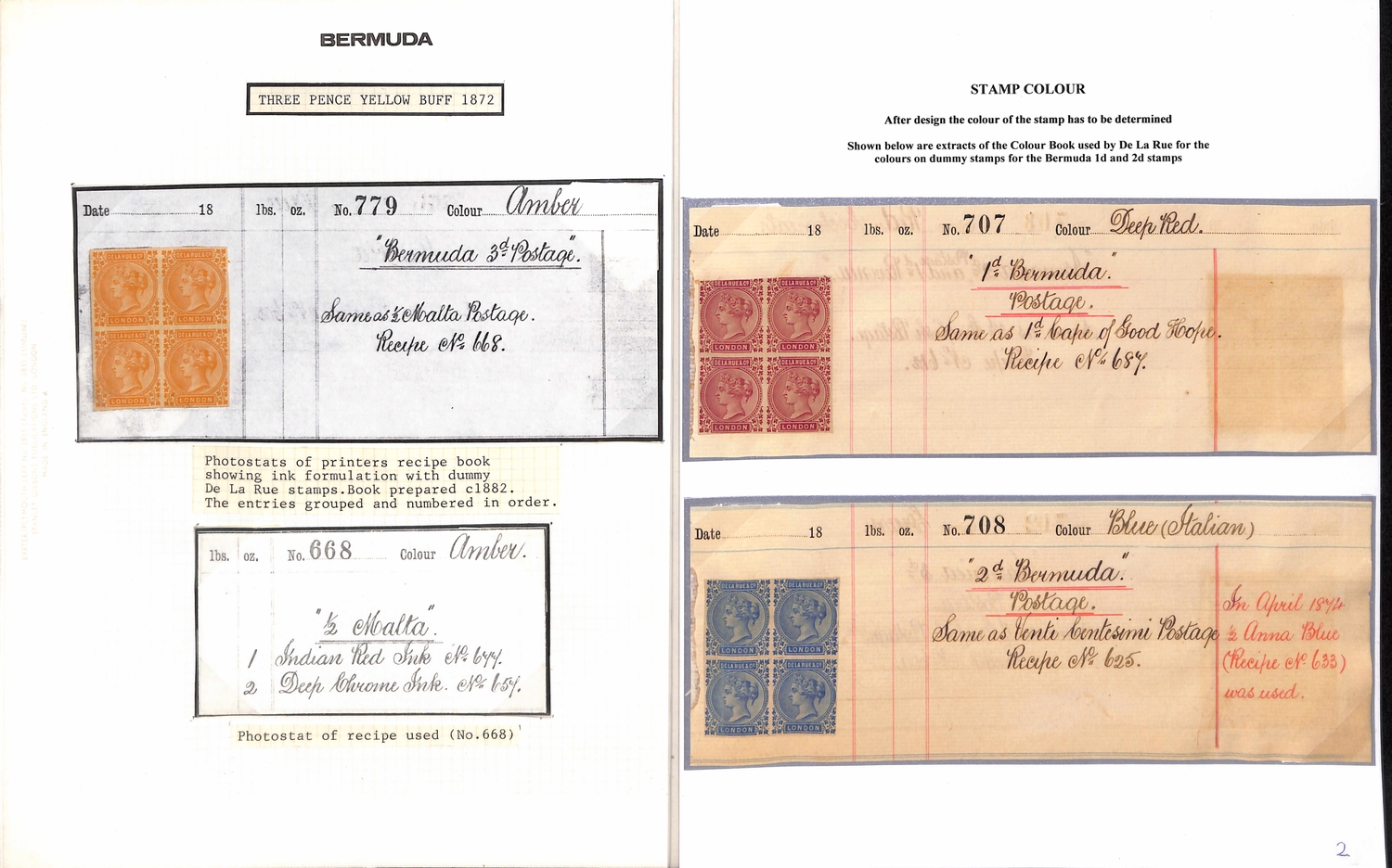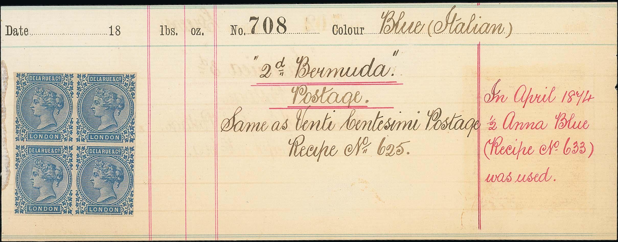 Ink recipes for the 1d and 2d stamps cut from the De La Rue ink recipe book, both bearing blocks of four De La Rue & Co dummy stamps in the adopted colours, also photostats of the ink recipes for the 3d and 6d stamps with De La Rue & Co dummy stamp blocks of four applied in the adopted colour. The De La Rue ink recipe book had recipes on both sides of the page, usually for differing countries; most pages therefore had the dummy stamps removed from one side and applied to photocopies of that page, as in this case. The 1d and 2d recipes have recipes for Jamaica stamps on the reverse (dummy stamps removed). The 2d recipe has an inscription showing the recipe was altered in April 1874. A unique group. (4). Photo on Page 16.