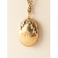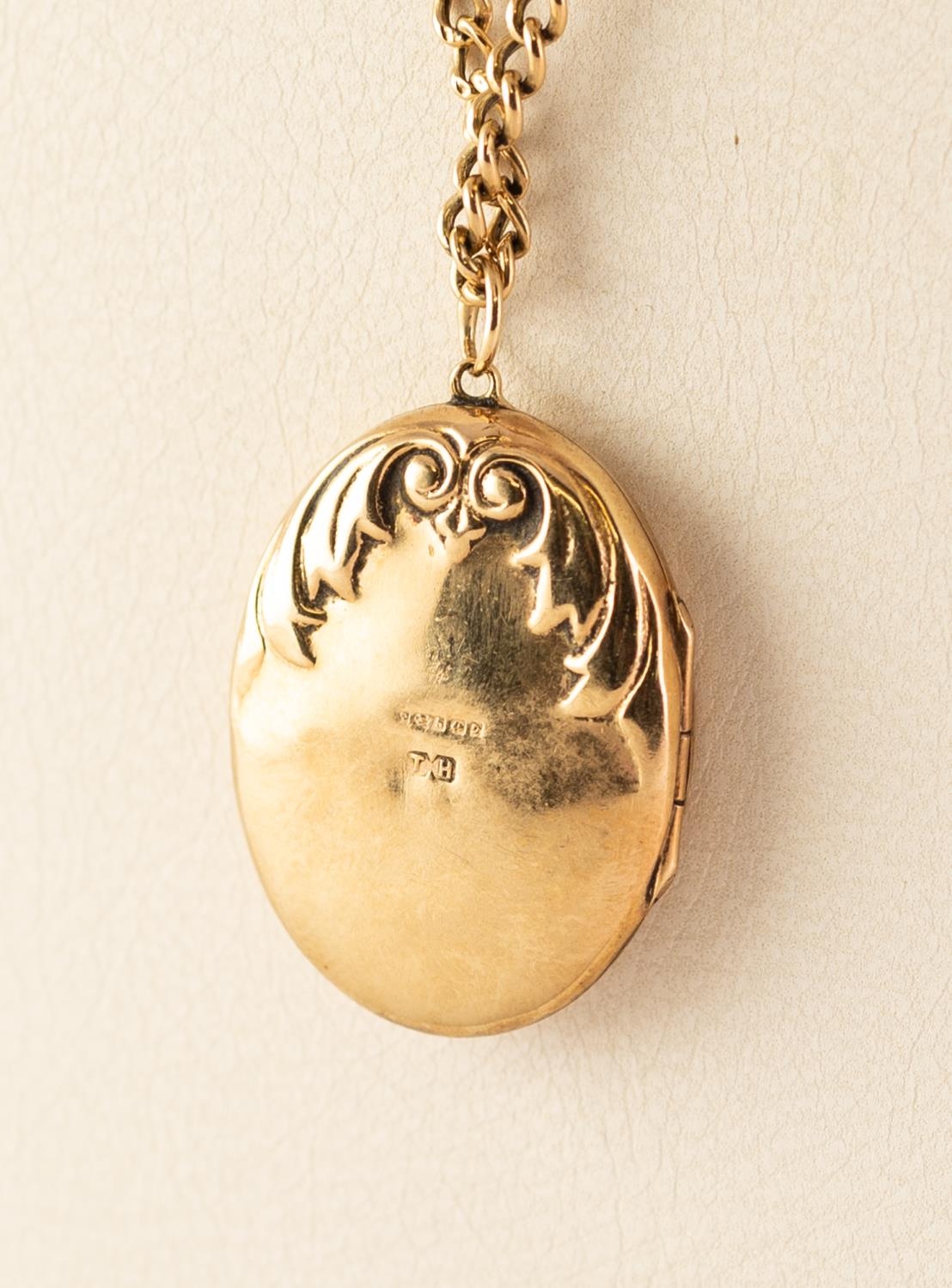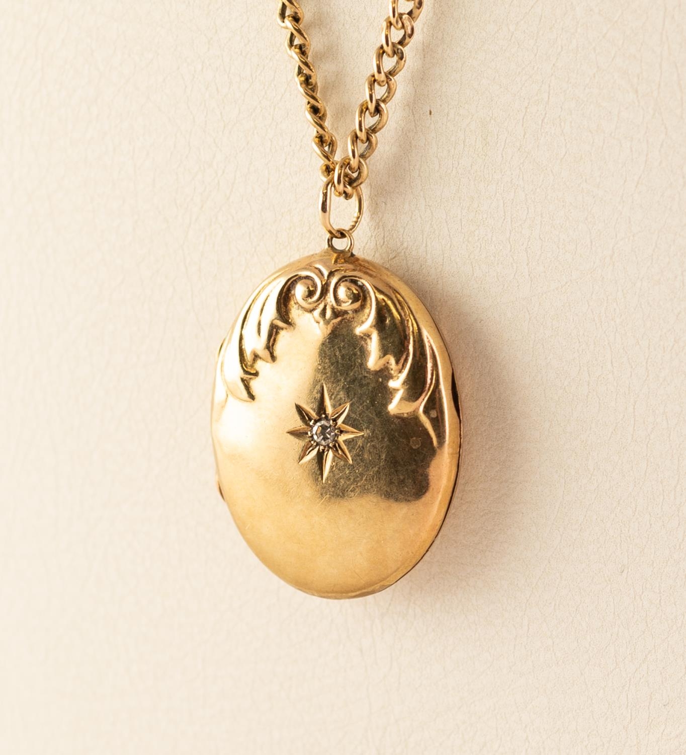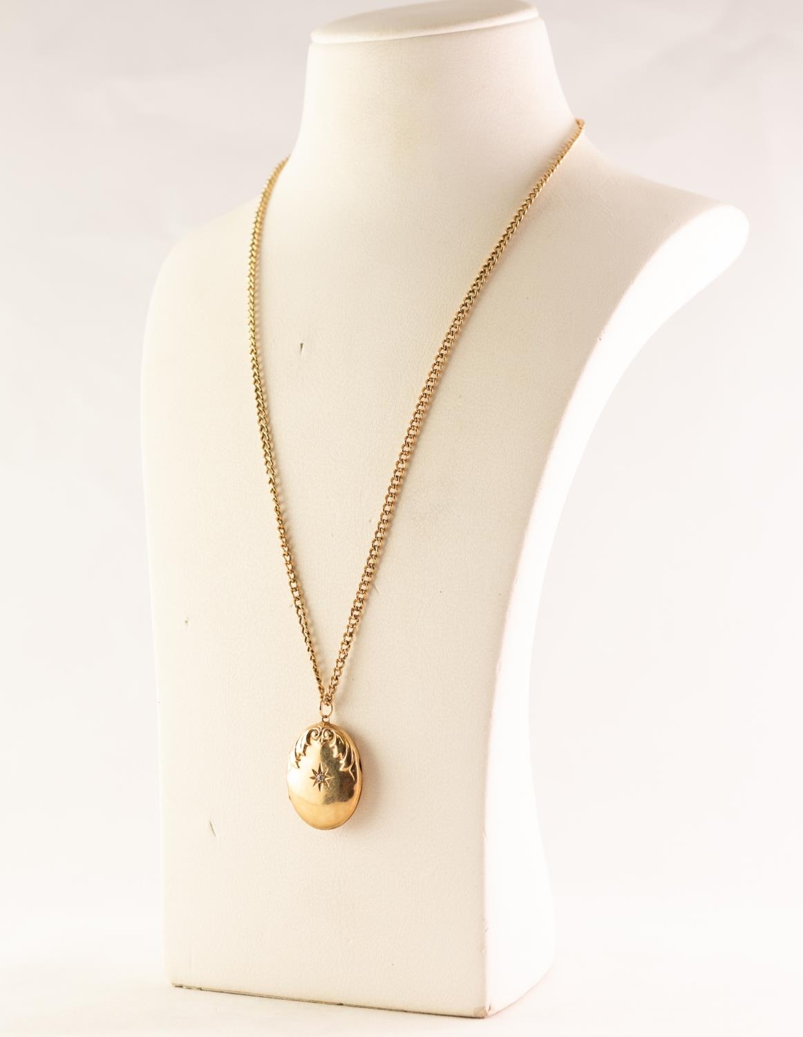 9ct GOLD OVAL LOCKET set with a tiny diamond, on a 9ct GOLD CHAIN, 9.7 gms
