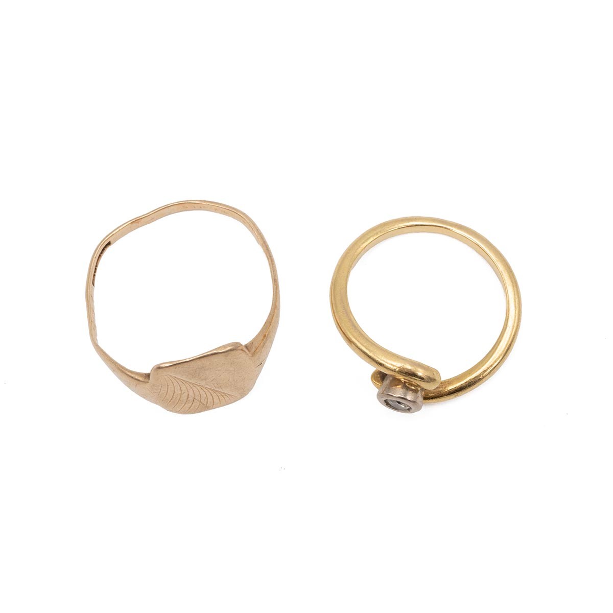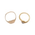 A 9ct gold signet ring, size T, weight, 2.4 grams. Together with an 18ct gold solitaire diamond ring with twisted mount, size L, weight 4.1 grams.