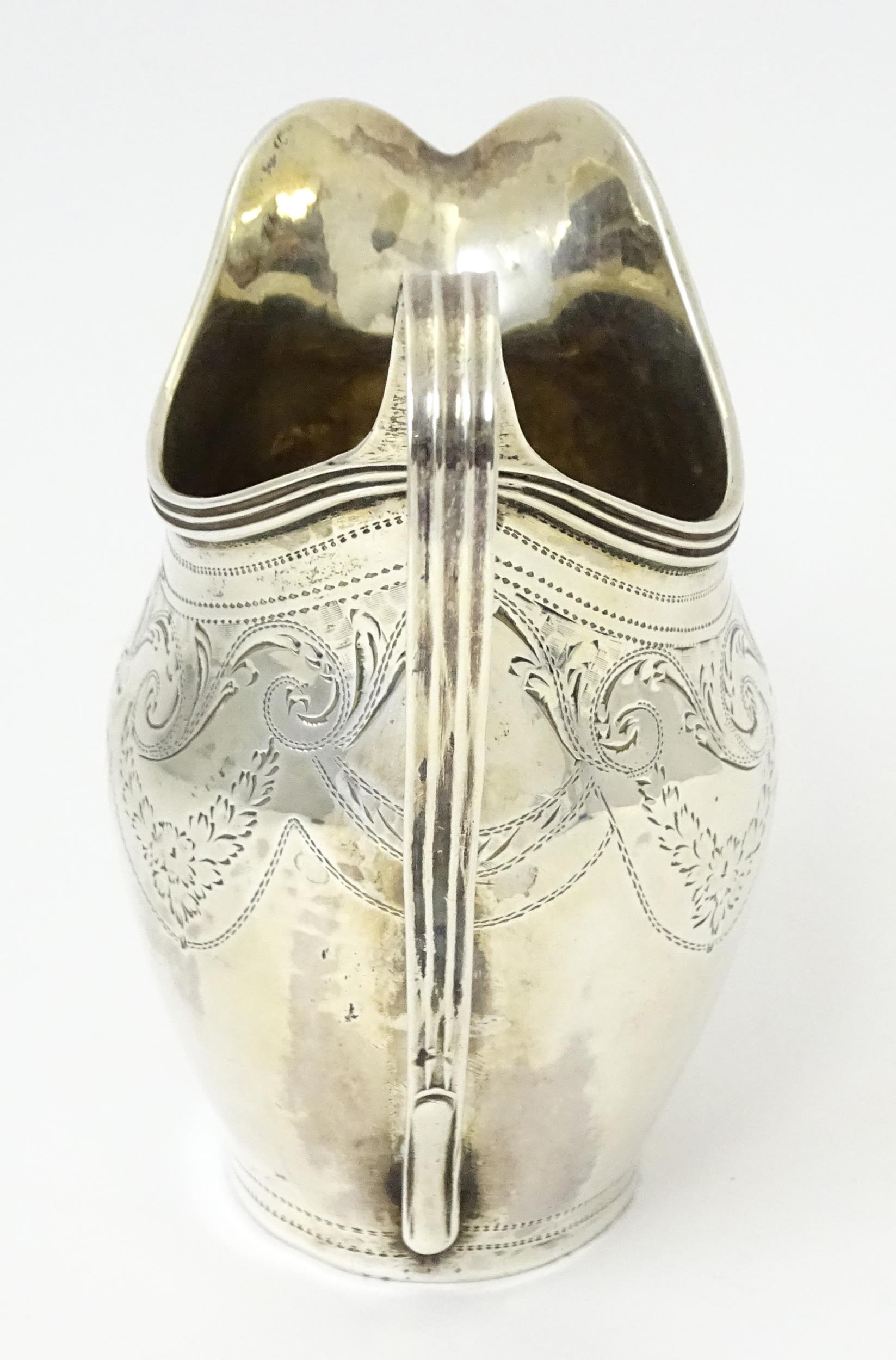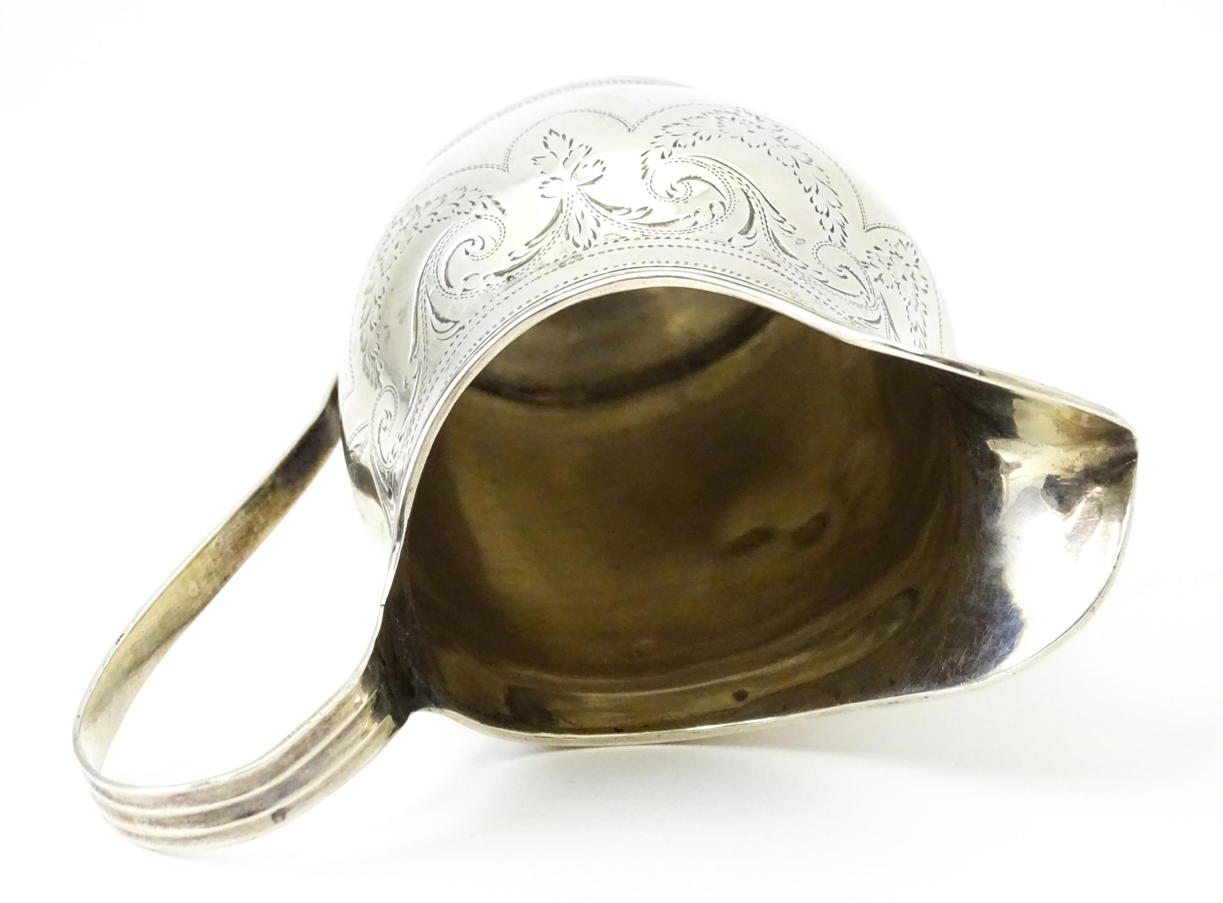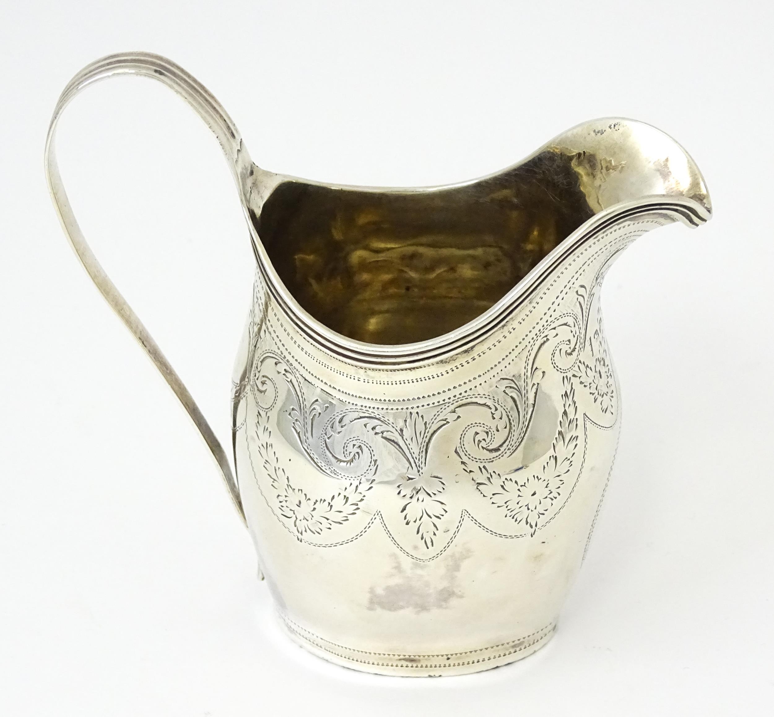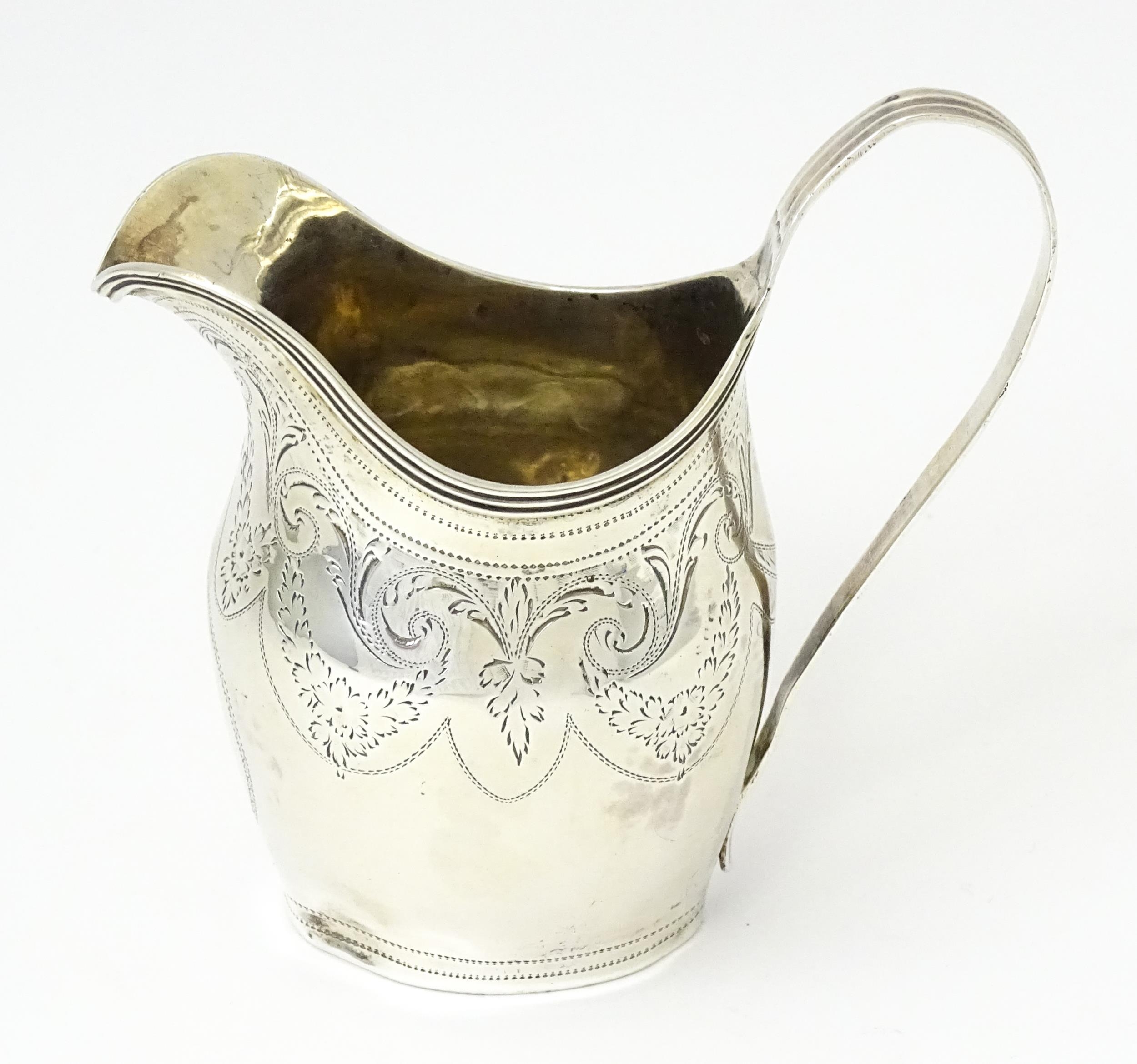 A silver cream jug with engraved decoration, hallmarked London 1802, maker Peter, Ann & William Bateman. Approx. 4 1/2" high