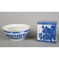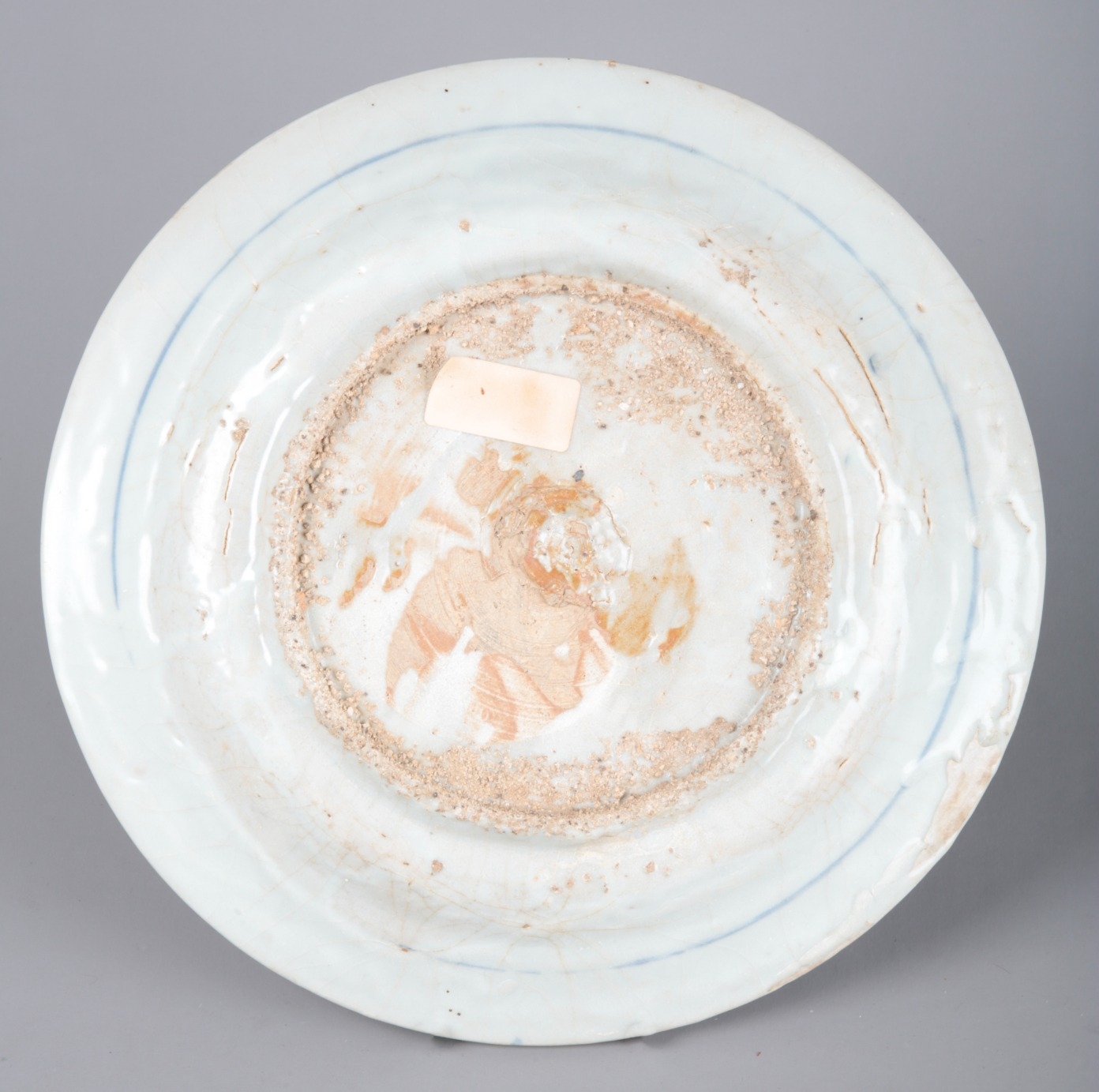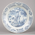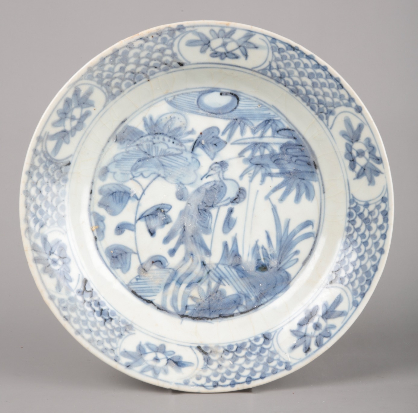 A CHINESE PORCELAIN BLUE AND WHITE 'SHIPWRECK' CHARGERMing dynasty, decorated with a bird in a garden landscape, 26.5cm diameter