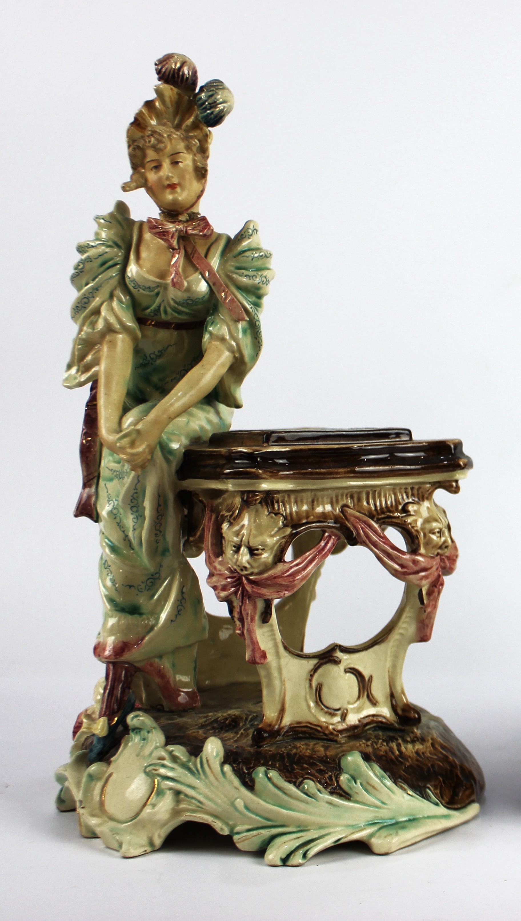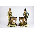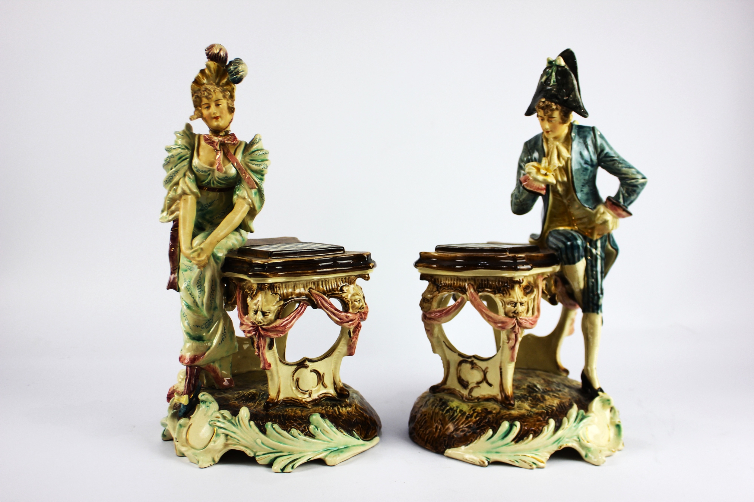 A pair of continental figures of chess players, modelled as a male and female figure in 18th century style French attire, impressed number to base (male figure AF), height 37cm (2)
