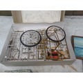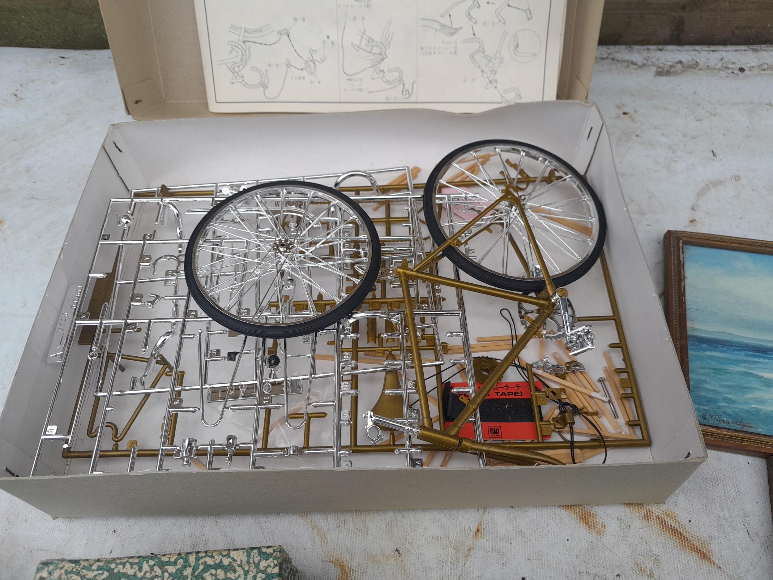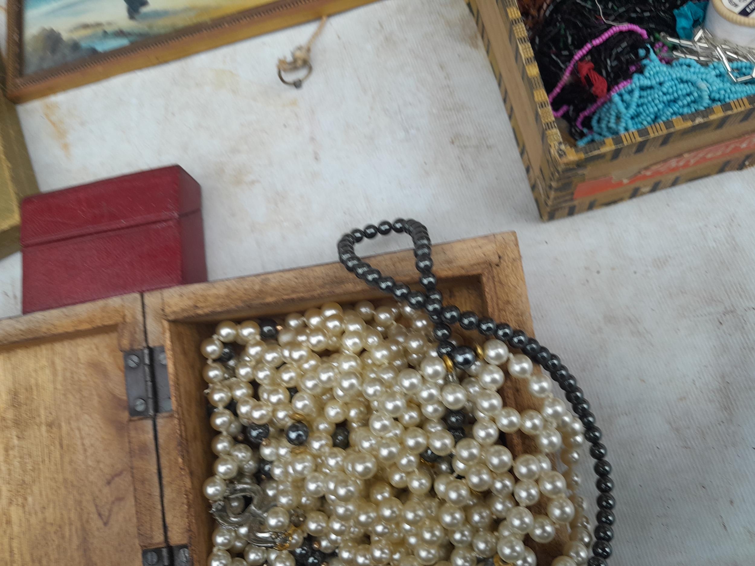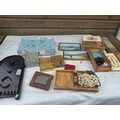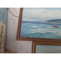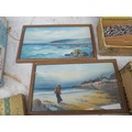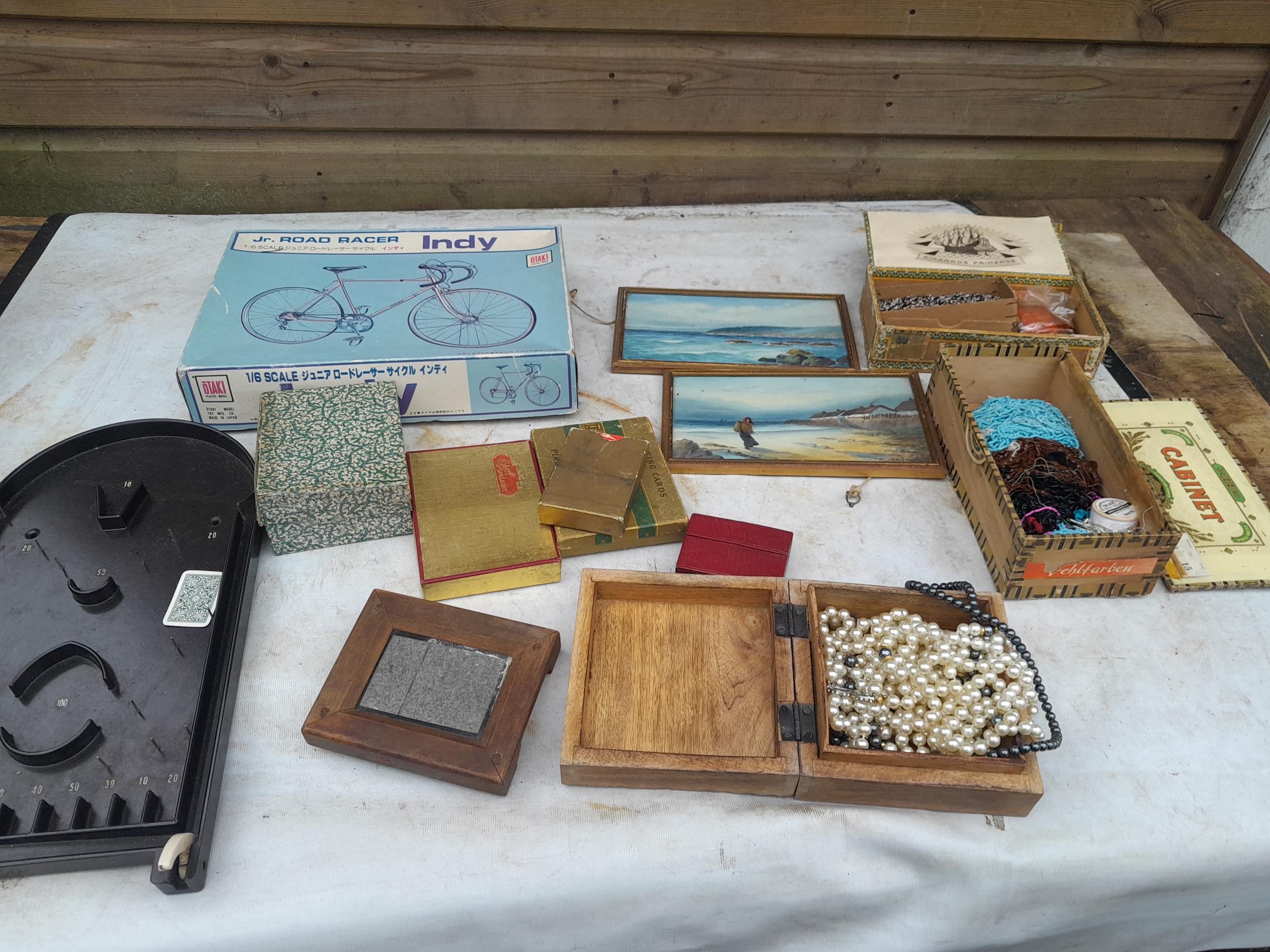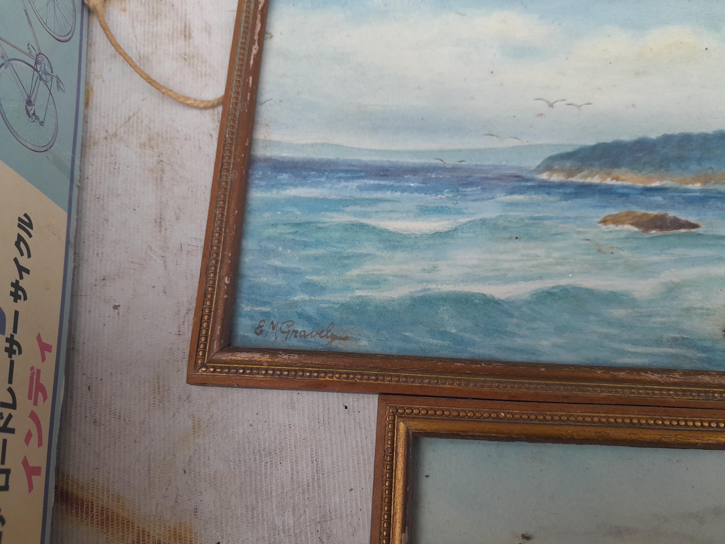 Box of oddments : 2 x small watercolours by E M Gravely, beads etc.
