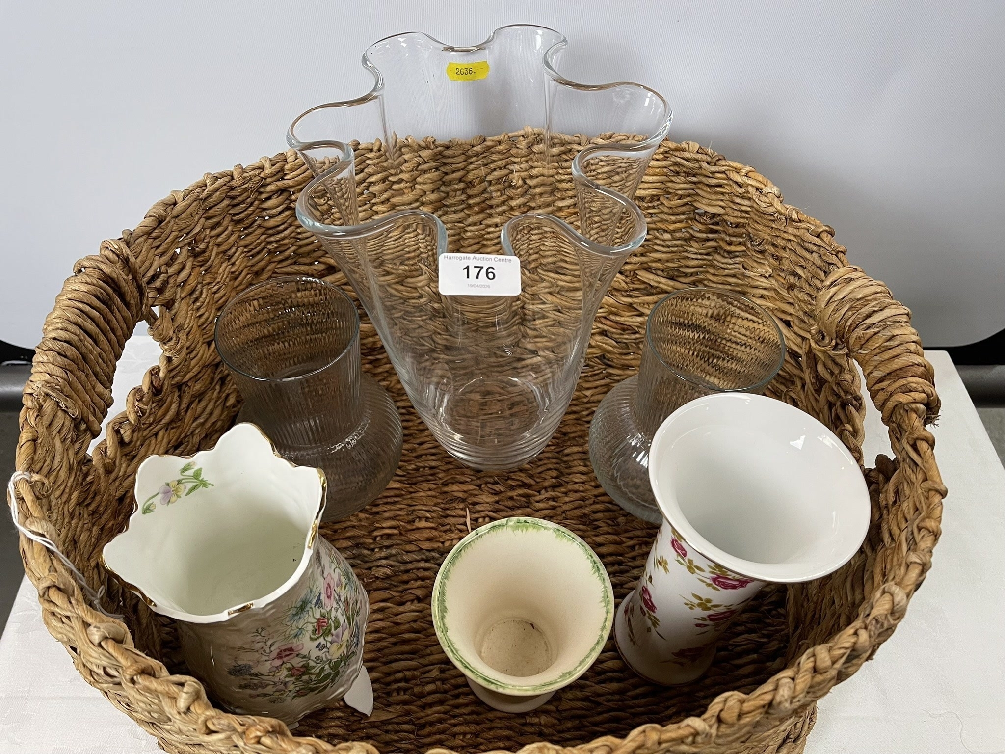 LARGE DOUBLE HANDLED WICKER BASKET CONTAINING CERAMIC & GLASS VASES