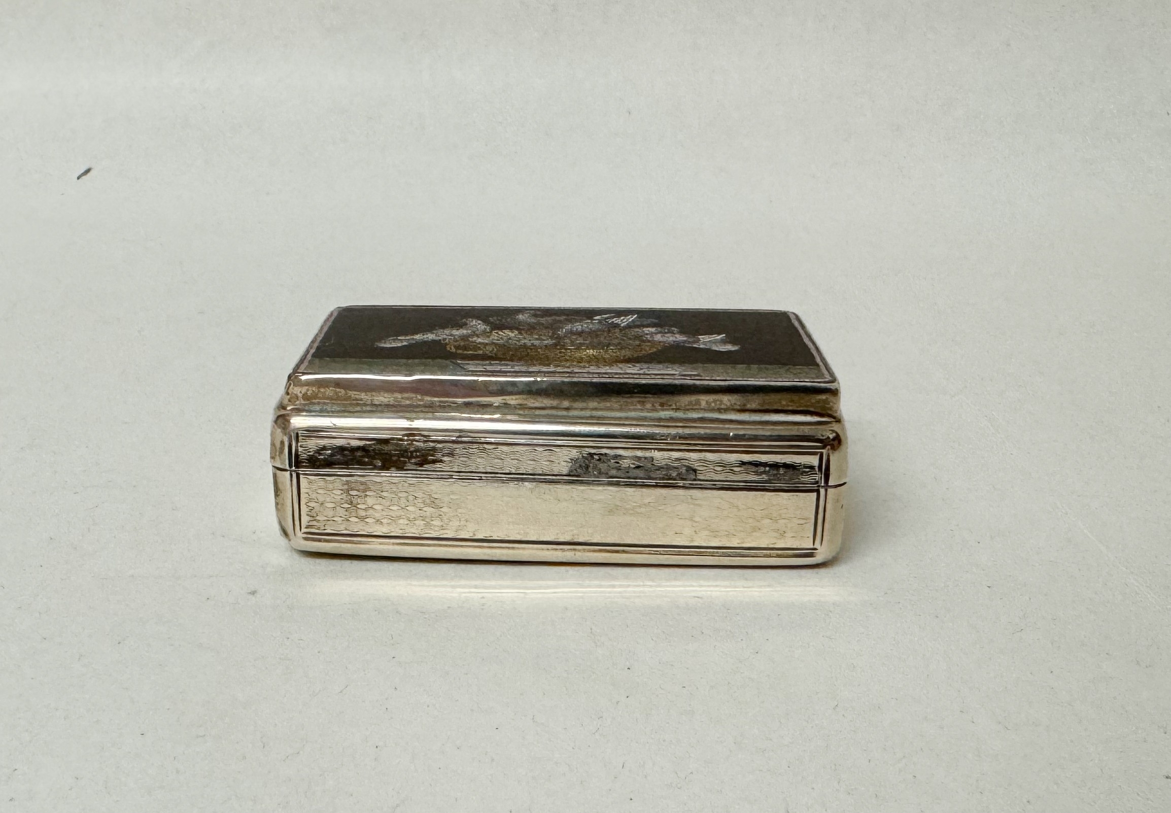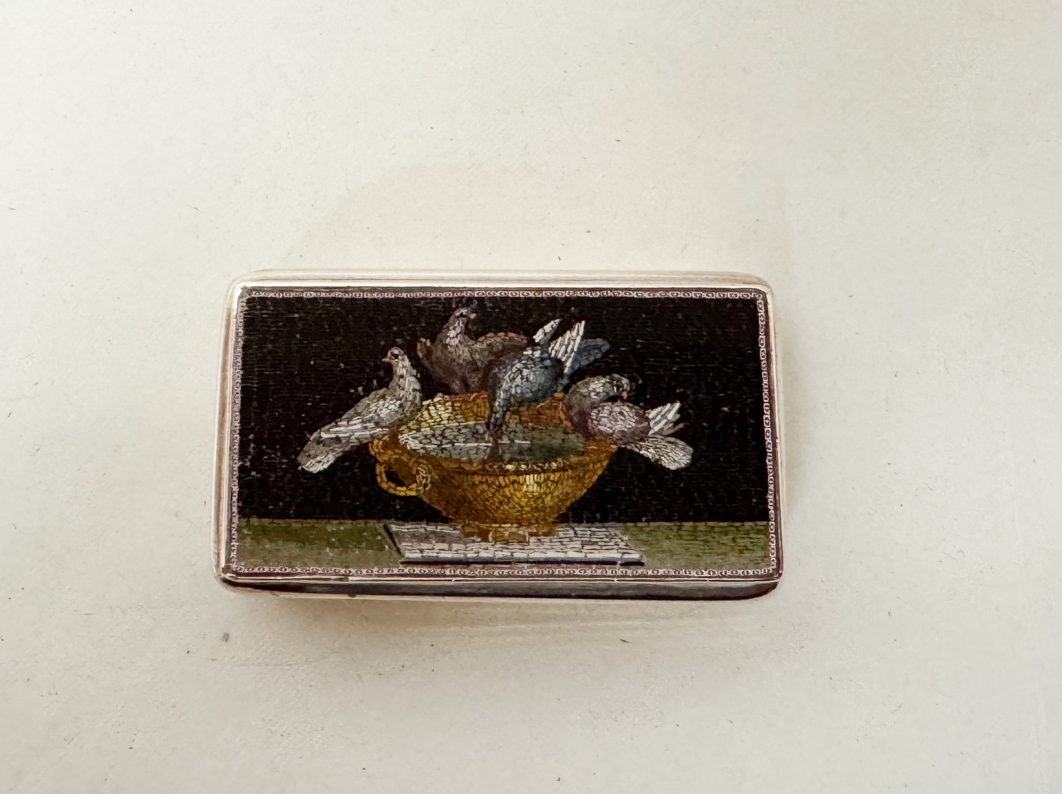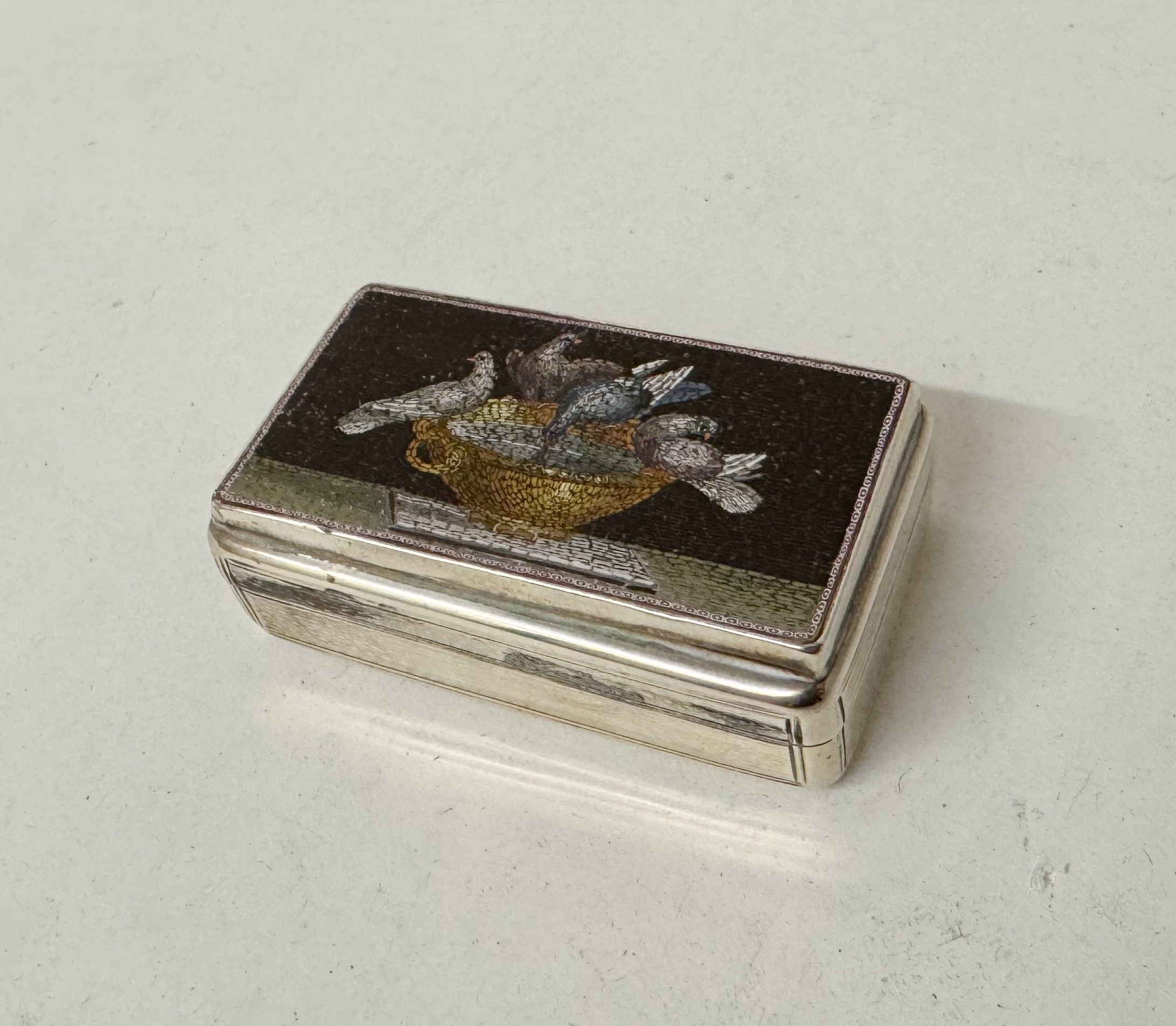 Georgian silver snuff box by Edward Edwards, of rounded rectangular form, the top with an inset micro mosaic panel depicting doves of Pliny. 6cm by 3cm. London Hallmarks 1835
