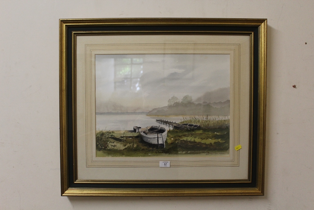MAURICE ISON - A FRAMED AND GLAZED WATERCOLOUR ENTITLED 'FIRST LIGHT NORFOLK' DATED 1983 - OVERALL SIZE 74 X 64 CM