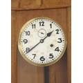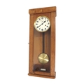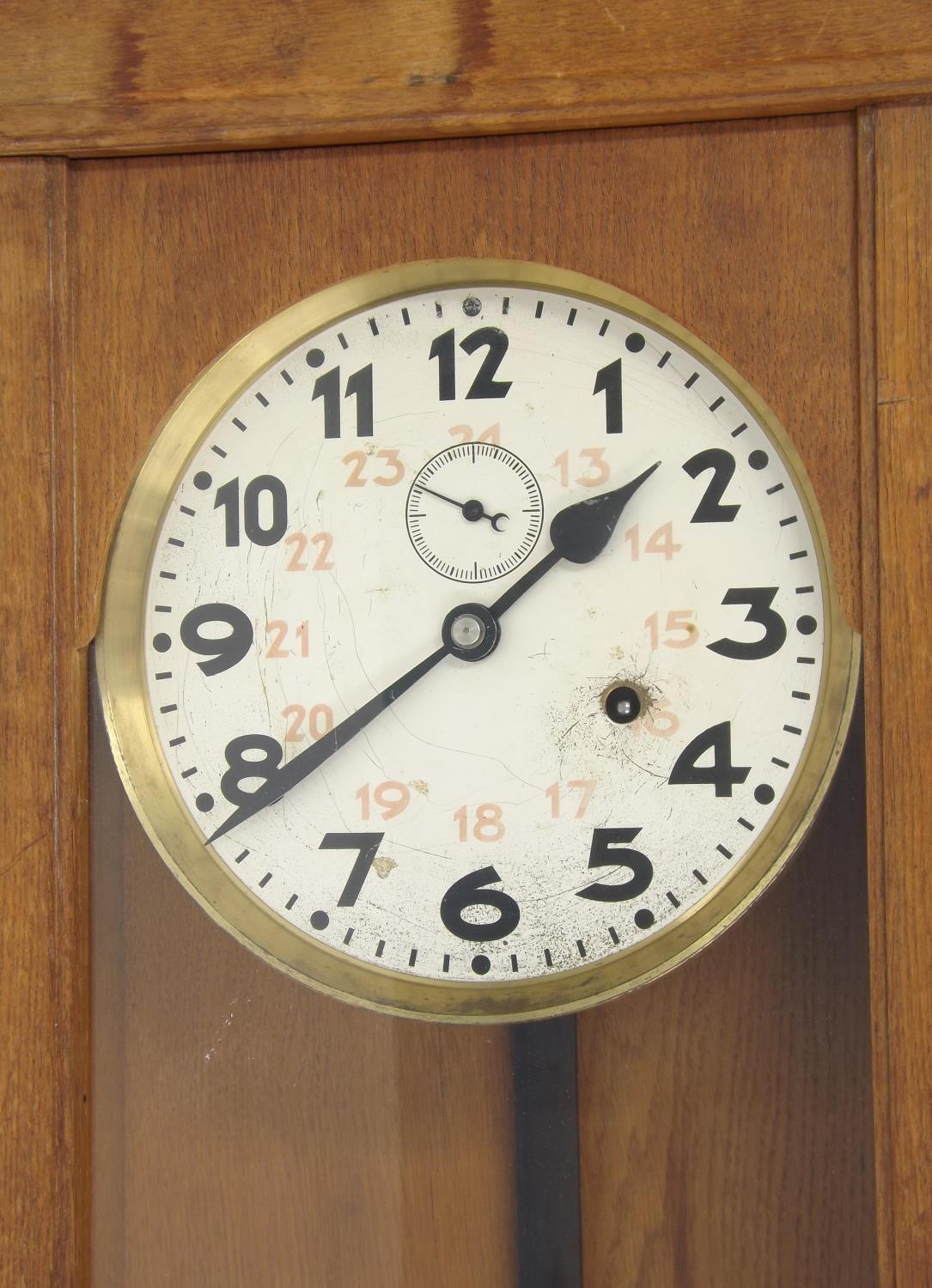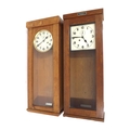 Two C. Theod. Wagner mechanical wall clocks with provision for contacts to operate electrical slaves (contacts absent), both with subsidiary seconds and within oak glazed cases, 35" high (two pendulums and one key) (2)