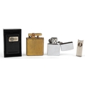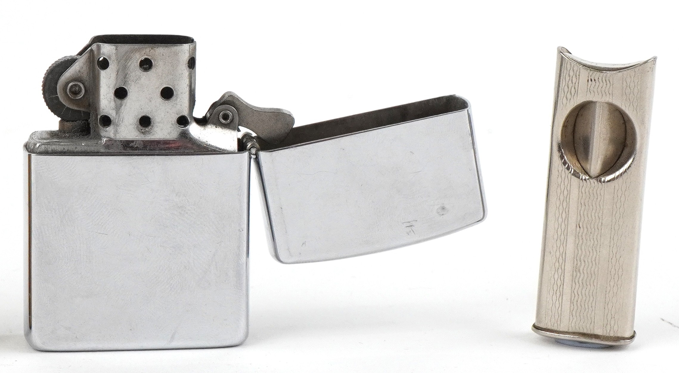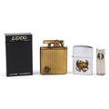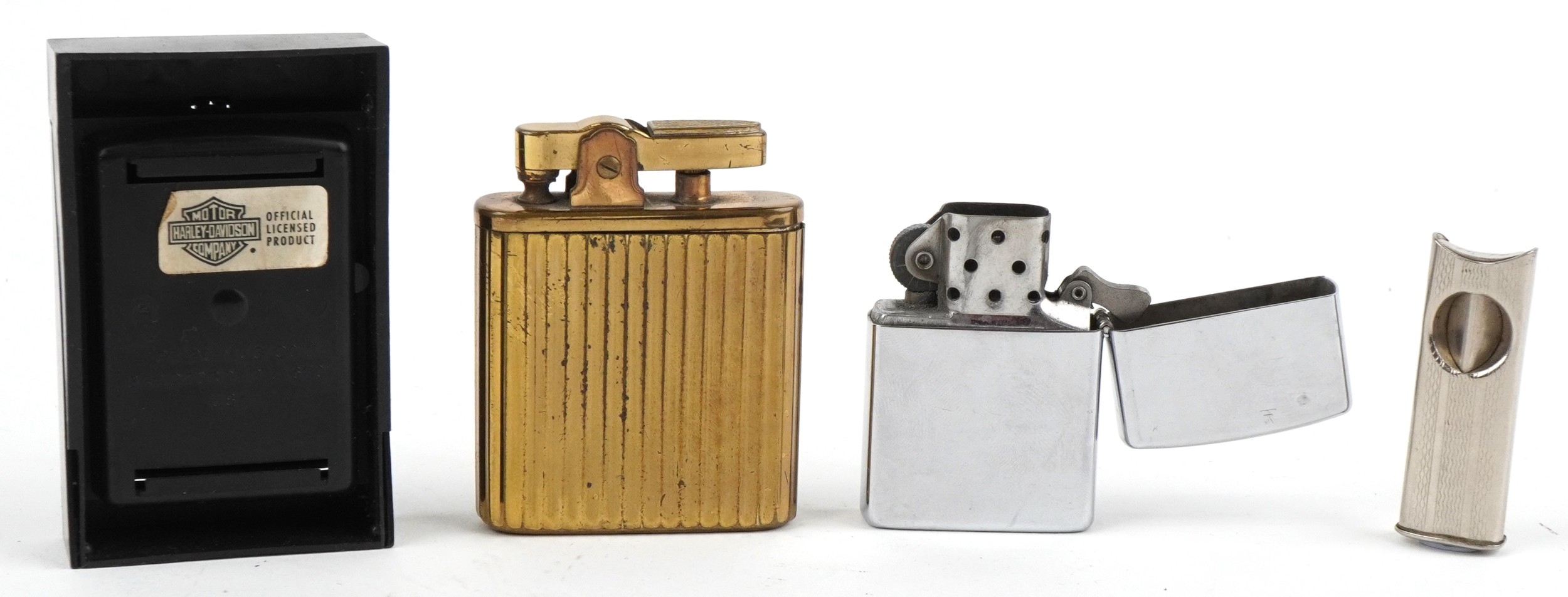 Smoking items comprising a Zippo Harley Davidson lighter, a brass musical lighter and a white metal cigar cutter.