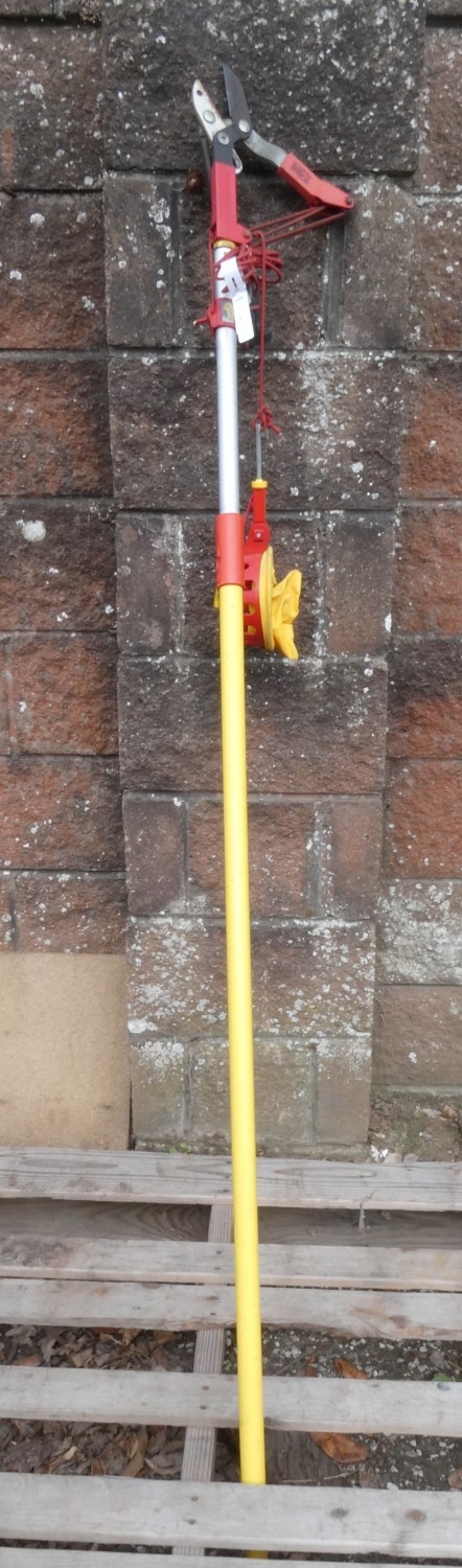 A Wolf Garten telescopic pole with lopping and fruit picking attachments