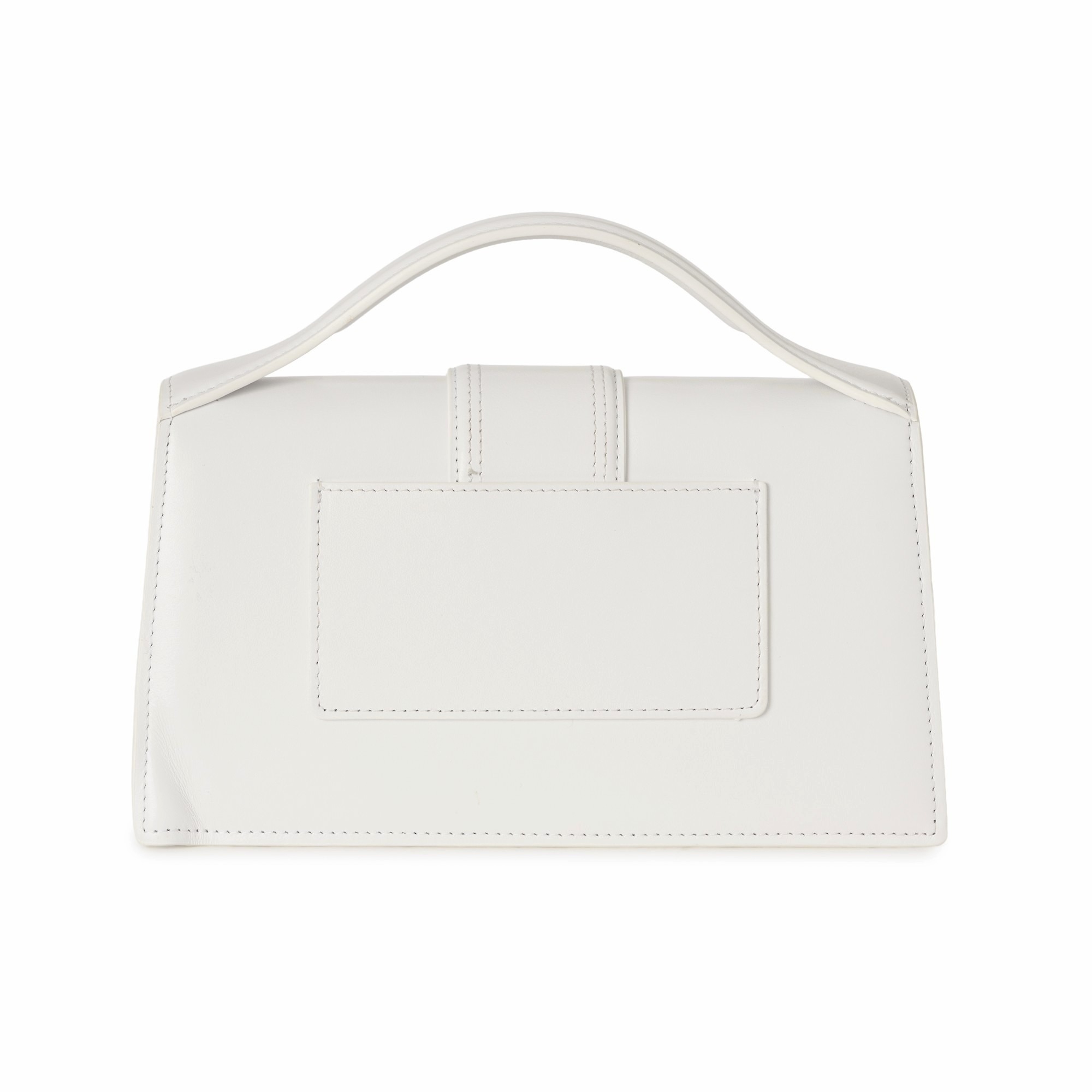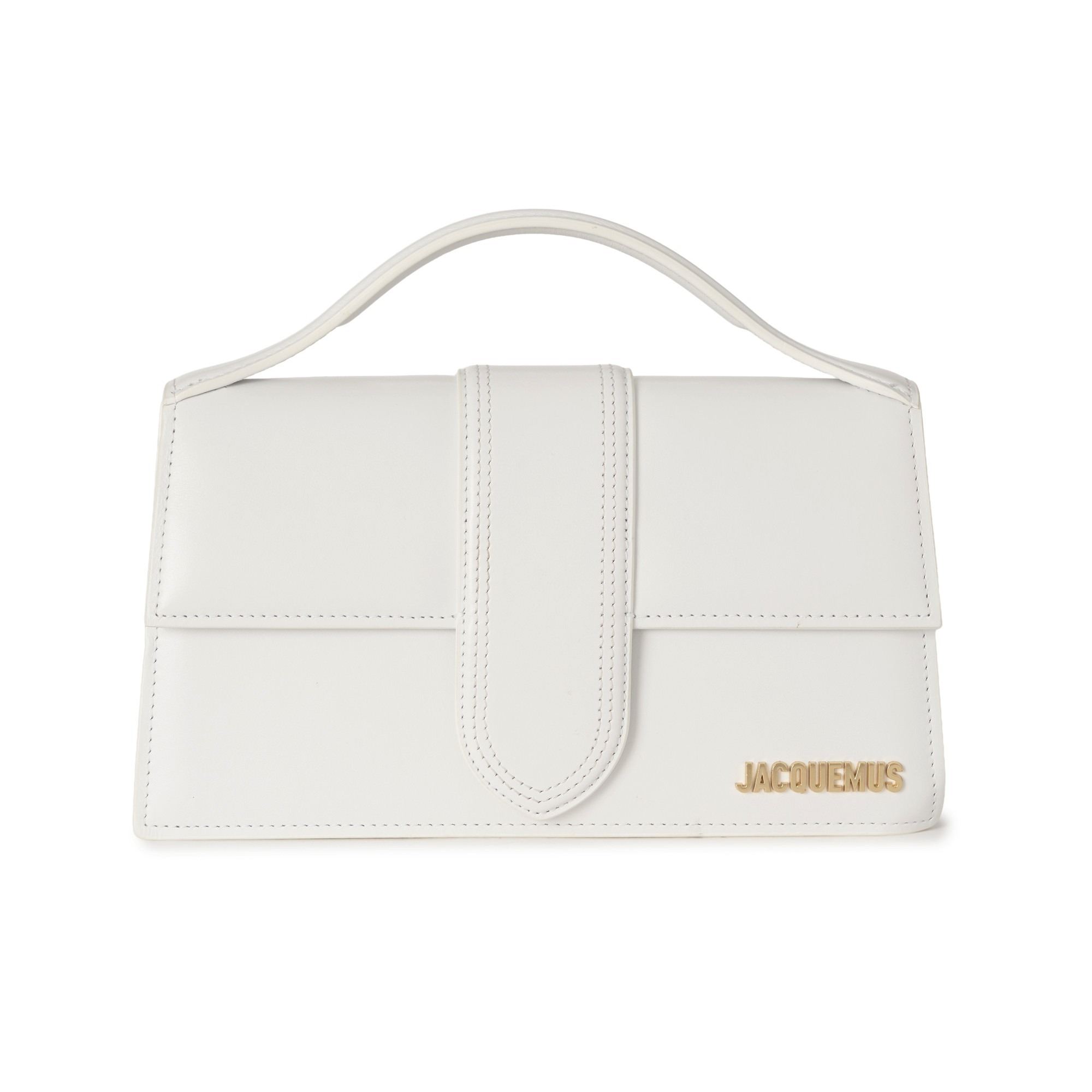 Jacquemus, a Le Grand Bambino handbag, crafted from white leather, with gold-tone hardware, front name plaque, single rigid top handle, detachable crossbody strap, magnetic flap closure and cream canvas lining, measuring 7 by 13 by 23.5cm, with maker's dust bag and purchase tag