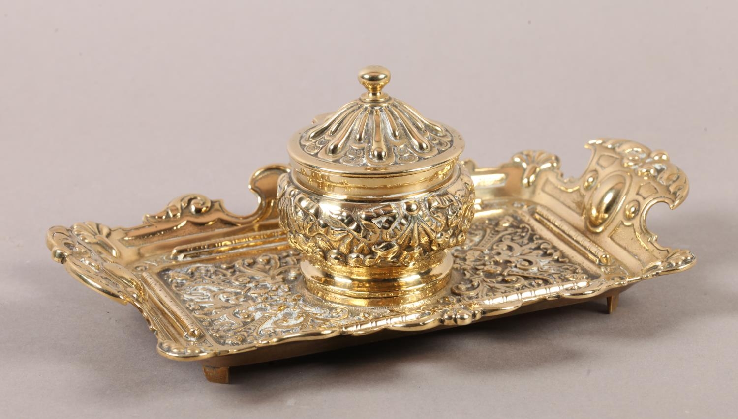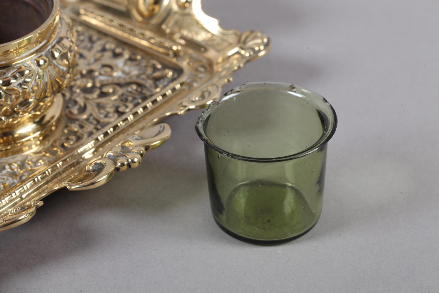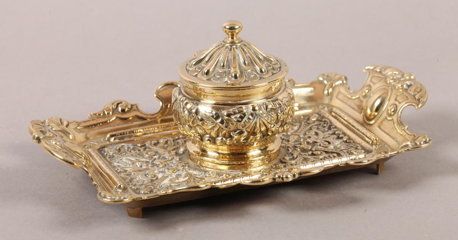 A Victorian brass desk standish fitted with a central inkwell and cover cast with ribboned harebells, green glass liner, the tray with upturned rim and handles, 23cm wide x 14cm deep