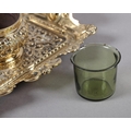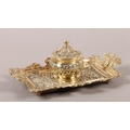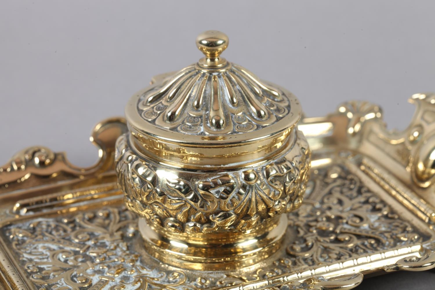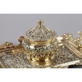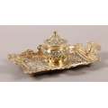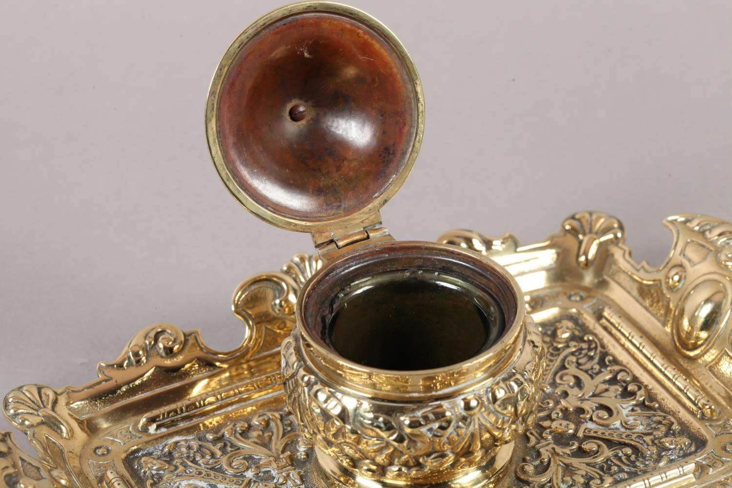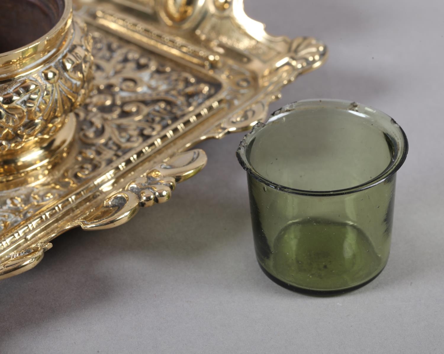 A Victorian brass desk standish fitted with a central inkwell and cover cast with ribboned harebells, green glass liner, the tray with upturned rim and handles, 23cm wide x 14cm deep