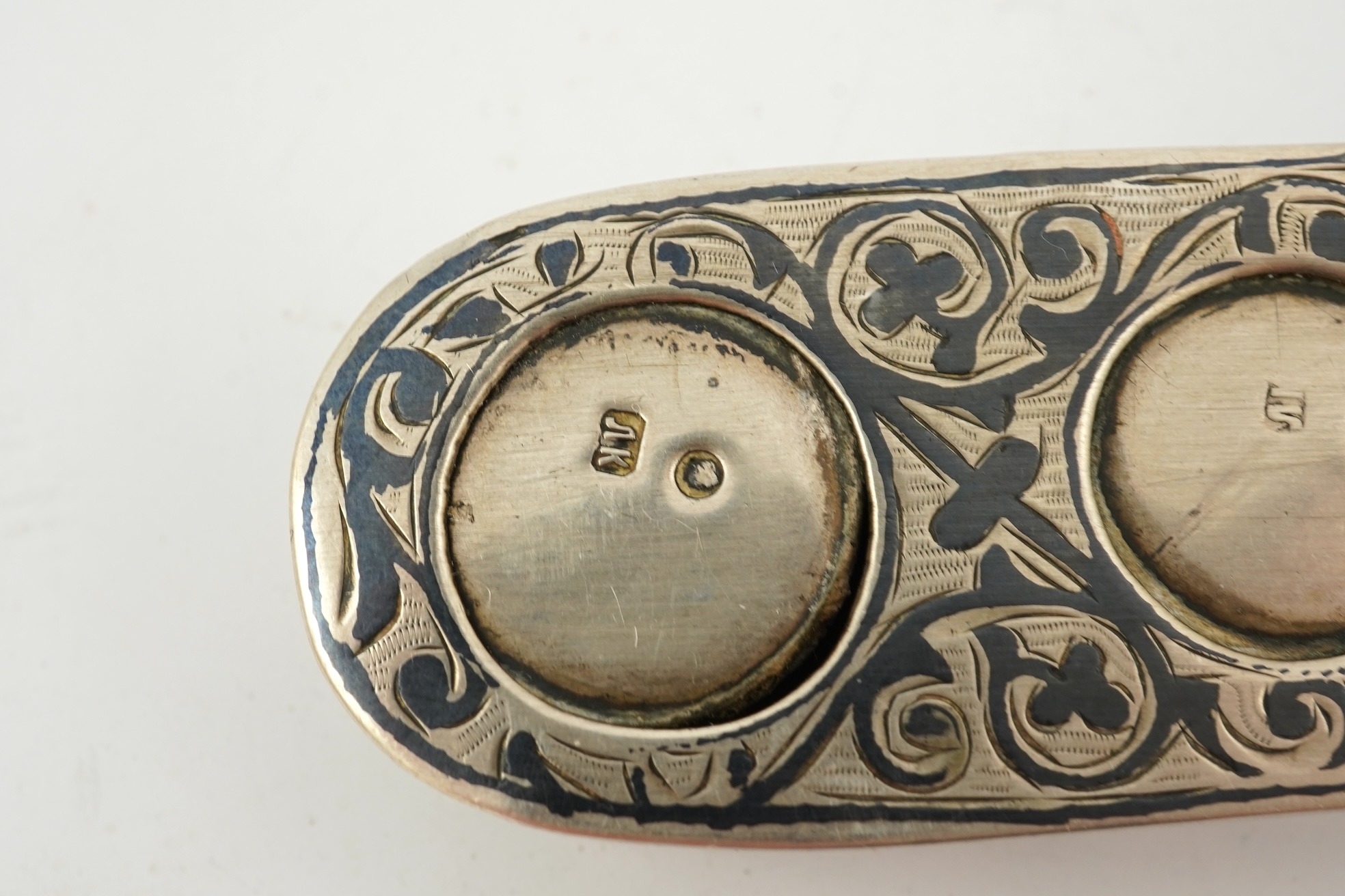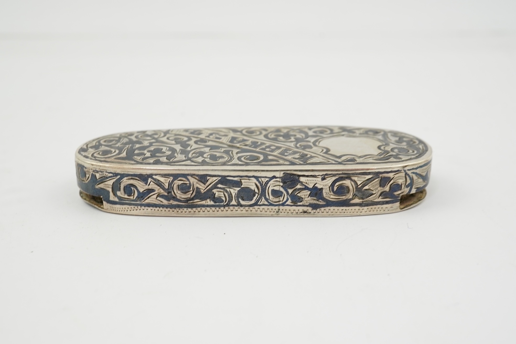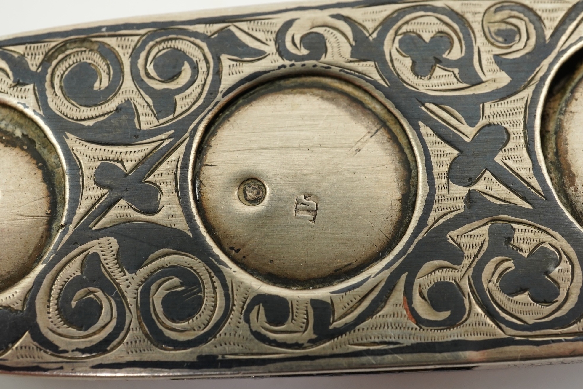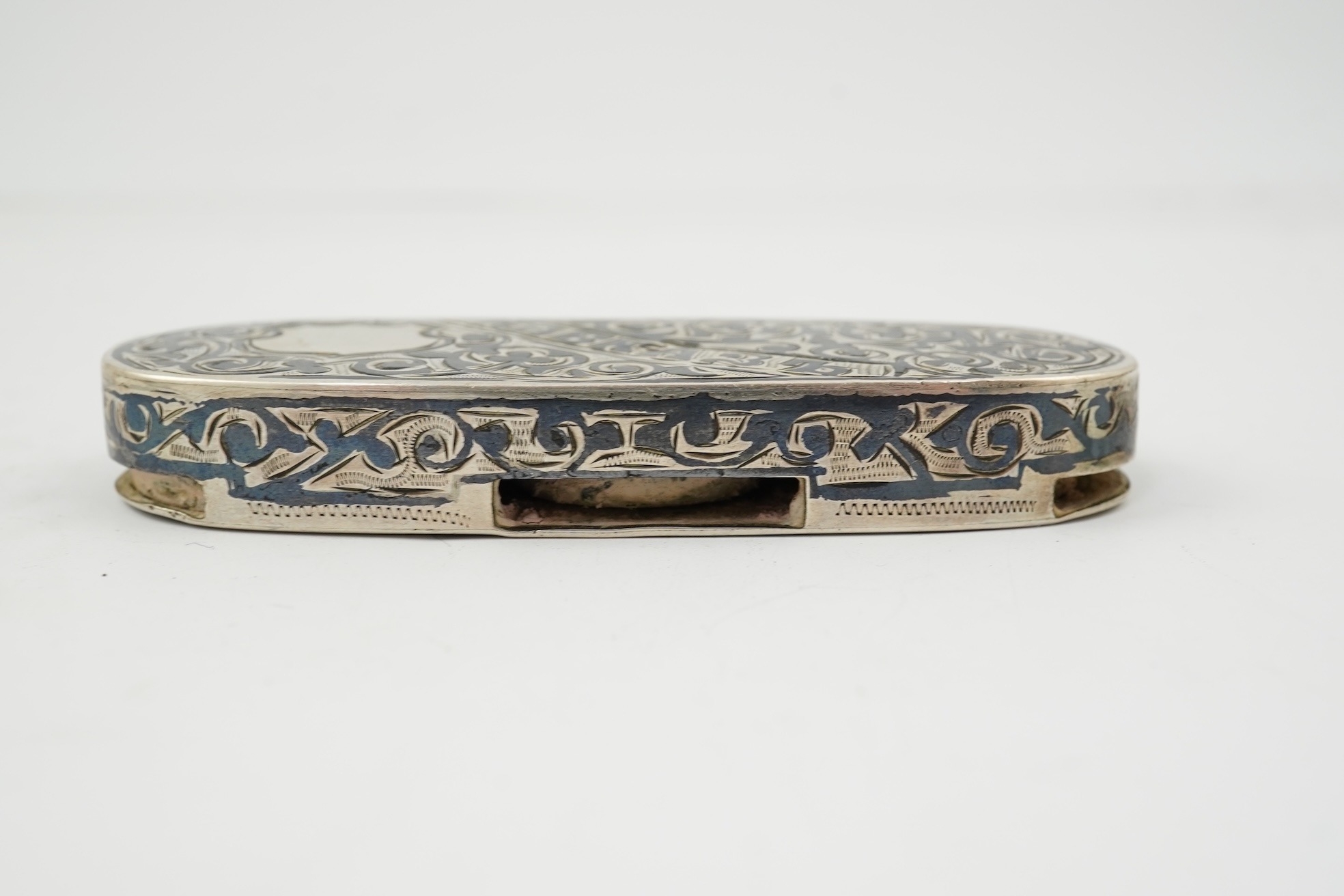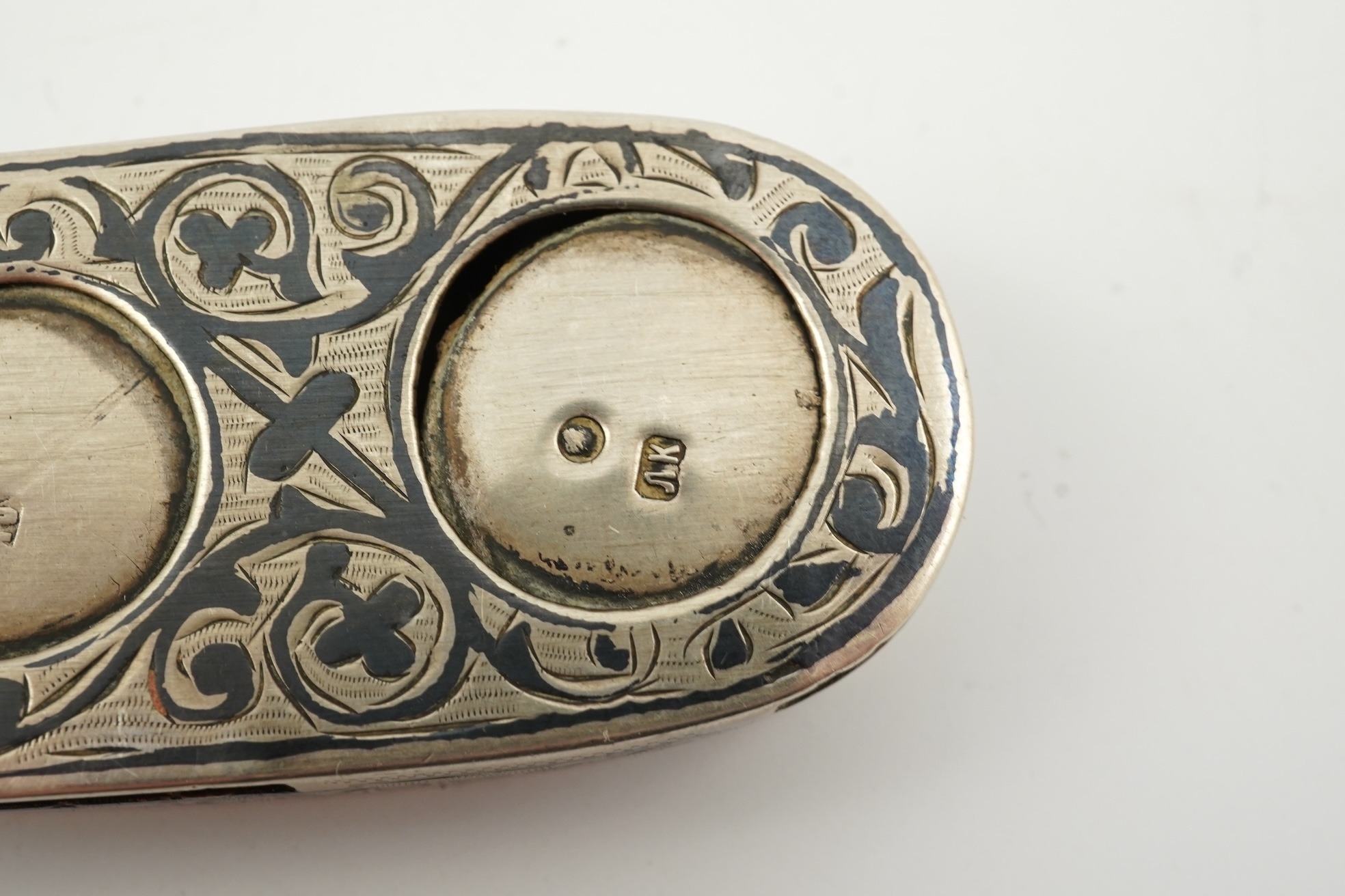 A 19th century Russian silver and niello coin case, of oval form, with Cyrillic inscription and three slide action coin compartments, unknown master, 76mm.