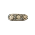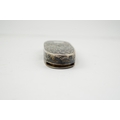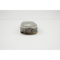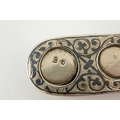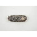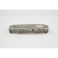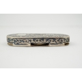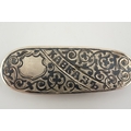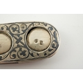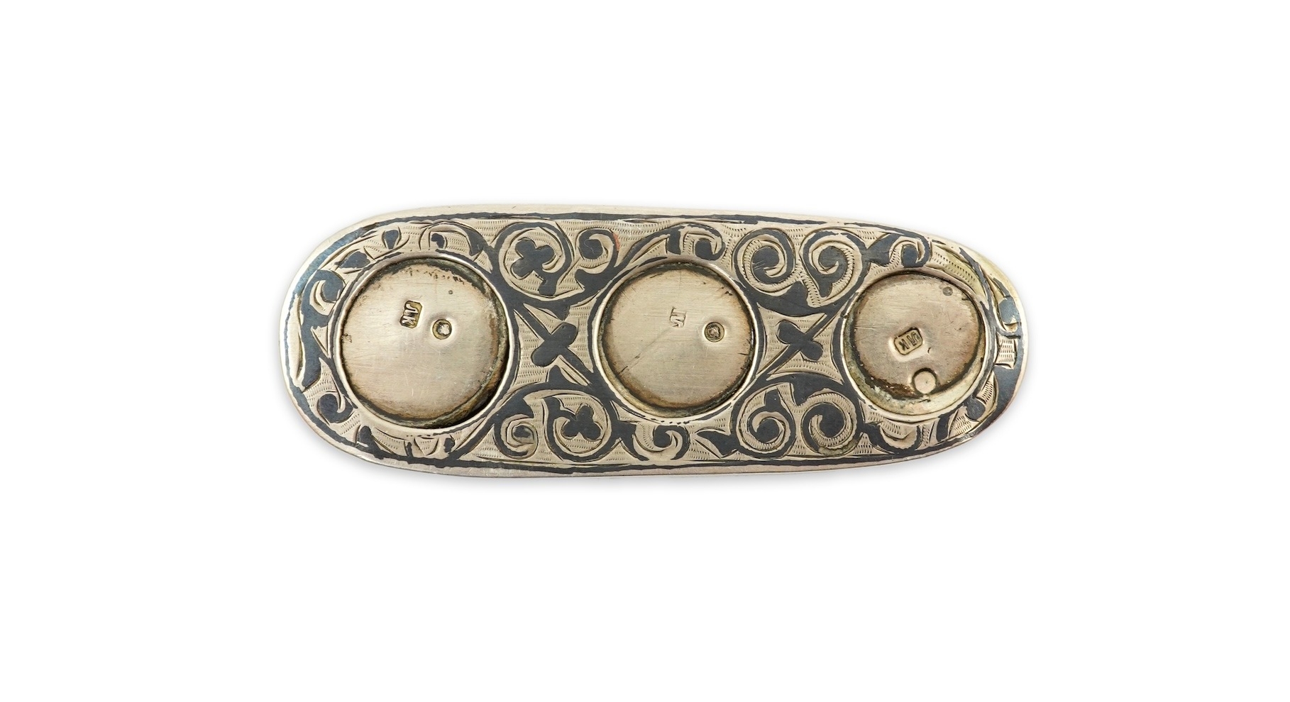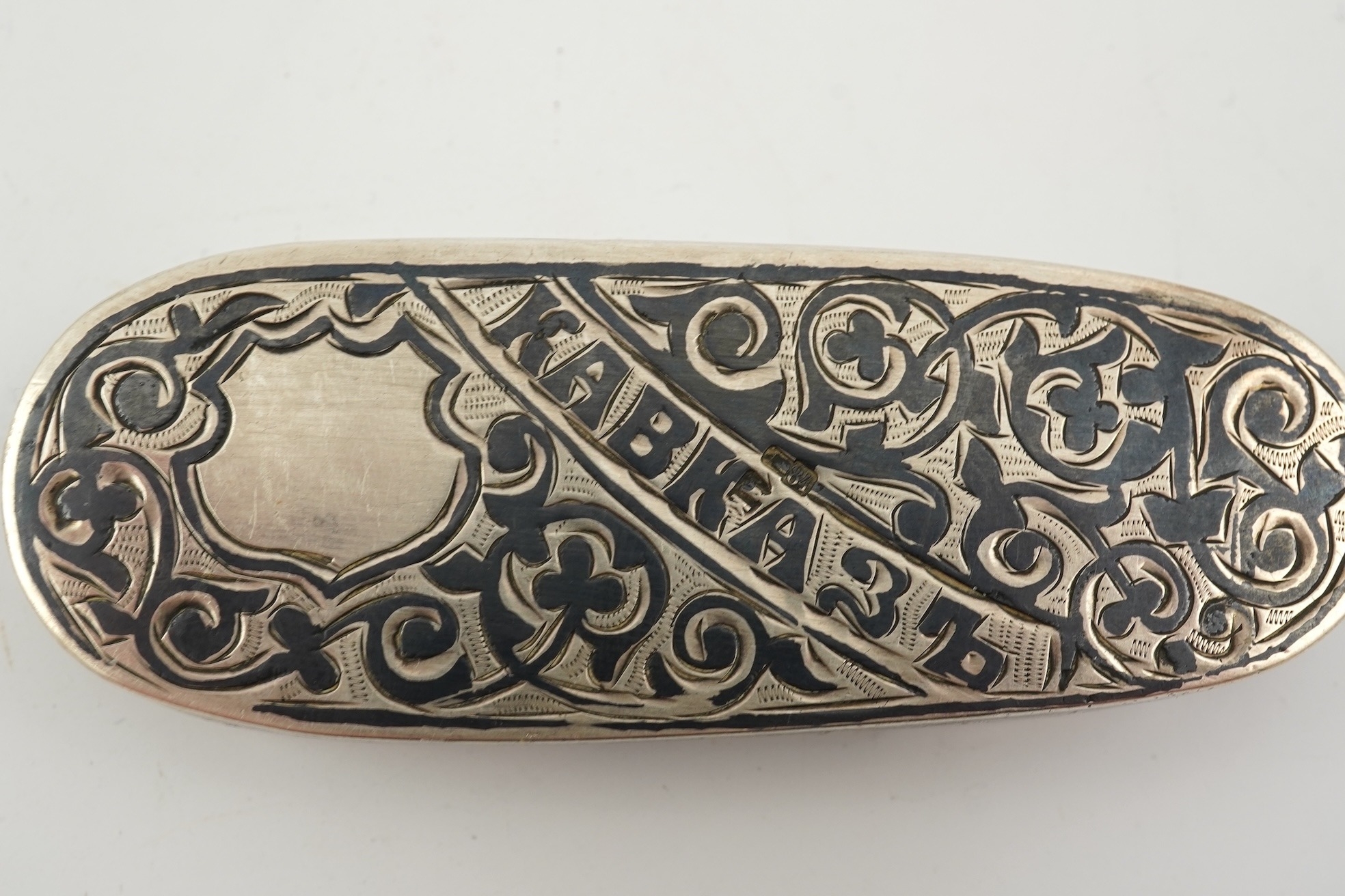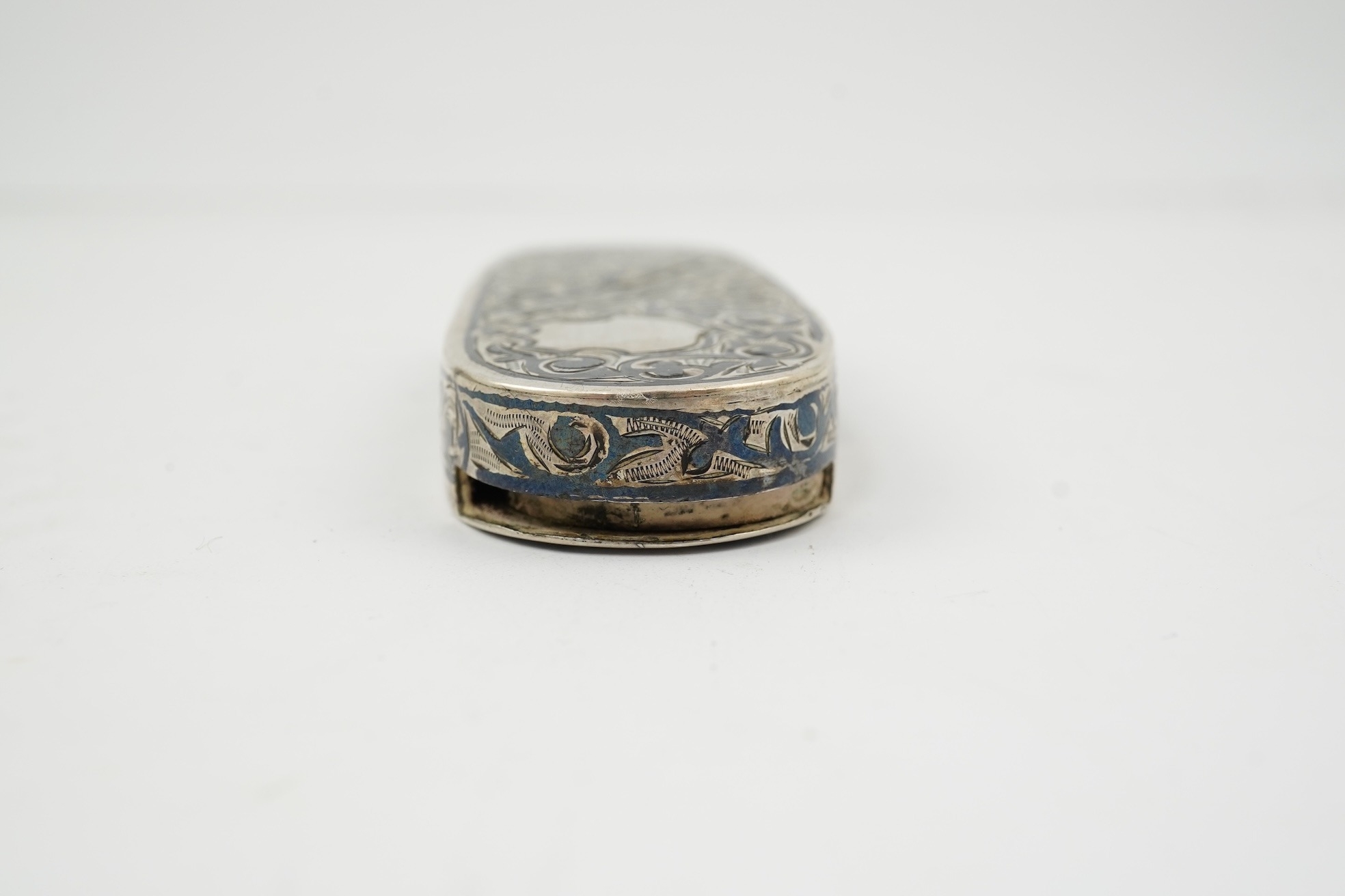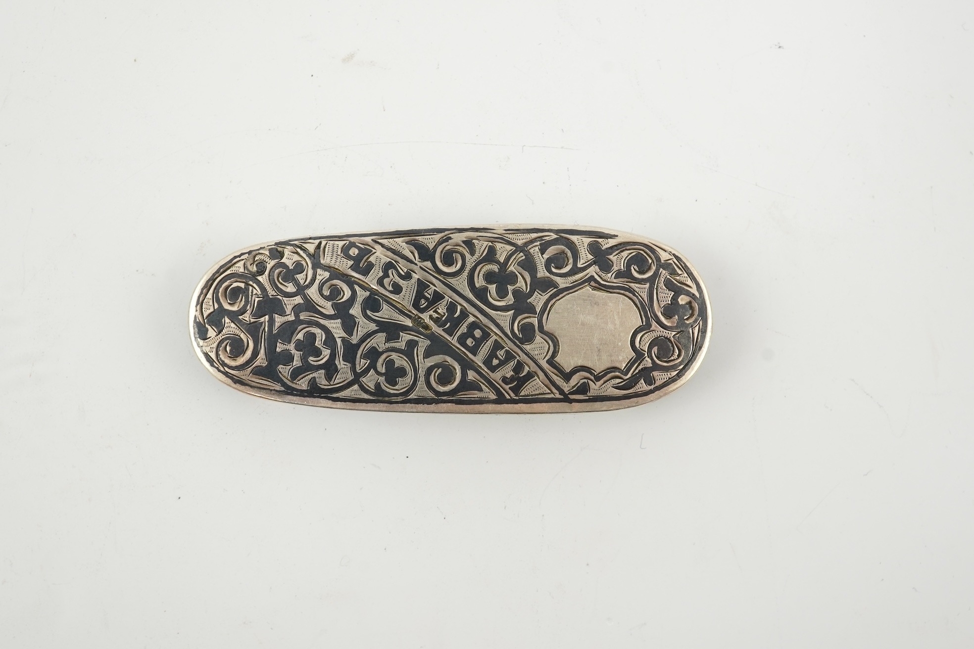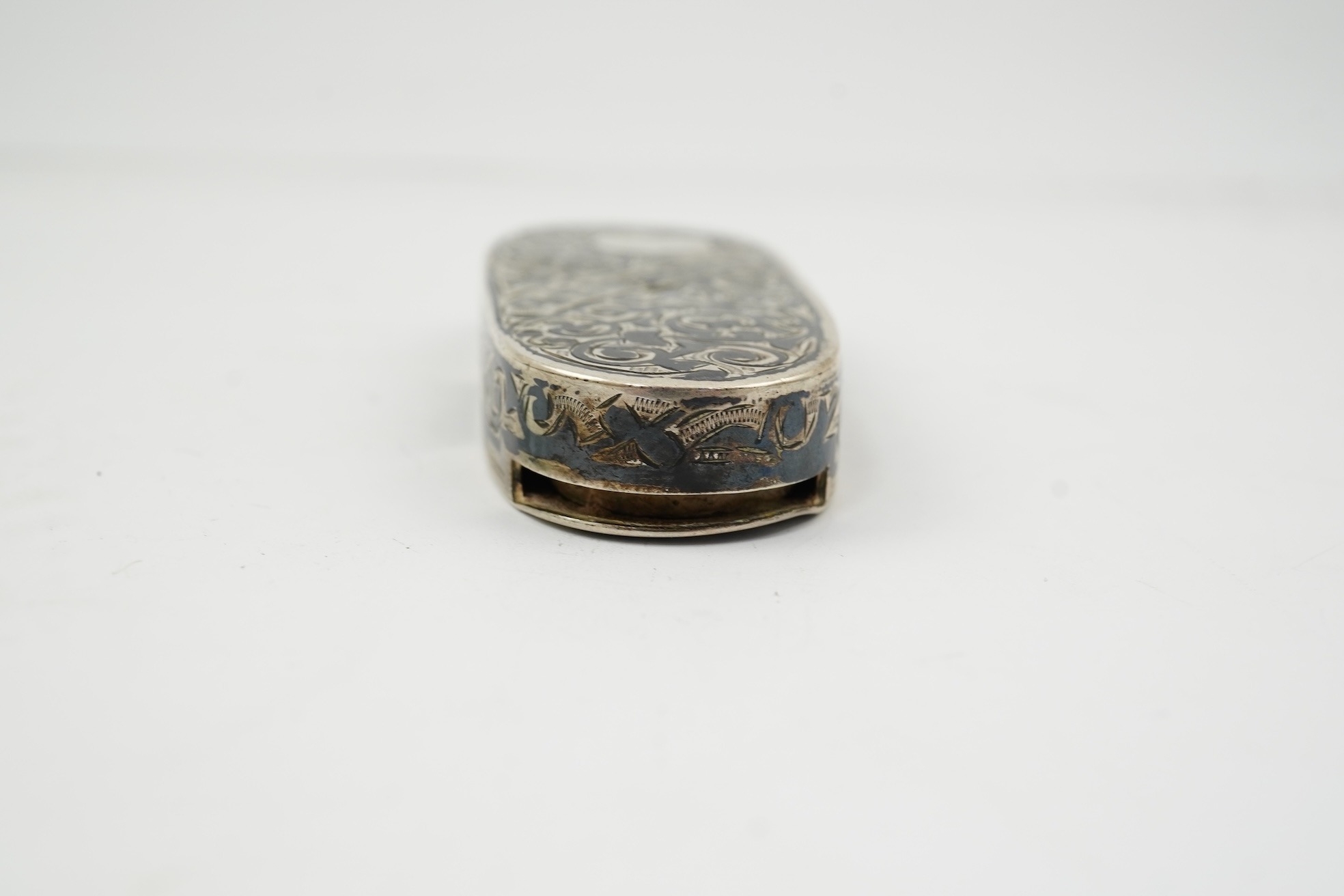 A 19th century Russian silver and niello coin case, of oval form, with Cyrillic inscription and three slide action coin compartments, unknown master, 76mm.