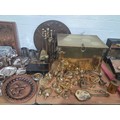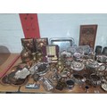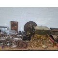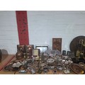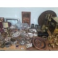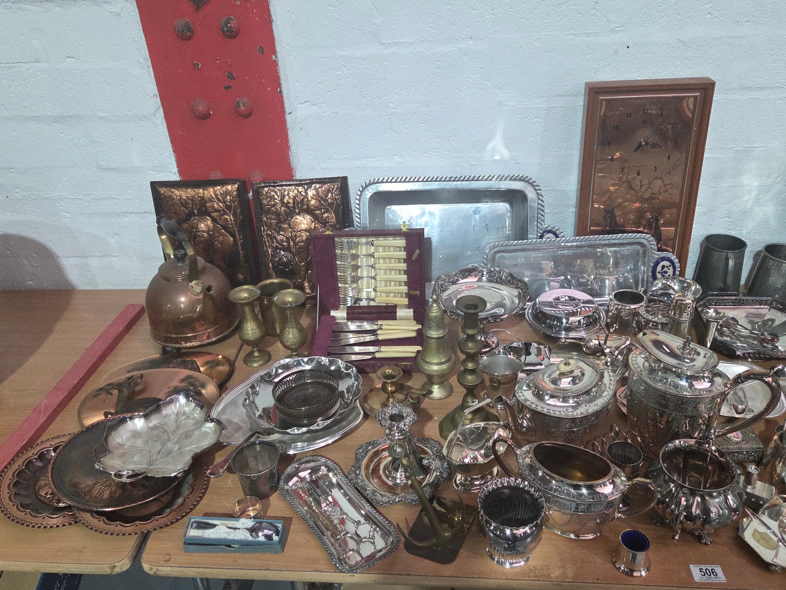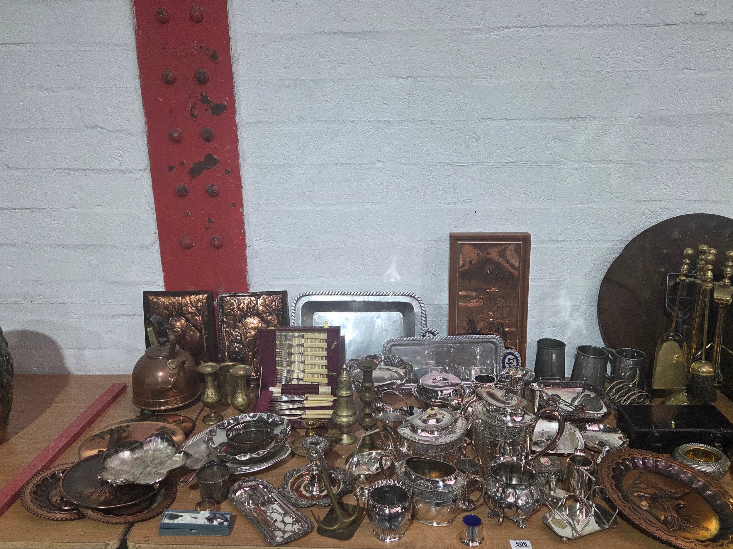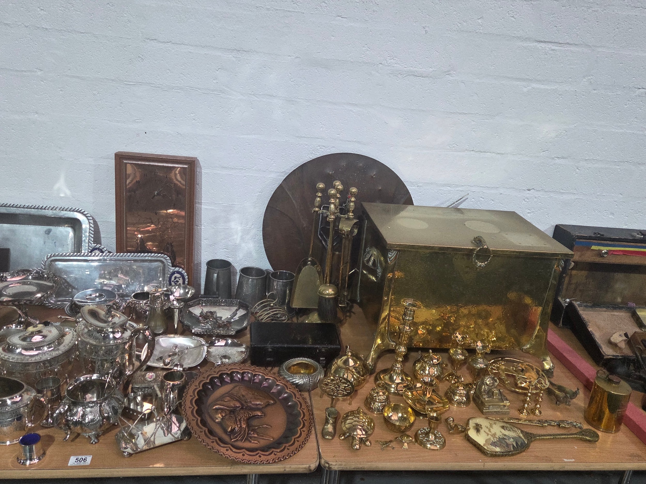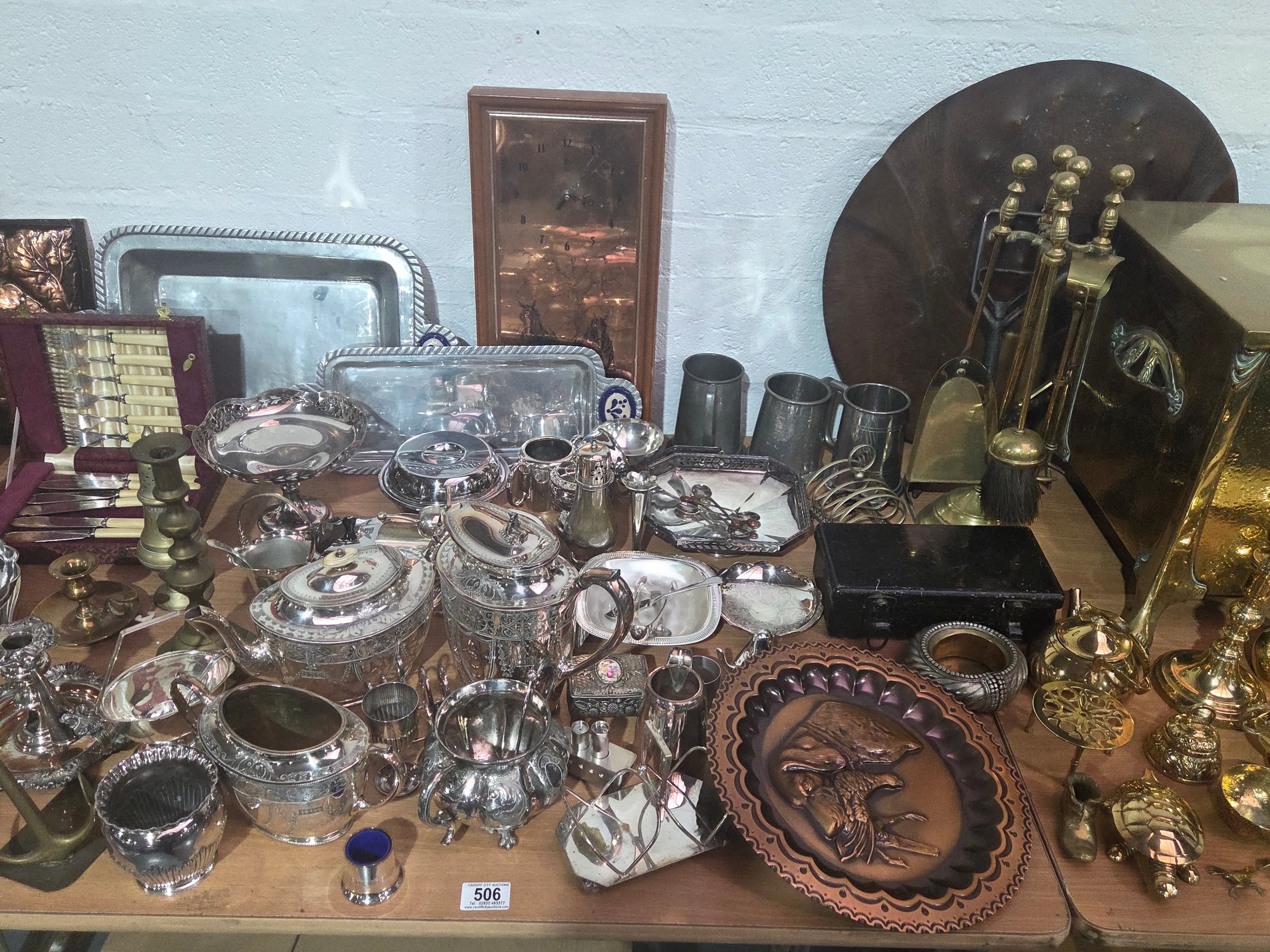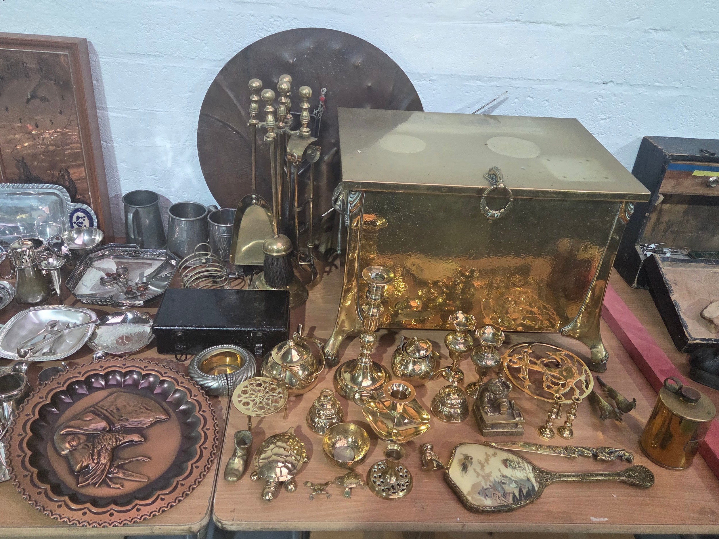 A brass coal box, companion set, copper kettle, silver plated teapots, vases and other metalware
