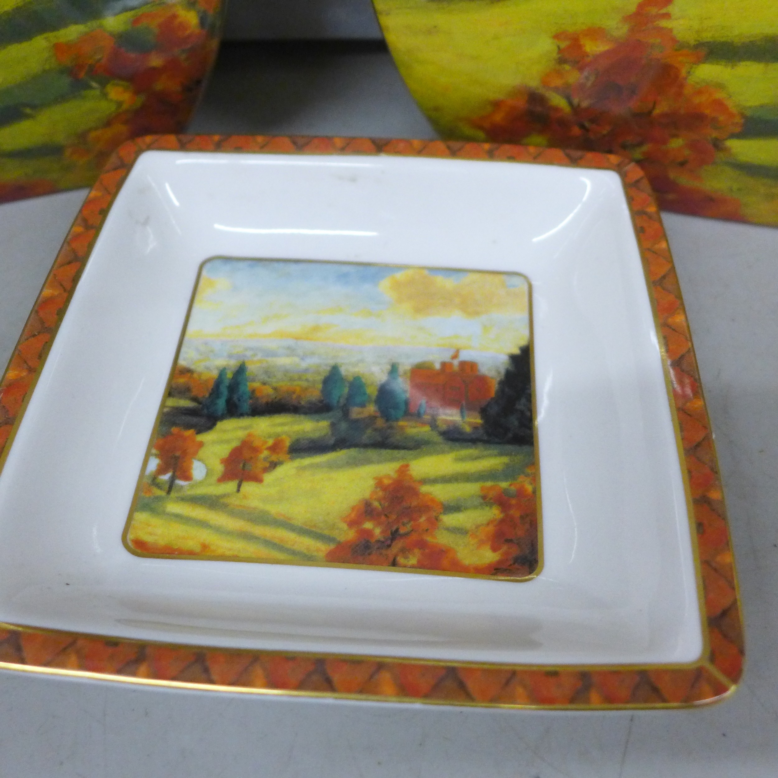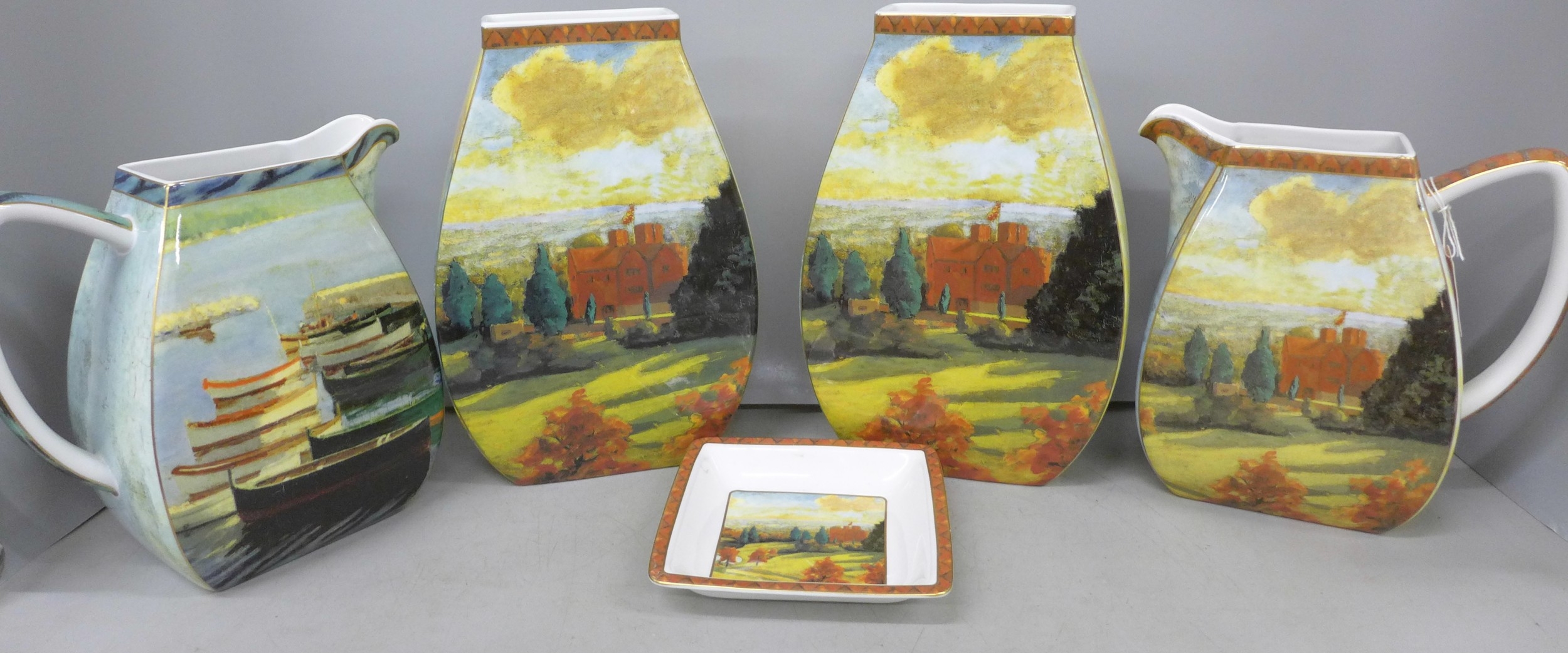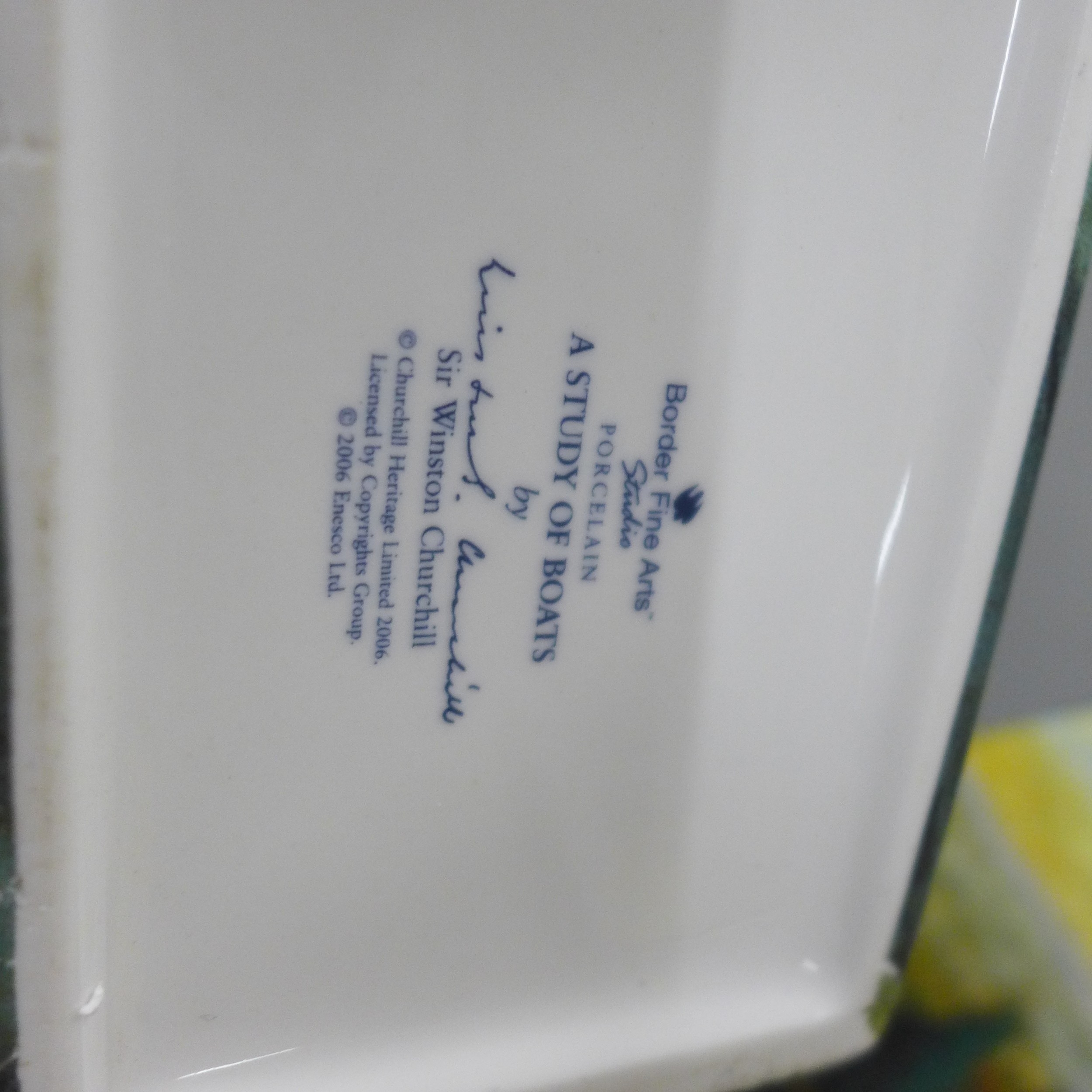 A pair of Border Fine Arts Sir Winston Churchill View at Chartwell vases, a similar jug and small tray/dish, together with A Study of Boats jug with box
