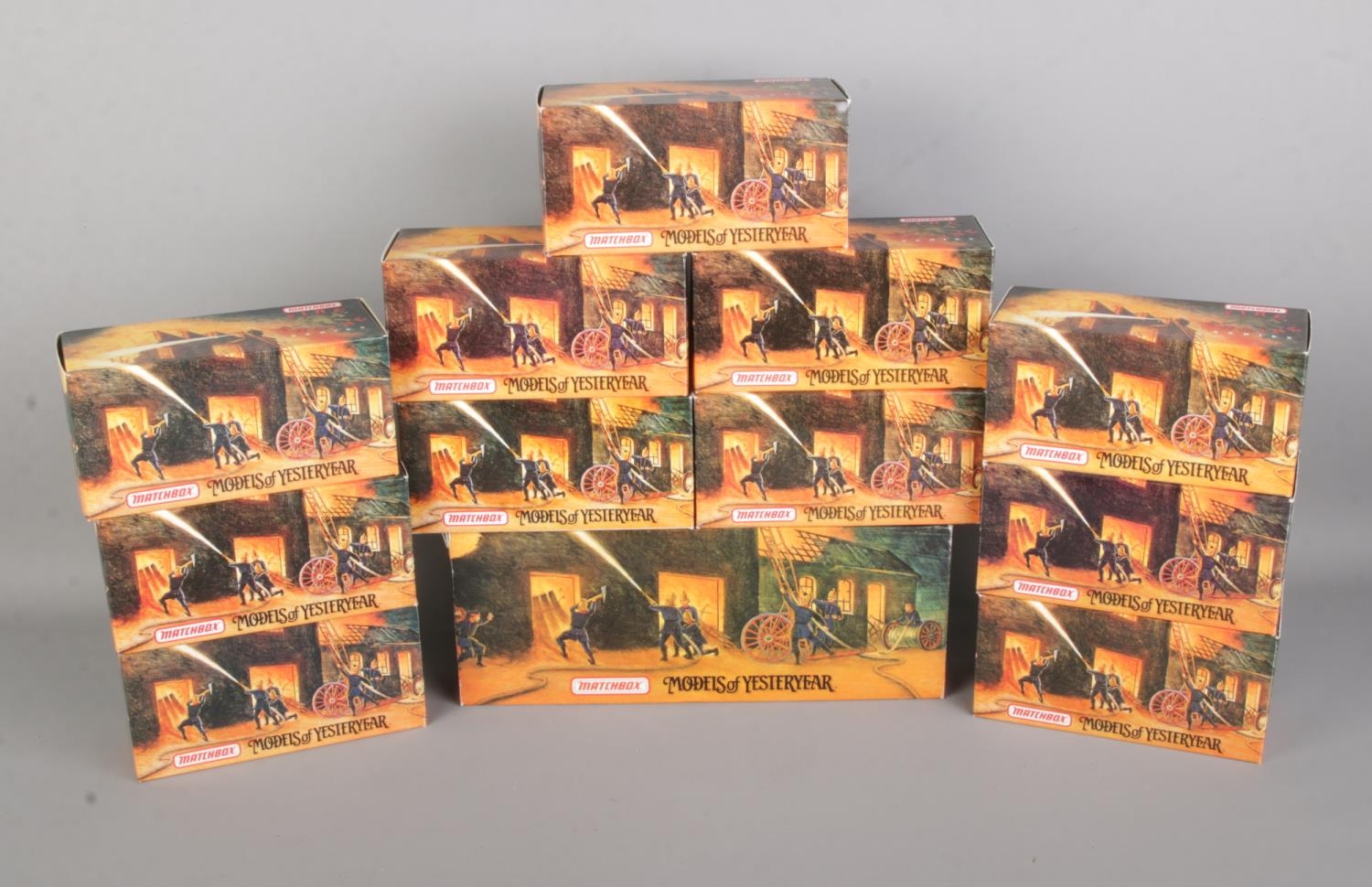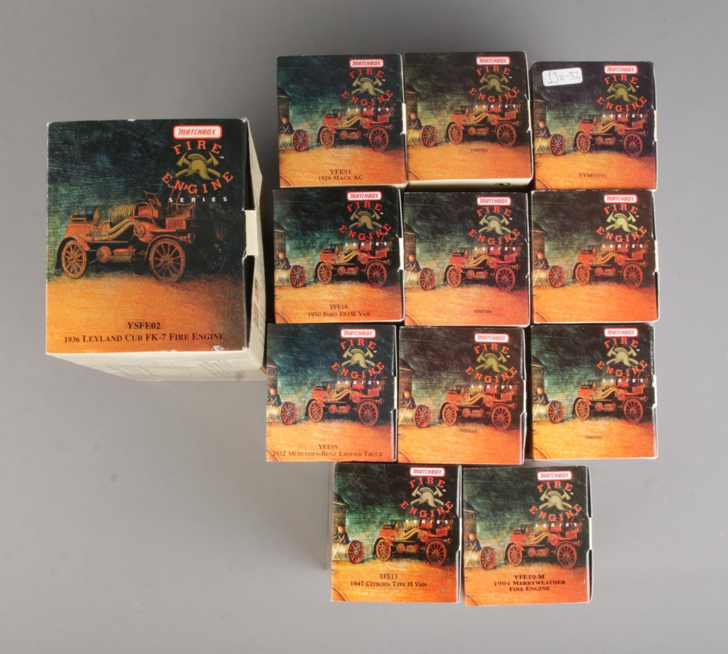 A collection of twelve boxed Matchbox Models of Yesteryear Fire Engine Series diecast vehicles to include YSFE02 1936 Leyland Cub FK-7, YFE19-M 1904 Merryweather, YFE05 1932 Mercedes-Benz Ladder Truck, etc.