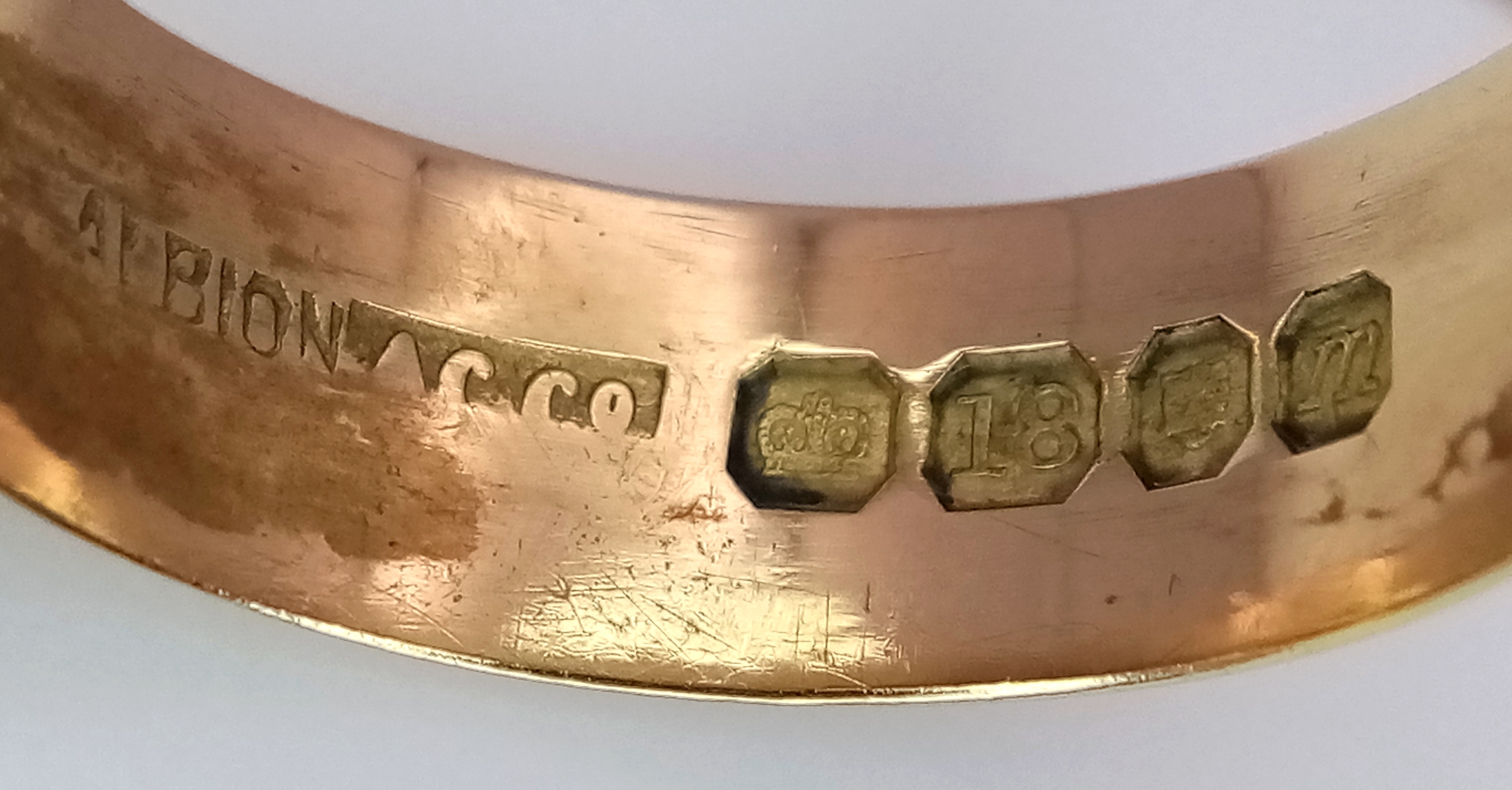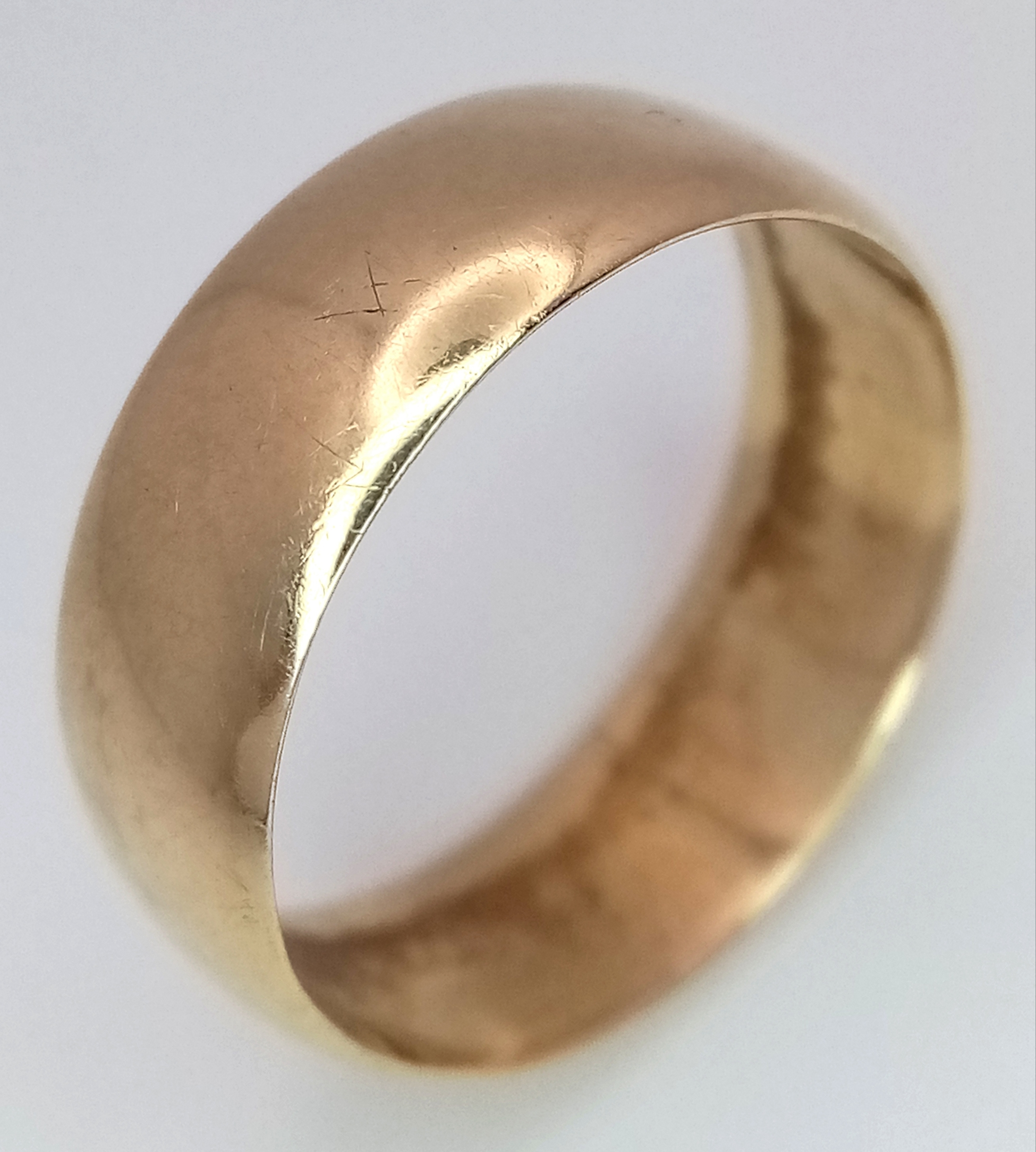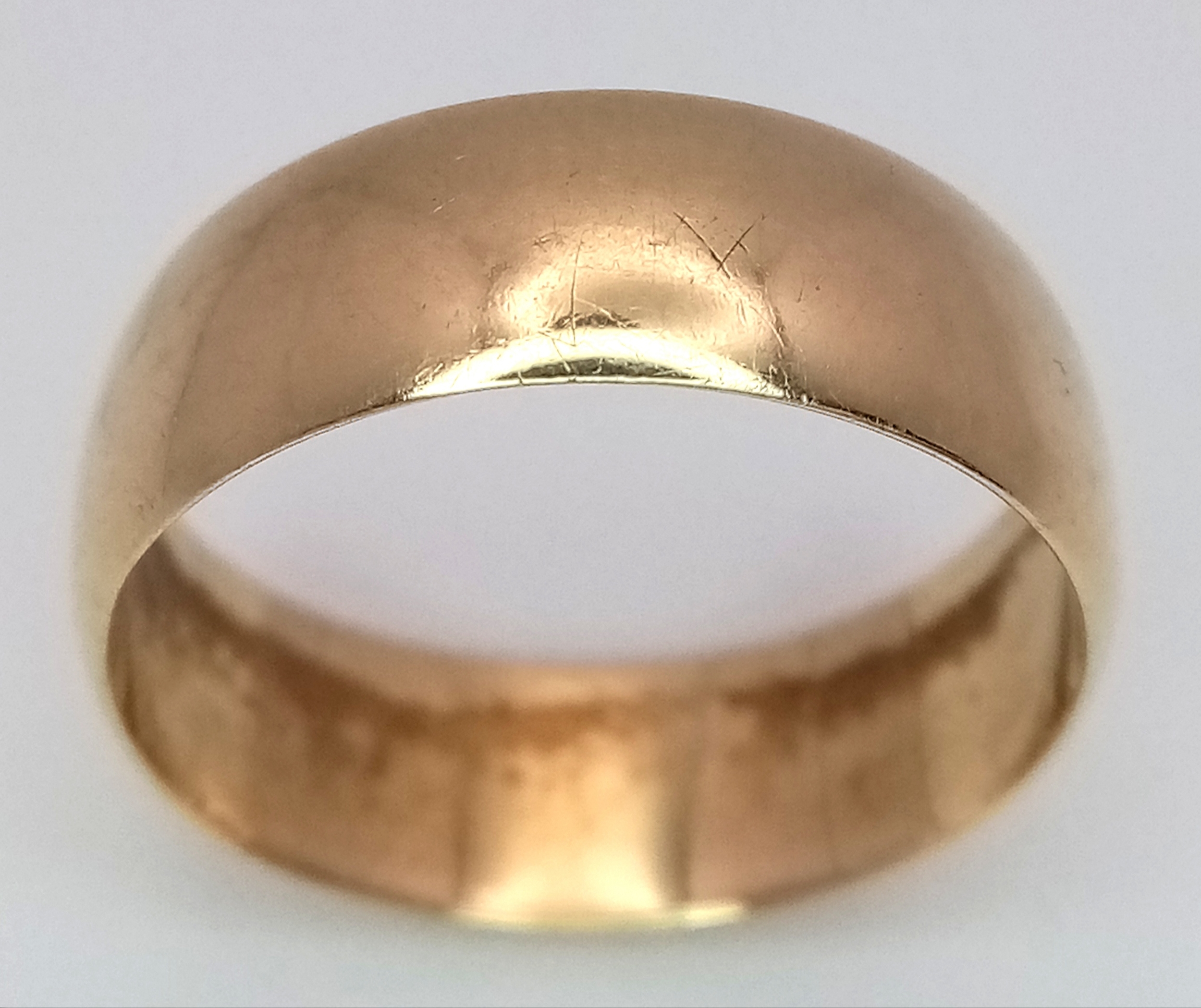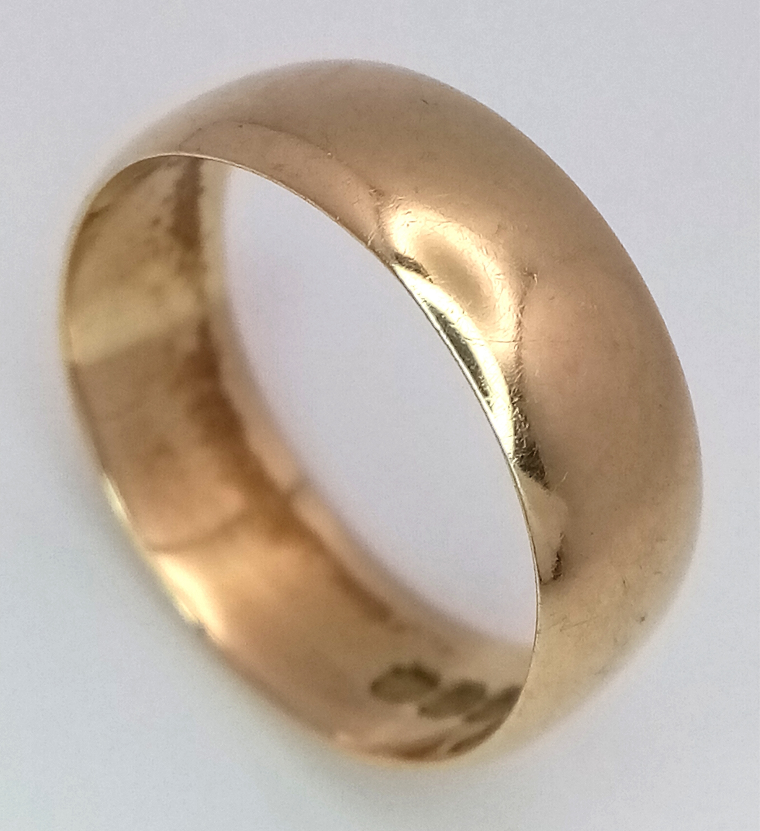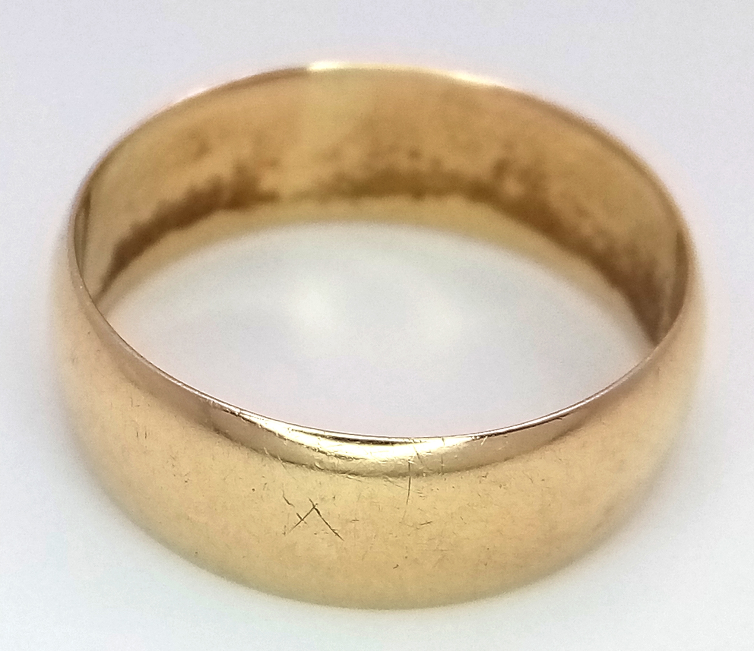 An 18K Yellow Gold Band Ring. UK hallmarks. 7mm width. size N. 4.05g.