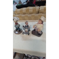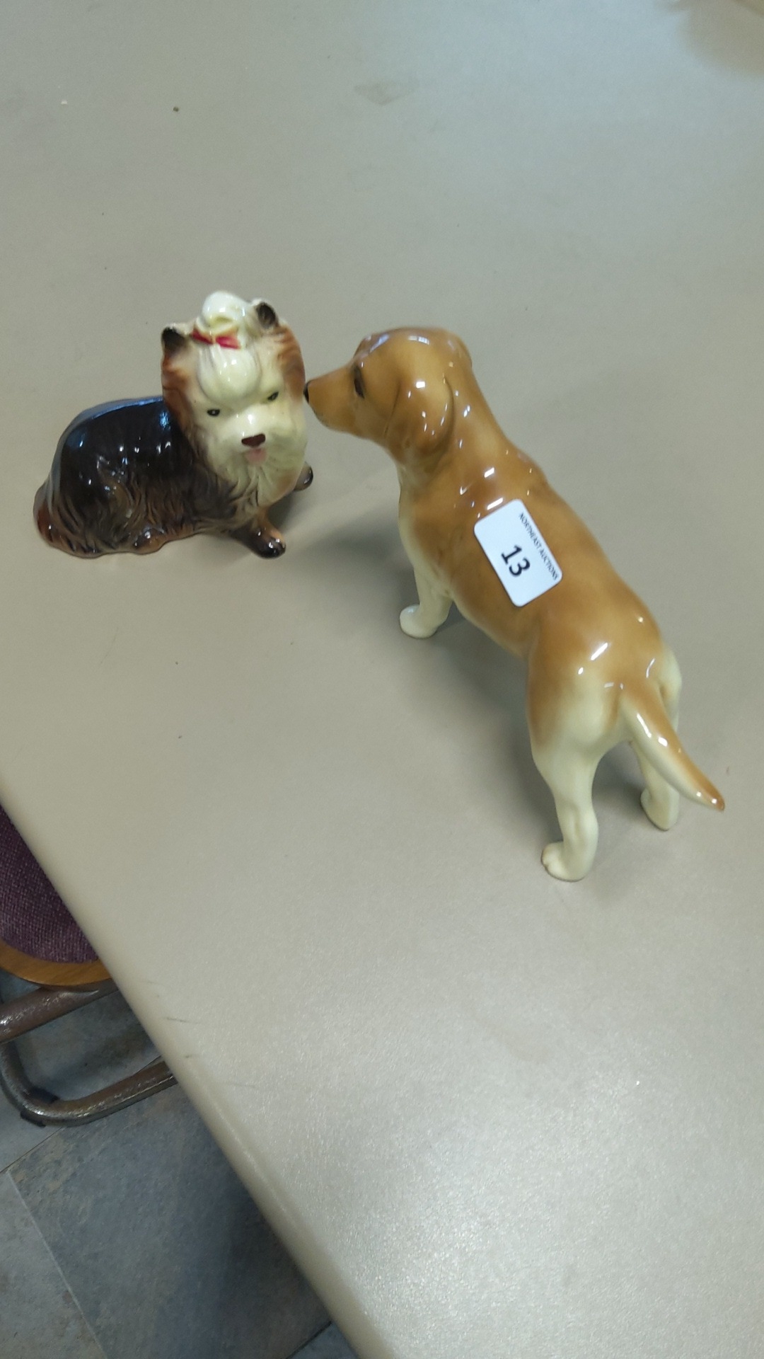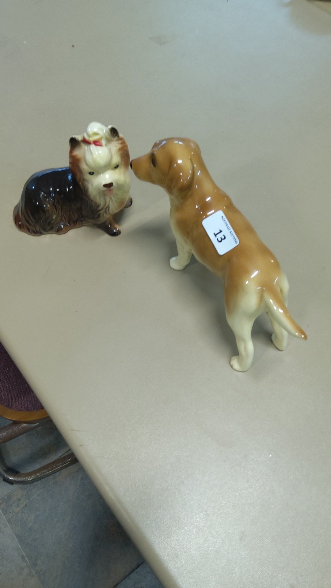 Pair of glazed porcelain dog figurines: a seated Yorkshire terrier with red bow and a standing golden retriever, each naturalistically hand-painted.