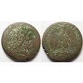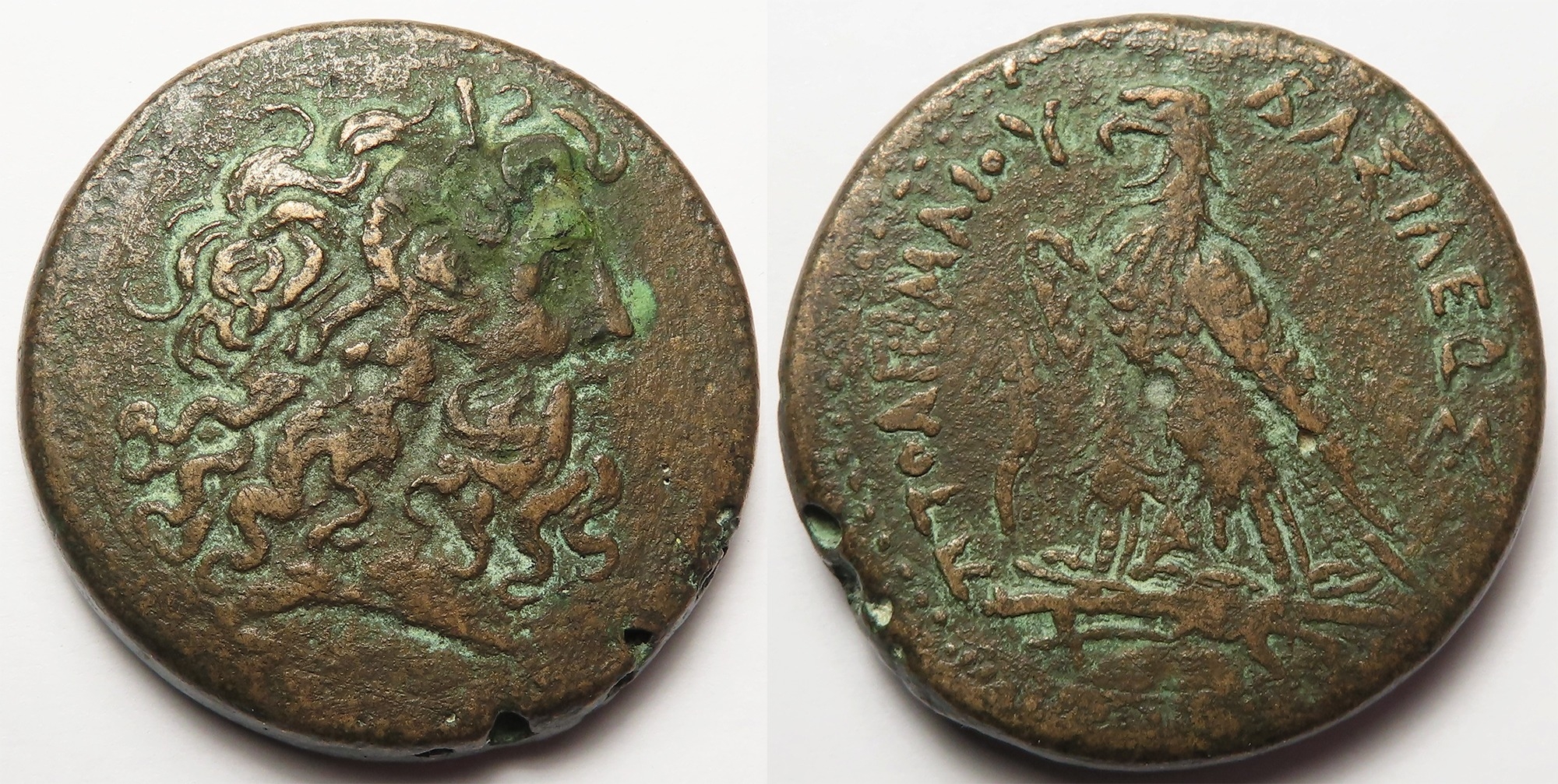 Ancient Greek: Ptolemaic Egypt, Ptolemy IV Philopator, 222-205/4 BC, AE Drachm 42mm, 64.5g, Alexandria mint. Diademed head of Zeus-Ammon right. / Eagle, with closed wings, standing left on thunderbolt; filleted cornucopia to left, ΛI between legs. Noeske 141-2. GF/F light porosity, some pitting in edge.
