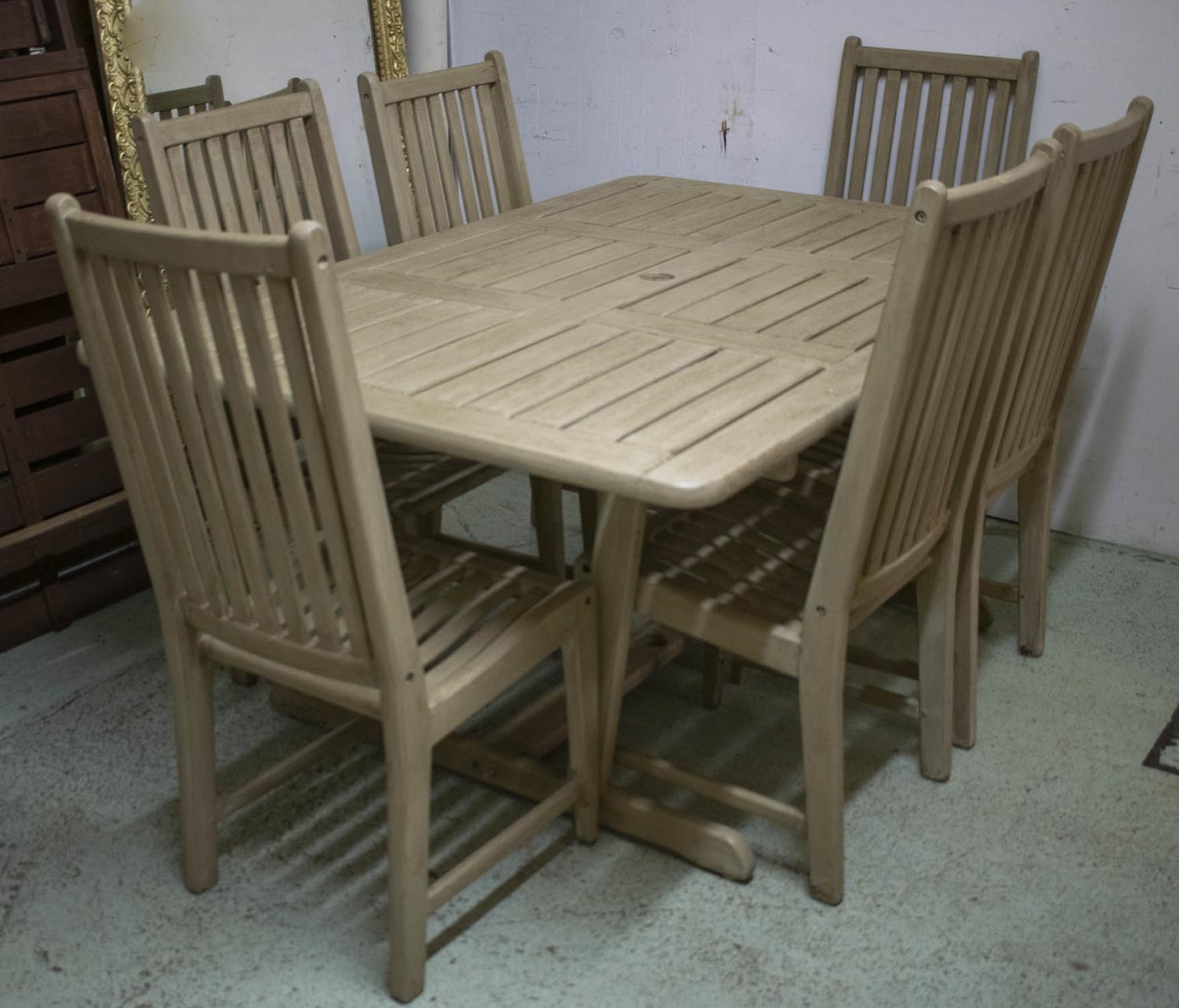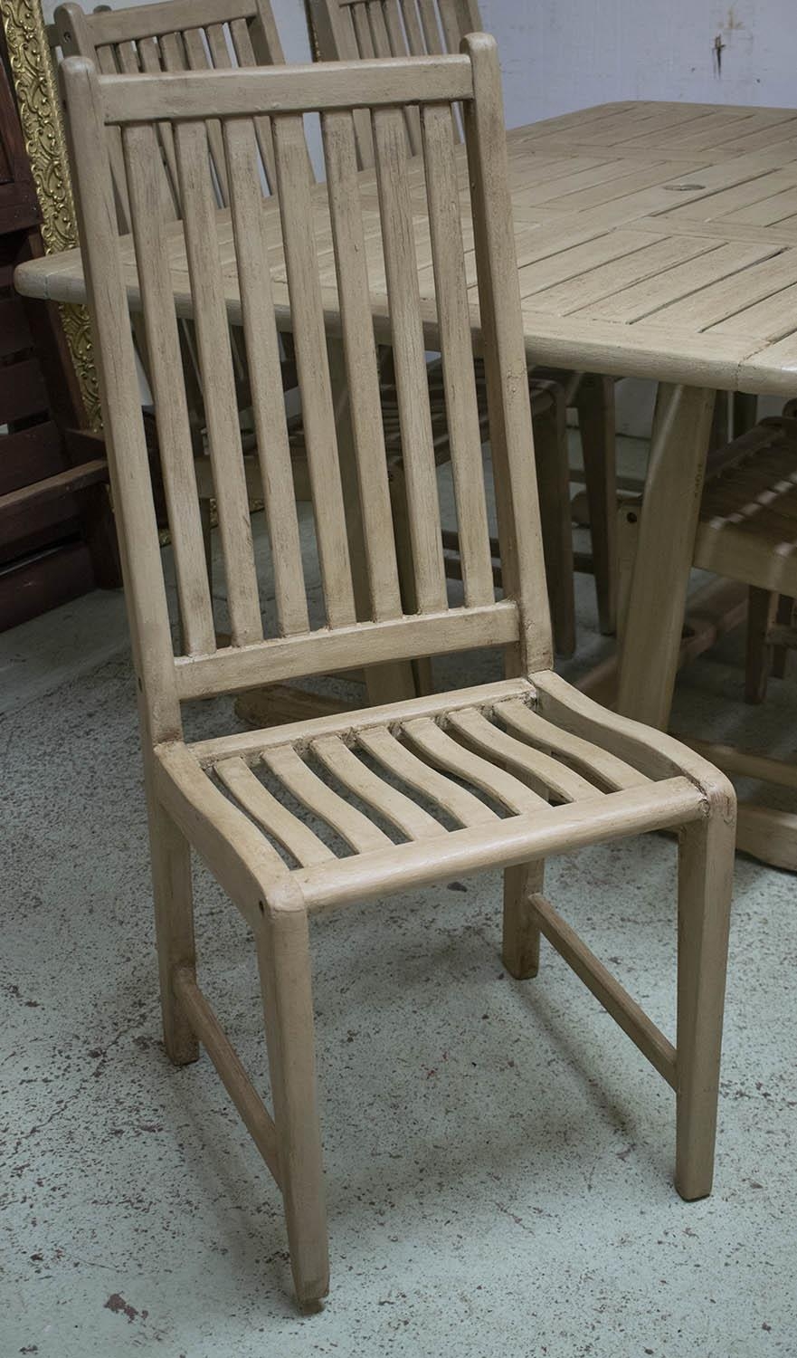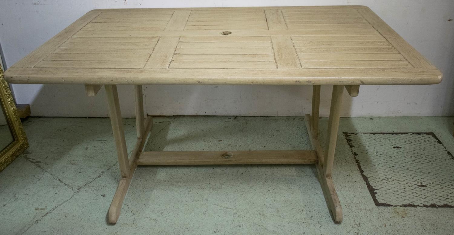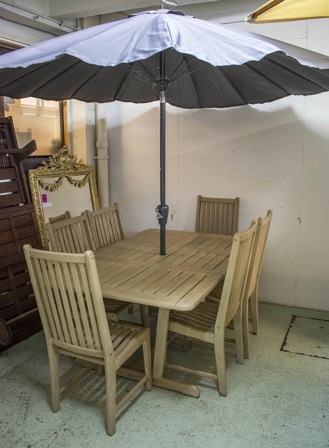 GARDEN SET, including table rectangular painted 73cm H x 160cm x 110cm a wind-out grey parasol and a set of six chairs. (7)