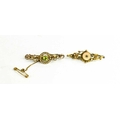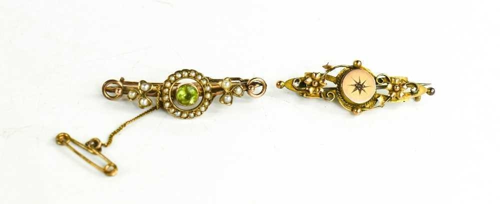 A Victorian 9ct gold, seed pearl and peridot brooch with safety chain, together with a Victorian 9ct gold brooch with starburst and diamond to the centre, flanked by two flowerheads, 4.9g.