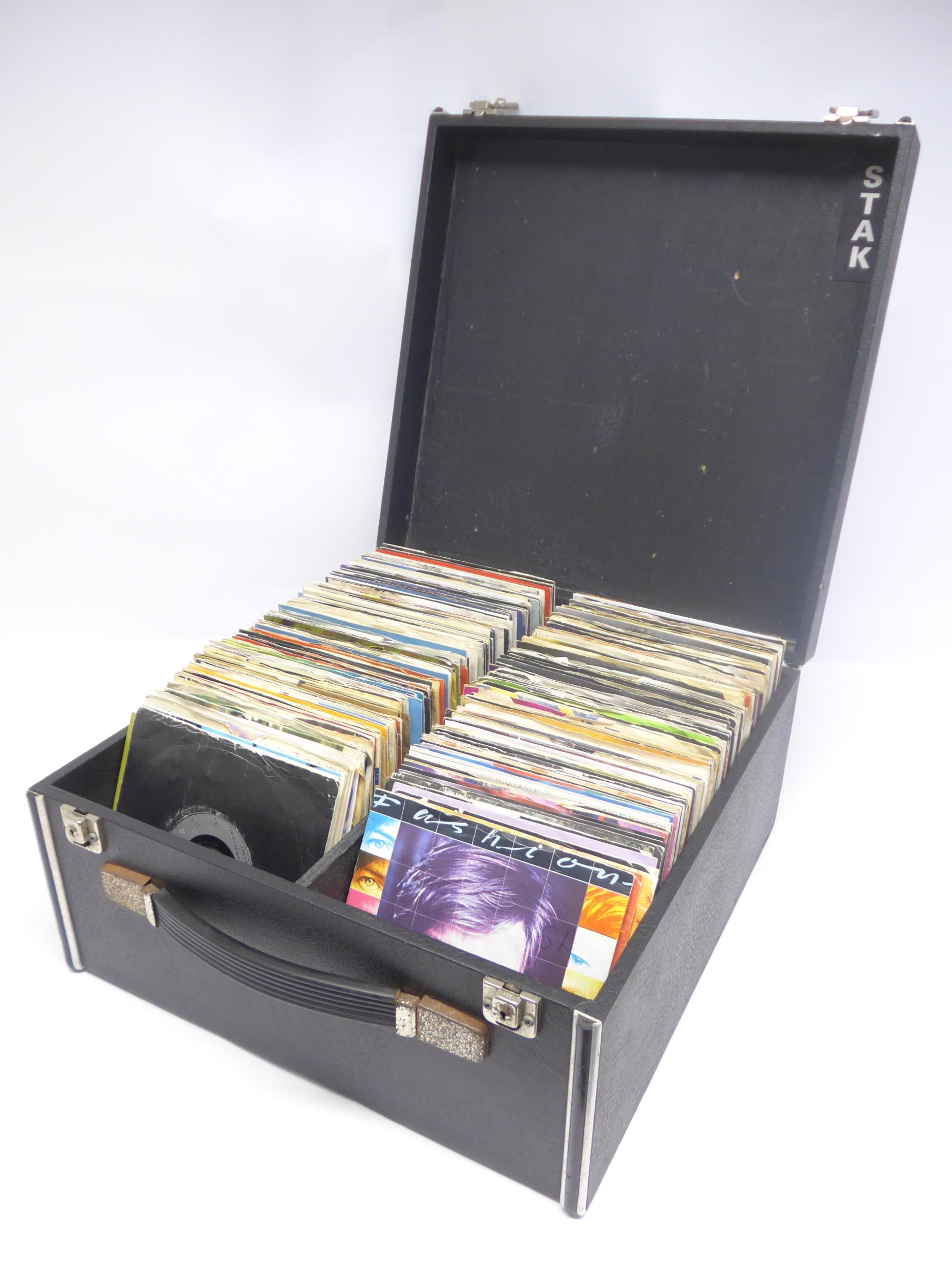A case of approximately three-hundred 7" singles, artists include The KLF, David Bowie, Frankie Goes To Hollywood, Bronski Beat, Banarama, Yello, Yazoo, Earth Wind & Fire, Sade, Status Quo, Marvin Gaye, Boyz II Men, Blondie, Donna Summer, Smoky Robinson, Dead Or Alive, Jennifer Rush, UB40, Bee Gees, Phil Collins, etc. (approx. 300, vinyl generally VG-VG+)