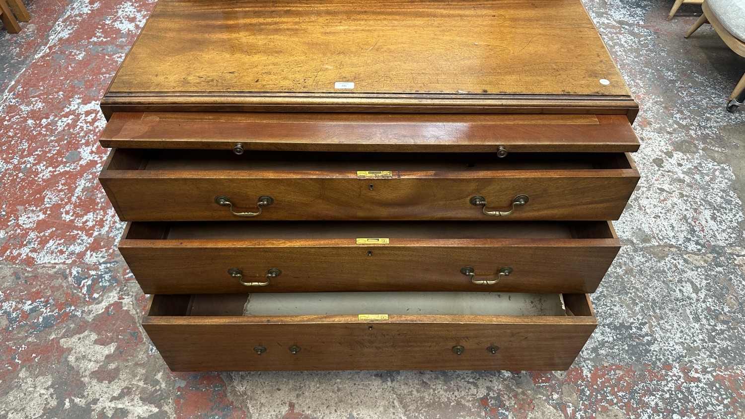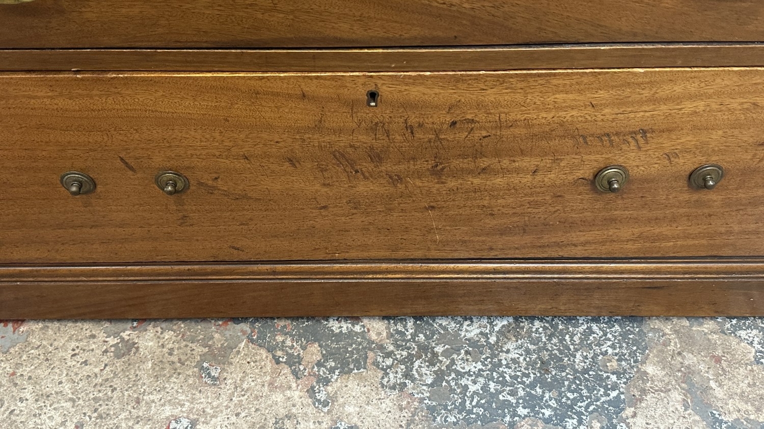 The lowest drawer is missing two handles, splits are visible to top, various scratches and scuffs can be seen.
