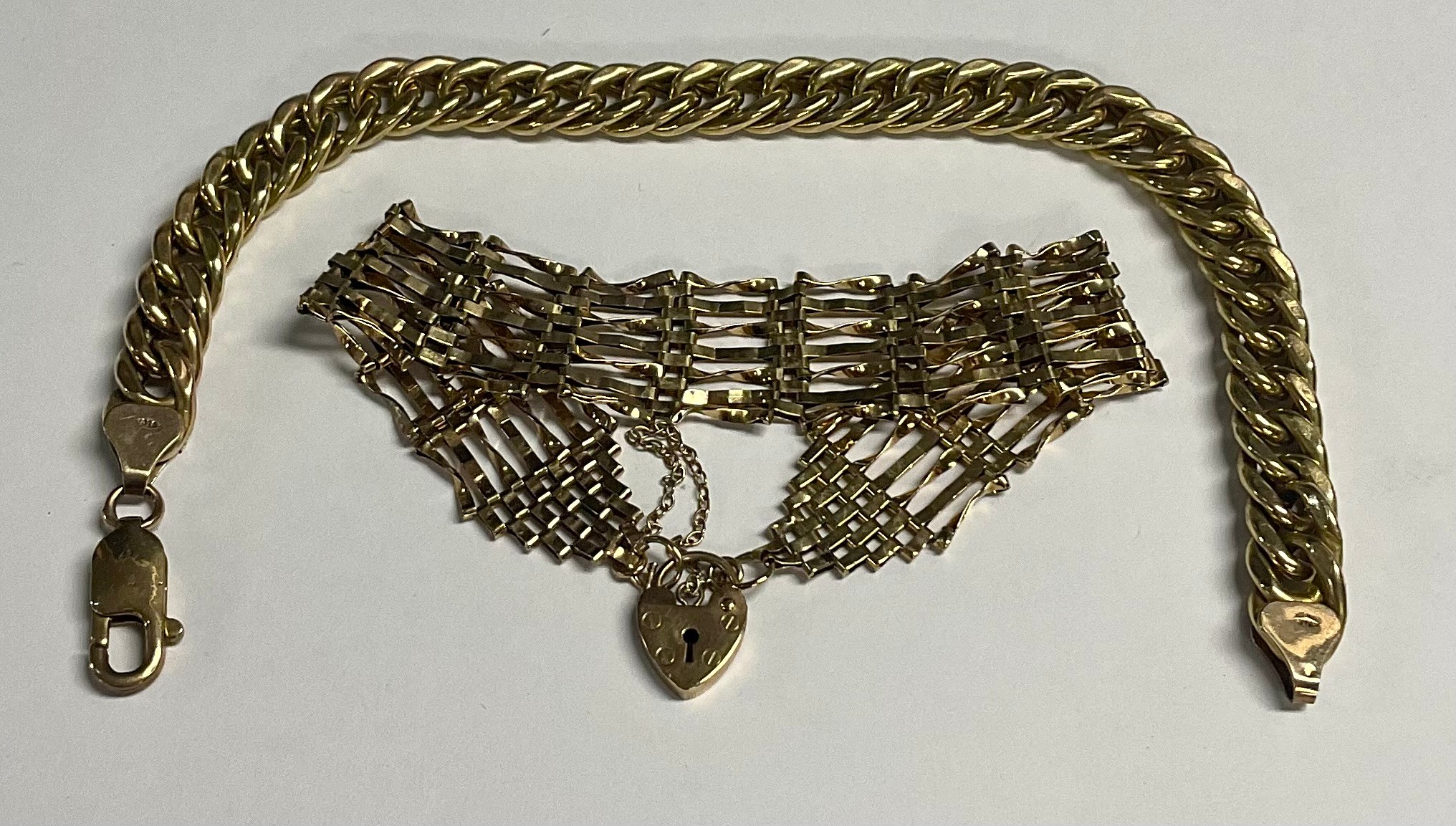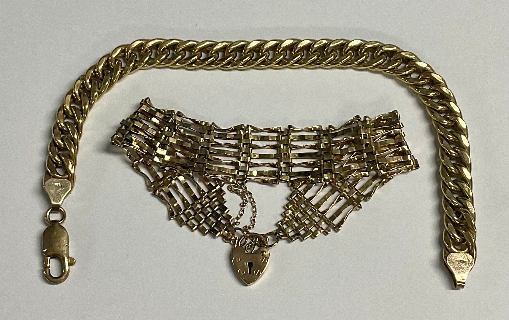 A 9ct gold curb link bracelet, marked 375, 10.4g; a 9ct gold gate link bracelet, marked 375, 7.4g (2)